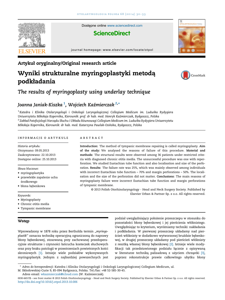 otolaryngologia polska 68 (2014) 30–33 Dostępne online www.sciencedirect.com ScienceDirect journal homepage: www.elsevier.com/locate/otpol Artykuł oryginalny/Original research article Wyniki strukturalne myringoplastyki metodą podkładania The results of myringoplasty using underlay technique Joanna Janiak-Kiszka 1, Wojciech Kaźmierczak 2,* 1 Katedra i Klinika Otolaryngologii i Onkologii Laryngologicznej Collegium Medicum im. Ludwika Rydygiera Uniwersytetu Mikołaja Kopernika, Kierownik: prof. dr hab. med. Henryk Kaźmierczak, Bydgoszcz, Polska 2 Zakład Patofizjologii Narządu Słuchu i Układu Równowagi Collegium Medicum im. Ludwika Rydygiera Uniwersytetu Mikołaja Kopernika, Kierownik: dr hab. med. Katarzyna Pawlak-Osińska, Bydgoszcz, Polska informacje o artykule abstract Historia artykułu: Introduction: The method of tympanic membrane repairing is called myringoplasty. Aim Otrzymano: 09.05.2013 of the study: We analysed the reasons of failure of this procedure. Material and Zaakceptowano: 22.10.2013 methods: The structural results were observed among 36 patients under restricted crite- Dostępne online: 25.10.2013 ria with diagnosed chronic otitis media. The unsuccessful procedure was one with reper- Słowa kluczowe: myringoplastyka ration. Results: The failure rate was 25%, which was mainly observed among individuals przewlekłe zapalenie ucha sation and the size of the perforation did not matter. Conclusions: The main reasons of foration. We studied Eustachian tube function and also localisation and size of the perfo- środkowego błona bębenkowa with incorrect Eustachian tube function – 70% and margin perforations – 50%. The localimyringoplasty failure were incorrect Eustachian tube function and margin perforations of tympanic membrane. © 2013 Polish Otorhinolaryngology - Head and Neck Surgery Society. Published by Keywords: Myringoplasty Elsevier Urban & Partner Sp. z o.o. All rights reserved. Chronic otitis media Tympanic membrane Wstęp Wprowadzony w 1878 roku przez Bertholda termin ,,myringoplastik’’ oznacza technikę operacyjną ograniczoną do naprawy błony bębenkowej, stosowaną przy zachowanej przedoperacyjnie strukturze i czynności łańcucha kosteczek słuchowych oraz przy braku patologii w przestrzeniach powietrznych kości skroniowych [1]. Istnieje wiele podziałów wykonywanych myringoplastyk. Jednym z najbardziej powszechnych jest podział uwzględniający położenie przeszczepu w stosunku do pozostałości błony bębenkowej i jej pierścienia włóknistego. Uwzględniając to kryterium, wyróżniamy techniki: nakładania i podkładania. W pierwszej przeszczep układamy nad pierścień włóknisty w dodatkowo wytworzonej bruździe bębenkowej, w drugiej przeszczep układamy pod pierścień włóknisty z resztką własnej błony bębenkowej [2]. Istnieje wiele modyfikacji tak przedstawionego podziału łącznie z opisywaną w literaturze techniką palisadową z użyciem chrząstki [3], poprzez rekonstrukcje prawie całkowitego ubytku błony * Adres do korespondencji: Katedra i Klinika Otolaryngologii i Onkologii Laryngologicznej Collegium Medicum, ul. M. Skłodowskiej-Curie 9, 85-094 Bydgoszcz, Polska. Tel./fax: +48 52-585-30-45. Adres email: [email protected] (W. Kaźmierczak). 0030-6657/$ – see front matter © 2013 Polish Otorhinolaryngology - Head and Neck Surgery Society. Published by Elsevier Urban & Partner Sp. z o.o. All rights reserved. http://dx.doi.org/10.1016/j.otpol.2013.10.006 otolaryngologia polska 68 (2014) 30–33 bębenkowej [4], aż po rekonstrukcję całkowitego ubytku błony bębenkowej [5]. Istnieją cztery opisywane przez Tosa [3] reguły prawidłowo wykonanego zabiegu myringoplastyki. Należy usunąć pozostałości nabłonka wielowarstwowego płaskiego z brzegów perforacji, nie należy pozostawiać żadnych fragmentów nabłonka pomiędzy pozostałościami błony bębenkowej i pierścienia włóknistego a przeszczepem – szczególnie jest to ważne w technice nakładania, należy odpowiednio dobrać wielkość przeszczepu, tak aby nie leżał on na skórze przewodu słuchowego zewnętrznego, a także przeszczep musi ściśle przylegać do pozostałości błony bębenkowej i pierścienia włóknistego [5]. W literaturze opisuje się różne rodzaje materiałów służących do przeszczepu. Początkowo stosowano przeszczepy skóry kanału słuchowego zewnętrznego [6], po doniesieniach Storrs z 1961 roku rozpoczęto stosowanie powięzi mięśnia skroniowego [7]. W chwili obecnej wymienia się następujące materiały oprócz powięzi mięśnia skroniowego: ochrzęstną, chrząstkę, żyłę i tkankę tłuszczową (metoda plug-in). Wyniki operacji myringoplastycznej należy oceniać w aspekcie czynnościowym i strukturalnym. Otochirurdzy za udany zabieg uważają taki, w którym doszło do wgojenia przeszczepu, a słuch uległ poprawie [8]. W dostępnej literaturze porównuje się metodę podkładania z nakładaniem, różne rodzaje zastosowanych materiałów do przeszczepu, a przede wszystkim rezerwę ślimakową przed- i pooperacyjną. Niewątpliwie ważnym efektem udanego zabiegu myringoplastyki jest prawidłowe wgojenie się przeszczepu, a także trwałość takiego stanu. Ponowne pojawienie się ubytku przy braku kontroli lekarskiej po zabiegu grozi ponownym pogorszeniem słuchu, a nawet nawrotem dolegliwości w postaci trudnych do opanowania ,,wycieków’’ z ucha. Cel pracy Celem pracy była analiza przyczyn niepowodzeń myringoplastyk, rozumianych jako obecność reperforacji błony bębenkowej, w materiale Kliniki Otolaryngologii i Onkologii Laryngologicznej z Pododdziałem Audiologii i Foniatrii Collegium Medicum im. Ludwika Rydygiera w Bydgoszczy. Materiał i metoda Na podstawie analizy historii chorób pacjentów operowanych w latach 2006–2009 wybrano 36 osób (27 mężczyzn i 9 kobiet, średnia wieku 38,1 roku) z rozpoznanym przewlekłym prostym zapaleniem ucha środkowego. Wszyscy chorzy byli przed zab