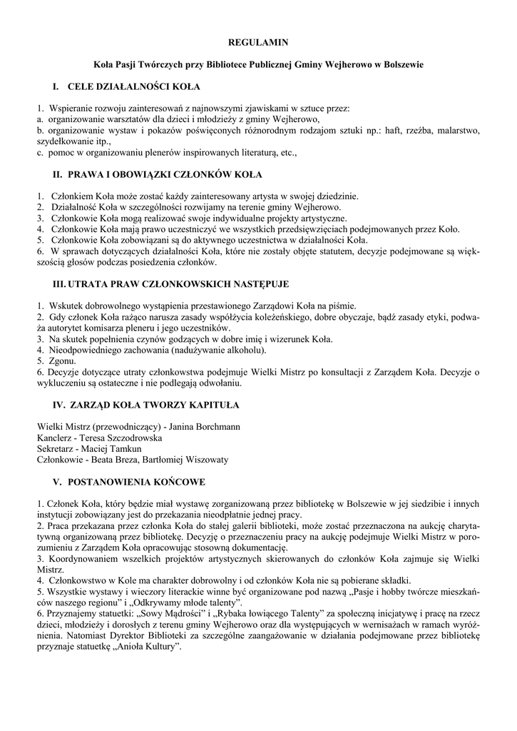 REGULAMIN Koła Pasji Twórczych przy Bibliotece Publicznej Gminy Wejherowo w Bolszewie I. CELE DZIAŁALNOŚCI KOŁA 1. Wspieranie rozwoju zainteresowań z najnowszymi zjawiskami w sztuce przez: a. organizowanie warsztatów dla dzieci i młodzieży z gminy Wejherowo, b. organizowanie wystaw i pokazów poświęconych różnorodnym rodzajom sztuki np.: haft, rzeźba, malarstwo, szydełkowanie itp., c. pomoc w organizowaniu plenerów inspirowanych literaturą, etc., II. PRAWA I OBOWIĄZKI CZŁONKÓW KOŁA 1. Członkiem Koła może zostać każdy zainteresowany artysta w swojej dziedzinie. 2. Działalność Koła w szczególności rozwijamy na terenie gminy Wejherowo. 3. Członkowie Koła mogą realizować swoje indywidualne projekty artystyczne. 4. Członkowie Koła mają prawo uczestniczyć we wszystkich przedsięwzięciach podejmowanych przez Koło. 5. Członkowie Koła zobowiązani są do aktywnego uczestnictwa w działalności Koła. 6. W sprawach dotyczących działalności Koła, które nie zostały objęte statutem, decyzje podejmowane są większością głosów podczas posiedzenia członków. III. UTRATA PRAW CZŁONKOWSKICH NASTĘPUJE 1. Wskutek dobrowolnego wystąpienia przestawionego Zarządowi Koła na piśmie. 2. Gdy członek Koła rażąco narusza zasady współżycia koleżeńskiego, dobre obyczaje, bądź zasady etyki, podważa autorytet komisarza pleneru i jego uczestników. 3. Na skutek popełnienia czynów godzących w dobre imię i wizerunek Koła. 4. Nieodpowiedniego zachowania (nadużywanie alkoholu). 5. Zgonu. 6. Decyzje dotyczące utraty członkowstwa podejmuje Wielki Mistrz po konsultacji z Zarządem Koła. Decyzje o wykluczeniu są ostateczne i nie podlegają odwołaniu. IV. ZARZĄD KOŁA TWORZY KAPITUŁA Wielki Mistrz (przewodniczący) - Janina Borchmann Kanclerz - Teresa Szczodrowska Sekretarz - Maciej Tamkun Członkowie - Beata Breza, Bartłomiej Wiszowaty V. POSTANOWIENIA KOŃCOWE 1. Członek Koła, który będzie miał wystawę zorganizowaną przez bibliotekę w Bolszewie w jej siedzibie i innych instytucji zobowiązany jest do przekazania nieodpłatnie jednej pracy. 2. Praca przekazana przez członka Koła do stałej galerii biblioteki, może zostać przeznaczona na aukcję charytatywną organizowaną przez bibliotekę. Decyzję o przeznaczeniu pracy na aukcję podejmuje Wielki Mistrz w porozumieniu z Zarządem Koła opracowując stosowną dokumentację. 3. Koordynowaniem wszelkich projektów artystycznych skierowanych do członków Koła zajmuje się Wielki Mistrz. 4. Członkowstwo w Kole ma charakter dobrowolny i od członków Koła nie są pobierane składki. 5. Wszystkie wystawy i wieczory literackie winne być organizowane pod nazwą „Pasje i hobby twórcze mieszkańców naszego regionu” i „Odkrywamy młode talenty”. 6. Przyznajemy statuetki: „Sowy Mądrości” i „Rybaka łowiącego Talenty” za społeczną inicjatywę i pracę na rzecz dzieci, młodzieży i dorosłych z terenu gminy Wejherowo oraz dla występujących w wernisażach w ramach wyróżnienia. Natomiast Dyrektor Biblioteki za szczególne zaangażowanie w działania podejmowane przez bibliotekę przyznaje statuetkę „Anioła Kultury”.