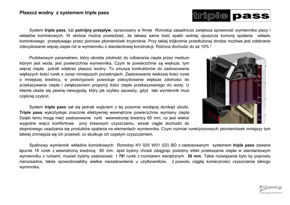 Płaszcz wodny z systemem triple pass System triple pass, lub potrójny przepływ, opracowany w firmie Romotop zasadniczo zwiększa sprawność wymiennika piecy i wkładów kominkowych. W skrócie można powiedzieć, że takasa sama ilość spalin wolniej opuszcza komorę spalania wkładu kominkowego przepływając przez pionowe płomieniówki trzykrotnie. Przy takiej trójkrotnie przedłużonej drodze możliwe jest odebranie zdecydowanie więcej ciepła niż w wymienniku o standardowej konstrukcji. Różnica dochodzi do aż 10% ! Podstwowym parametrem, który określa zdolność do odbierania ciepła przez medium którym jest woda, jest powierzchnia wymiennika. Czym te powierzchnie są większe, tym więcej ciepła potrafi odebrać płaszcz wodny. To zmusza kontruktorów do zastosowania większych ilości rurek o coraz miniejszych porzekrojach. Zastosowanie wiekszej ilości rurek o mniejszej średnicy, w protorypowni powoduje zdecydowanie większe zdolności do przekazywania ciepła i zwiększeniem proporcji ilości ciepła przekazywanego do wody. U klienta okaże się pewną niewygodą, który jak szybko zauważy, gdyż taki wymiennik musi częściej czyścić. System triple pass sał się jednak wyjściem z tej pozornie wiodącej donikąd uliczki. Triple pass wykożystuje znacznie efektywniej wewnętrzne powierzchnie wymiany ciepła Dzięki temu mogą mieć zastosowanie rurki wewnetrznej średnicy 60 mm, co jest wielce wygodne wręcz komfortowe przy kresowym czyszczeniu, wszak ciągle dochodzi do stopniowego osadzania się produktów spalania na elementach wymiennika. Czym rozmiar rurek/pionowych płomieniówek mniejszy tym łatwiej zmniejsza się ich prześwit, co skutkuje ich częstym czyszczeniem. Spalinowy wymiennik wkładów kominkowych Romotop KV 025 W01 (02) BD z zastosowanym systemem triple pass zawiera łącznie 18 rurek z wewnetrzną średnicą 60 mm. Jęsli byśmy chcieli ośiągnąc podobny efekt przekazania ciepła w standardowym wymienniku z rurkami, musieli byśmy zastosować t 70! rurek z rozmiarem wenętrznym 30 mm. Takie rozwiązanie bylo by poprostu nierozsadne, także spowodowałóby wielkie niezadowolenie u użytkowników, z powodu ciągłej konieczności czyszczenia takicgo wyminnika. Podstwowy plusy zastosowania systemu triple pass można określić tak :  Większa sprawność całkowita (aż o 10%) niż w standardowej konstrukcji = oszczędność opału  Większa sprawność płaszcza wodnego = więcej ciepła do układu c.o.  Proporcjonalnie więcej ciepła do płaszcza wodnego = lepsza regulacja i dystrybucja ciapła w domu = wyższy komfort  Niższa emisja zanieczyszczeń do atmosfery = kolejny plus w ochronie otoczającego nas środowiska naturalnego  Zoptymalizowanie średnicy rurek górnego wyminnika = Komfortowa obsługa i mniejsze nakłady czasu na czyszczenie wyminnika  Użyte w tekście określenie „standardowej konstrukcji“ odnosi się do kominka z płaszczem wodnym w ścianach oraz z rurkami/pionowymi płomieniówkami/ nad paleniskiem , wyłożonego na ścianach i podłódze szamotem  Opisana rożnica w sparwności jest jeszcze większa w stosunku do najczęściej spotykanych w Polsce prostych płaszczy wodnych