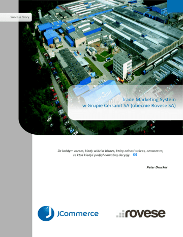Trade Marketing System w Grupie Cersanit SA (obecnie Rovese SA) Za ka¿dym razem, kiedy widzisz biznes, który odnosi sukces, oznacza to, ¿e ktoœ kiedyœ podj¹³ odwa¿n¹ decyzjê. Peter Drucker Projekt zrealizowany dla Grupy Cersanit SA obecnie znanej pod nazw¹ Rovese SA W sk³ad grupy wchodz¹ marki Cersanit oraz Opoczno. Przedmiotem podstawowej dzia³alnoœci Grupy Rovese jest produkcja i dystrybucja wyrobów wykorzystywanych do wykañczania i wyposa¿enia ³azienek. Wyzwania Dotychczas przedstawiciele handlowi firm Cersanit SA i Opoczno SA raportowali swoj¹ pracê poprzez papierowe dokumenty wype³niane w odwiedzanych punktach sprzeda¿y. Nastêpnie, dane te by³y rêcznie wprowadzane do odpowiednich formularzy, a te przesy³ane do centrali firmy. Dyrektorzy regionalni w ka¿dym tygodniu analizowali zebrane informacje i na ich podstawie tworzyli raporty dla swoich prze³o¿onych. Dodatkowym problemem dla tych firm by³ brak jednej spójnej bazy klientów. Aby usprawniæ te wszystkie p ro c e sy, efe k t y w n i e za r z ¹ d za æ p ra c ¹ przedstawicieli handlowych oraz w pe³ni zautomatyzowaæ zamawianie i weryfikacjê materia³ów marchandisingowych Cersanit SA oraz Opoczno SA zdecydowa³y siê na wdro¿enie rozwi¹zania JCommerce - Trade Marketing System (TMS). Rozwi¹zania System TMS dedykowany jest firmom, które za poœrednictwem pracowników terenowych, na du¿¹ skalê prowadz¹ dzia³ania sprzeda¿owe i marketingowe. Zbudowany jest z dwóch czêœci logicznych, z których ka¿da posiada odmienn¹ funkcjonalnoœæ i przeznaczona jest dla innych u¿ytkowników. Czêœæ centralna, dostêpna przez d o w o l n ¹ p r z e g l ¹ d a r kê i n t e r n e t o w ¹ , dedykowana jest osobom pracuj¹cym w siedzibie f irmy jako specjaliœci i menad¿erowie dzia³ów: marketingu, merchandisingu, sprzeda¿y i analiz. Pozwala na d o k ³ a d n e s p ra w d z a n i e e fe k t y w n o œ c i pracowników i szybkie dedykowanie zadañ. Natomiast czêœæ mobilna, zainstalowana na urz¹dzeniach typu Pocket PC, s³u¿y do pracy w t e re n i e i o b s ³ u g i wa n a j e s t p r ze z przedstawicieli handlowych. Udostêpnia im aktualne informacje o obs³ugiwanych punktach sprzeda¿y i o tym co musz¹ zrobiæ, ¿eby skutecznoœæ ich pracy by³a wy¿sza. TMS posiada równie¿ narzêdzia analityczne, które umo¿liwiaj¹ dyrektorom regionalnym odpowiedni dostêp do aktualnych dzia³añ podleg³ych im pracowników terenowych, a wy¿szej kadrze mened¿erskiej wgl¹d w kluczowe informacje, które s¹ przedstawione w formie przejrzystych raportów. Wymiana wszelkich danych z serwerem realizowana jest na bie¿¹co, dziêki synchronizacji. Nazwa: Rovese SA Korzyœci biznesowe Bran¿a: Produkcja i dystrybucja wyrobów do wykañczania i wyposa¿enia ³azienek Udoskonalenie pracy Wdro¿enie dok³adne dopasowanego systemu TMS pozwoli³o w pe³ni zautomatyzowaæ procesy merchandisingowe, rozwi¹zaæ problemy komunikacyjne pomiêdzy pracownikami terenowymi, a central¹ firmy oraz poddaæ szczegó³owym analizom zebrane informacje. Ponadto kadra mened¿erska oraz pracownicy znajduj¹cych siê w centrali (dzia³ marketingu, merchandisingu, sprzeda¿y i analiz) wyposa¿eni zostali w narzêdzie umo¿liwiaj¹ce definiowanie zadañ poszczególnych regionów, czy nawet pojedynczych przedstawicieli handlowych. Wielkoœæ firmy: < 7.000 pracowników G³ówna siedziba: Kielce Dostêp do informacji Stworzona jednolita baza klientów zapewni³a ws zyst k i m p ra co w n i ko m d o stê p d o najaktualniejszych danych z rynku sprzeda¿y. Oszczêdnoœæ czasu Du¿e korzyœci odnotowuj¹ równie¿ regionalni przedstawiciele handlowi. Dziêki pracy online, bezpoœrednio w punkcie sprzeda¿y oszczêdzaj¹ czas, który dotychczas musieli poœwiêcaæ na przepisywanie gromadzonych informacji i przesy³anie ich do centrali firmy. Fakty Cel wdro¿enia: automatyzacja procesów merchandisingowych rozwi¹zanie problemów komunikacyjnych miêdzy pracownikami w terenie definiowanie zadañ dla poszczególnych regionów i przedstawicieli handlowych udostêpnienie najaktualniejszych danych z rynku sprzeda¿y umo¿liwienie pracy online bezpoœrednio w punkcie sprzeda¿y Zaimplementowane technologie: NET Framework 2.0, ASP.NET, Infragistics, SQL Server 2005, .NET Compact Framework 2.0, Windows Mobile Forms, SQL Server 2005 CE Wykonawca: JCommerce SA 40-600 Katowice, ul. T. Koœciuszki 227, tel.: +48 32 201 15 32, fax: +48 32 255 36 15, [email protected], www.jcommerce.pl, www.nearshore-it.eu