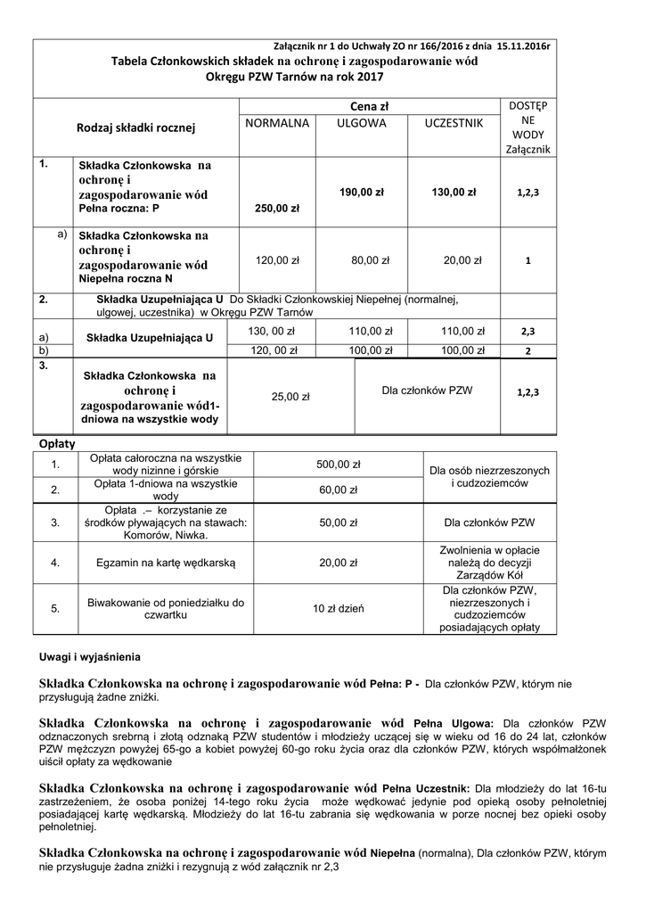 Załącznik nr 1 do Uchwały ZO nr 166/2016 z dnia 15.11.2016r Tabela Członkowskich składek na ochronę i zagospodarowanie wód Okręgu PZW Tarnów na rok 2017 NORMALNA Rodzaj składki rocznej 1. Cena zł ULGOWA UCZESTNIK DOSTĘP NE WODY Załącznik 190,00 zł 130,00 zł 1,2,3 Składka Członkowska na ochronę i zagospodarowanie wód 250,00 zł Pełna roczna: P a) Składka Członkowska na ochronę i zagospodarowanie wód 120,00 zł 80,00 zł 20,00 zł 1 Niepełna roczna N Składka Uzupełniająca U Do Składki Członkowskiej Niepełnej (normalnej, ulgowej, uczestnika) w Okręgu PZW Tarnów 2. Składka Uzupełniająca U a) b) 3. Składka Członkowska 130, 00 zł 110,00 zł 110,00 zł 2,3 120, 00 zł 100,00 zł 100,00 zł 2 na ochronę i zagospodarowanie wód1- Dla członków PZW 25,00 zł 1,2,3 dniowa na wszystkie wody Opłaty 1. 2. 3. Opłata całoroczna na wszystkie wody nizinne i górskie Opłata 1-dniowa na wszystkie wody Opłata .– korzystanie ze środków pływających na stawach: Komorów, Niwka. 500,00 zł 60,00 zł 50,00 zł 4. Egzamin na kartę wędkarską 20,00 zł 5. Biwakowanie od poniedziałku do czwartku 10 zł dzień Dla osób niezrzeszonych i cudzoziemców Dla członków PZW Zwolnienia w opłacie należą do decyzji Zarządów Kół Dla członków PZW, niezrzeszonych i cudzoziemców posiadających opłaty Uwagi i wyjaśnienia Składka Członkowska na ochronę i zagospodarowanie wód Pełna: P - Dla członków PZW, którym nie przysługują żadne zniżki. Składka Członkowska na ochronę i zagospodarowanie wód Pełna Ulgowa: Dla członków PZW odznaczonych srebrną i złotą odznaką PZW studentów i młodzieży uczącej się w wieku od 16 do 24 lat, członków PZW mężczyzn powyżej 65-go a kobiet powyżej 60-go roku życia oraz dla członków PZW, których współmałżonek uiścił opłaty za wędkowanie Składka Członkowska na ochronę i zagospodarowanie wód Pełna Uczestnik: Dla młodzieży do lat 16-tu zastrzeżeniem, że osoba poniżej 14-tego roku życia może wędkować jedynie pod opieką osoby pełnoletniej posiadającej kartę wędkarską. Młodzieży do lat 16-tu zabrania się wędkowania w porze nocnej bez opieki osoby pełnoletniej. Składka Członkowska na ochronę i zagospodarowanie wód Niepełna (normalna), Dla członków PZW, którym nie przysługuje żadna zniżki i rezygnują z wód załącznik nr 2,3 Składka Członkowska na ochronę i zagospodarowanie wód Niepełna (ulgowa) składka dla członków PZW odznaczonych srebrną i złotą odznaką PZW, studentów i młodzieży uczącej się w wieku od 16 do 24 lat członków PZW mężczyzn powyżej 65-go a kobiet powyżej 60-go roku życia oraz dla członków PZW, których współmałżonek uiścił opłaty za wędkowanie i rezygnują z wód załącznik nr 2,3 Składka Członkowska na ochronę i zagospodarowanie wód Niepełna (uczestnika) - dla młodzieży do lat 16tu zastrzeżeniem, że osoba poniżej 14-tego roku życia może wędkować jedynie pod opieką osoby pełnoletniej posiadającej kartę wędkarską. Młodzieży do lat 16-tu zabrania się wędkowania w porze nocnej bez opieki osoby pełnoletniej i rezygnują z wód załącznik nr 2,3. Składki Uzupełniające U Do Składki Członkowskiej Niepełnej (normalnej, ulgowej, uczestnika) w Okręgu PZW Tarnów dla Członków, którzy zamierzają skorzystać z większej ilości wód tj. (Niwka, Trzydniaki, Trzydniaki S1, Trzydniaki S2 złów i wypuść , Kantoria, Komorów, Kłaj + Starorzecze rzeki Raby numer 5 północna cześć względem autostrady.) Szczegółowe wyjaśnienia dot. ulg i zwolnień w opłacie składek oraz o sposobie ich uiszczenia: 1. Honorowi członkowie PZW oraz odznaczeni złotą z wieńcami odznaką PZW są zwolnieni ze składek członkowskich pełnych na zagospodarowanie i ochronę wód. Obowiązuje wpis do legitymacji członkowskiej na podstawie legitymacji odznaki PZW. 2. Członkowie odznaczeni srebrną i złotą odznaką PZW płacą ulgową składkę członkowską pełną (na potrzeby finansowania zadań organizacyjnych i sportu wędkarskiego oraz na potrzeby zagospodarowania i ochrony wód). 3. Składki okresowe nie są objęte ulgami. 4. Wykupienie składki uzupełniającej na stawy (Trzydniaki, Trzydniaki S1, Trzydniaki S2 złów i wypuść, Kłaj + Starorzecze Rz. Raby, Kantoria, Komorów i Niwka) jest możliwe, jedynie po opłaceniu składki okręgowej NIEPEŁNEJ N PZW Tarnów („rzeki, potoki, zbiornik zaporowy Czchów i stawy Bobrowniki Wielkie, Olszyny ”). Załącznik 1 wykaz wód: Wszystkie rzeki, potoki i zb. Czchów, Bobrowniki Wielkie i Olszyny Załącznik 2 wykaz wód: stawy pożwirowe (Niwka, Trzydniaki, Trzydniaki S1, Kantoria, Komorów, Kłaj + Starorzecze rzeki Raby północna część względem autostrady ) Załącznik 3 wykaz wód: Trzydniaki S2 złów i wypuść