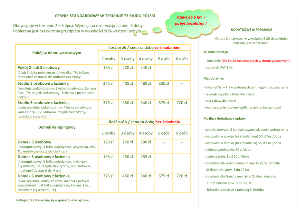 CENNIK STANDARDOWY W TERMINIE 72 RAJDU POLSKI Dzieci do 5 lat pobyt bezpłatny ! Obowiązuje w terminie 2 – 5 lipca. Wymagana rezerwacja na min. 3 doby. Pobierana jest bezzwrotna przedpłata w wysokości 50% wartości pobytu. DODATKOWE INFORMACJE Opłata klimatyczna w wysokości 2,20 zł/os./doba należna jest dodatkowo. Ilość osób / cena za dobę ze śniadaniem W cenie noclegu: Pokój w domu wczasowym 2 osoby Pokój 2- lub 3 osobowy 165 zł 3 osoby 4 osoby 220 zł 240 zł 5 osób 6 osób -- -- (2 lub 3 łóżka pojedyncze, umywalka, TV, balkon, możliwość dostawki dla dodatkowej osoby) Studio 5 osobowe z łazienką 345 zł 405 zł 480 zł 600 zł -- 375 zł 450 zł 540 zł 675 zł 720 zł Możliwe dodatkowe opłaty: Domek kempingowy 2 osoby 120 zł 3 osoby 4 osoby 150 zł 180 zł 5 osób 6 osób -- -- (jednopokojowy, 3 łóżka pojedyncze, umywalka, WC, TV, możliwość dostawki dla 4 os.) (dwie sypialnie, pokój dzienny, kuchnia z pełnym wyposażeniem, 4 łóżka pojedyncze, kanapa 2 os., łazienka z prysznicem, TV) Pokoje oraz domki nie są wyposażone w ręczniki. - dziecko powyżej 5 lat traktowane jak osoba pełnopłatna - dostawka w pokoju (ze śniadaniem) 50 zł /os./doba - dostawka w domku (bez śniadania) 35 zł / os./doba - miejsce parkingowe 20 zł/doba 195 zł 250 zł 285 zł -- -- (jednopokojowy, 3 łóżka pojedyncze, łazienka z prysznicem, TV, czajnik elektryczny, mini lodówka, możliwość dostawki dla 4 os.) Domek 6 osobowy z łazienką - sala zabaw dla dzieci - wypożyczenie leżaków, grilla (w miarę dostępności) Ilość osób / cena za dobę bez śniadania Domek 3 osobowy z łazienką - Internet WI – FI (w wybranych pom. ogólnodostępnych) - zewnętrzny plac zabaw dla dzieci (dwie sypialnie, pokój dzienny, 4 łóżka pojedyncze, kanapa 2 os., TV, lodówka, czajnik elektryczny, łazienka z prysznicem) Domek 3 osobowy - podatek VAT 8 %. Nieodpłatnie: (sypialnia, pokój dzienny, 3 łóżka pojedyncze, kanapa 2 os., TV, czajnik elektryczny, łazienka z prysznicem, balkon) Studio 6 osobowe z łazienką - śniadanie (dla Gości mieszkających w domu wczasowym) - zwierzę (pies, kot) 10 zł/doba - śniadanie dla Gości Leśnej Polany 15 zł/os. dorosła, 10 zł/dziecko pow. 5 do 12 lat 375 zł 450 zł 540 zł 675 zł 720 zł - śniadanie dla Gości z zewnątrz 20 zł/os. dorosła, 15 zł/ dziecko pow. 5 do 12 lat - łóżeczko dziecięce z pościelą 5 zł/doba