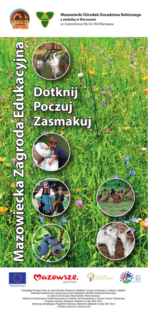 Mazowiecki Ośrodek Doradztwa Rolniczego Mazowiecka Zagroda Edukacyjna z siedzibą w Warszawie ul. Czereśniowa 98, 02-456 Warszawa Dotknij Poczuj Zasmakuj Mazowieckie Sioło Julianówka 1 Mazowieckie Sioło Julianówka Mariola Kowalska Julianówka 14, 05 – 332 Siennica Tel: 603 070 787 [email protected] www.julianowka.com.pl Mazowieckie Sioło Julianówka to miejsce plenerowe zlokalizowane na terenie Mińskiego Obszaru Chronionego Krajobrazu tylko 6 km od Mińska Mazowieckiego, ok. 50 km na wschód od Warszawy. Obiekt jest zlokalizowany na polanie otoczonej lasami, na skraju maleńkiej wioski. Jest to miejsce ciche i bezpieczne dla dzieci - z dala od ruchu drogowego. Ogrodzenie terenu zwiększa stopień bezpieczeństwa uczestników organizowanych tu imprez. Mazowieckie Sioło Julianówka jest obiektem turystki wiejskiej nastawionym na organizacje pobytów, imprez, warsztatów edukacyjnych, szkoleń i wypoczynku - nie jest to działalność dodatkowa lecz wiodąca. Julianówka została wpisana na listę HITÓW TURYSTYKI WIEJSKIEJ Ministerstwa Rolnictwa i Rozwoju Wsi. Tworzymy Julianówkę już od kilku lat z myślą o tym, aby zapewnić naszym gościom wspaniały relaks i wypoczynek w miłej atmosferze leśnych ostępów, wplatając dodatkowo w programy pobytu elementy mazowieckiego folkloru, kultury i tradycji. Dla dzieci i młodzieży oferujemy warsztaty edukacyjne. Do dyspozycji mamy: 1. Zaplecze noclegowe w drewnianych domkach z pełnym węzłem sanitarnym - 24 miejsca; 2. B iesiadną Polanę, a na niej grilowisko z zapleczem kuchennym oraz altany wyposażone w stoły i ławy; 3. Wielofunkcyjną stodołę Babci Julci w klimacie mini skansenu; 4. Mini zoo (koń, kucyk, kozy, króliki); 5. Miejsce na ognisko; 6. Plac zabaw dla dzieci; 7. Stół do tenisa stołowego; 8. Boisko do siatkówki; 9. Sportowy sprzęt łuczniczy. Programy edukacyjne realizowane w gospodarstwie: 1. Od mleczka do serka i masełka 2. Wio koniku 3. Mazowieckie wyplatanki Gajówka „Prochowy Młynek” 2 Gajówka „Prochowy Młynek” Dariusz Łuczak Bartniki ,ul. Miedniewicka 8 96-332 Radziwiłłów Tel: 501 413 606 [email protected] www.gajowka.org.pl Doskonała lokalizacja naszego gospodarstwa, w centrum Puszczy Bolimowskiej, z dala od miejskiego gwaru, zapewnia świetną zabawę i niezapomniane wrażenia. W gospodarstwie naszym prowadzone są zajęcia w oparciu o zasoby przyrody takie jak: las, rozlewiska rzeczne, leśne łąki oraz materiały dydaktyczne. Nasza oferta skierowana jest do grup zorganizowanych (od przedszkola do seniora) oraz osób indywidualnych. Dużą atrakcją są zajęcia edukacyjne przy naturalnych ekspozycjach, takich jak: drzewa, budki lęgowe, mrowiska, nory i dziuple. Bliskość natury i świeże powietrze zachęcają do spacerów po ścieżkach leśnych i wycieczek rowerowych. W swojej zagrodzie chcemy pokazać jak z uzyskanych płodów rolnych można wykonać przetwory na okres zimowy. Programy edukacyjne realizowane w gospodarstwie: 1. Przyroda – magia lasu 2. Zwierzęta leśne – rozpoznawanie ich tropów 3. Zegar ptasiego śpiewu 4. P rzetwarzanie warzyw w gospodarstwie – kiszenie kapusty 5. P rzetwarzanie warzyw w gospodarstwie – kiszenie ogórków 6. Suszenie jabłek i innych owoców „Jabłonka” 3 „Jabłonka” Barbara i Marek Jabłońscy Czersk, ul. Warszawska 3 wejście od ul.Wąskiej 05-530 Góra Kalwaria Tel.: 603 403 875; 22 727 34 38 e-mail:[email protected] www.jablonka.com.pl Zapraszamy do Gospodarstwa Agroturystycznego Jabłonka w Czersku. Czersk jest zabytkową wsią położoną na wysokiej skarpie wiślanej. Kilkaset metrów od gospodarstwa znajdują się ruiny Zamku Książąt Mazowieckich. Na jego terenie odbywają się ”żywe” lekcje historii i inne zajęcia plenerowe. U podnóża skarpy jest Jezioro Czerskie objęte ochroną. W obiekcie do dyspozycji gości jest ”Piwnica pod smokiem” z salą kominkową, salą do zabaw, dwoma salami edukacyjno-wystawowymi. Współpracujemy z Ośrodkiem Kultury w Górze Kalwarii, Towarzystwem Opieki nad Zabytkami oddziałem w Czersku, wytwórcami rękodzieła ludowego, starego rzemiosła, kolekcjonerami zabytkowych pojazdów i zabawek. Organizujemy spacery do sadu, w którym gospodarz dzieli się wiedzą o produkcji owoców np. jabłek, gruszek, śliwek, czereśni, wiśni czy wędrówki nad Jeziorem Czerskim czy Wisłą. Daje to możliwość obserwowania zwierząt (w szczególności licznych gatunków ptaków) w ich naturalnym środowisku. Jest to obszar chroniony programem Natura 2000. Programy edukacyjne realizowane w gospodarstwie: 1. Pory roku w sadzie 2. Rękodzieło ludowe 3. Interaktywne wykłady na temat historii Polski „Zaczarowane Miejsce” 4 „Zaczarowane Miejsce” Anna Litwin Bartniki ul. Łąkowa 19 96-331 Radziwiłłów Tel.: 500 258 083 e-mail [email protected] „Zaczarowane Miejsce” – Zagroda Edukacyjna, znajdująca się na terenie dawnej Puszczy Bolimowskiej (pomiędzy Warszawą i Łodzią) swoją działalność edukacyjną opiera głównie na zasobach lokalnego dziedzictwa kulturowego, historycznego i przyrodniczego. Organizowane są tu szerokoformatowe szkolenia z zakresu ogrodnictwa permakulturowego, oraz ogólno-rozwojowe warsztaty z zakresu tzw. Twardej Ścieżki. Zagroda położona jest na niezwykle pięknym przyrodniczo i czystym ekologicznie terenie, który znajduje się pomiędzy dwoma obszarami Natura 2000 - „Dolina Rawki” oraz „Dolina Grabinki” - granicząc z rzeką Rawką, zwyciężczynią ogólnopolskiego konkursu na Rzekę Roku 2014. W Zaczarowanym Miejscu dostępna jest oferta edukacyjno-rekreacyjna dla grup zorganizowanych 10-50 osobowych, w wieku od 5 do 105 lat. Gospodarstwo składa się z trzech głównych części o rożnych charakterach i zastosowaniach - i są to: 1. Zagroda Budnika, gdzie pokazywane jest „prawdziwe” życie pierwszych osadników na terenach dawnych Puszcz Wiskickiej, Jaktorowskiej i Bolimowskiej (XV w.). 2. Osada Rodzian - replika n