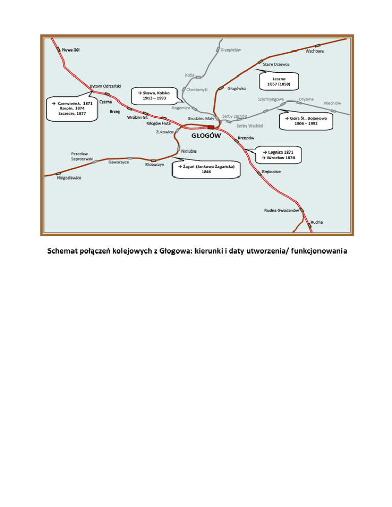 Nowa Sól Krzepielów Wschowa Stare Drzewce Kotla Bytom Odrzański → Czerwieńsk, 1871 Rzepin, 1874 Szczecin, 1877 Chociemyśl → Sława, Kolsko 1913 – 1993 Czerna Szlichtyngowa Dryżyna Niechlów Bogomice Brzeg Wróblin Gł. Głogów Huta Żukowice Przecław Szprotawski Leszno 1857 (1858) Głogówko Grodziec Mały Serby Zachód GŁOGÓW Nielubia Gaworzyce Kłobuczyn → Góra Śl., Bojanowo 1906 – 1992 Serby Wschód → Żagań (Jankowa Żagańska) 1846 Krzepów → Legnica 1871 → Wrocław 1874 Grębocice Niegosławice Rudna Gwizdanów Rudna Schemat połączeń kolejowych z Głogowa: kierunki i daty utworzenia/ funkcjonowania
