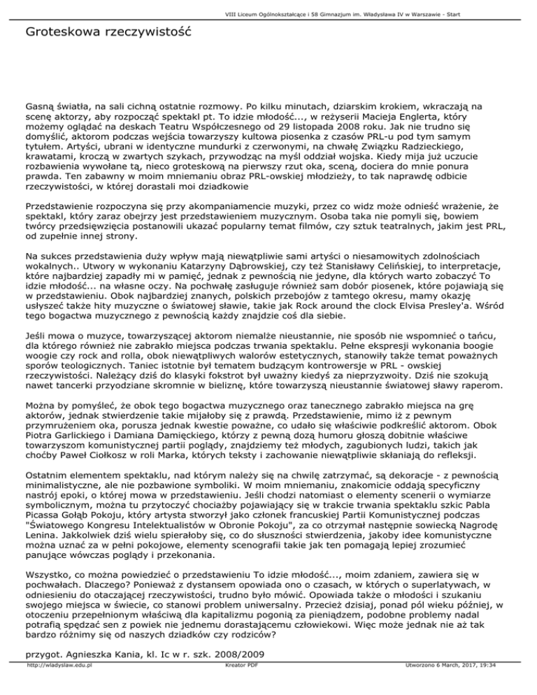 VIII Liceum Ogólnokształcące i 58 Gimnazjum im. Władysława IV w Warszawie - Start Groteskowa rzeczywistość Gasną światła, na sali cichną ostatnie rozmowy. Po kilku minutach, dziarskim krokiem, wkraczają na scenę aktorzy, aby rozpocząć spektakl pt. To idzie młodość..., w reżyserii Macieja Englerta, który możemy oglądać na deskach Teatru Współczesnego od 29 listopada 2008 roku. Jak nie trudno się domyślić, aktorom podczas wejścia towarzyszy kultowa piosenka z czasów PRL-u pod tym samym tytułem. Artyści, ubrani w identyczne mundurki z czerwonymi, na chwałę Związku Radzieckiego, krawatami, kroczą w zwartych szykach, przywodząc na myśl oddział wojska. Kiedy mija już uczucie rozbawienia wywołane tą, nieco groteskową na pierwszy rzut oka, sceną, dociera do mnie ponura prawda. Ten zabawny w moim mniemaniu obraz PRL-owskiej młodzieży, to tak naprawdę odbicie rzeczywistości, w której dorastali moi dziadkowie Przedstawienie rozpoczyna się przy akompaniamencie muzyki, przez co widz może odnieść wrażenie, że spektakl, który zaraz obejrzy jest przedstawieniem muzycznym. Osoba taka nie pomyli się, bowiem twórcy przedsięwzięcia postanowili ukazać popularny temat filmów, czy sztuk teatralnych, jakim jest PRL, od zupełnie innej strony. Na sukces przedstawienia duży wpływ mają niewątpliwie sami artyści o niesamowitych zdolnościach wokalnych.. Utwory w wykonaniu Katarzyny Dąbrowskiej, czy też Stanisławy Celińskiej, to interpretacje, które najbardziej zapadły mi w pamięć, jednak z pewnością nie jedyne, dla których warto zobaczyć To idzie młodość... na własne oczy. Na pochwałę zasługuje również sam dobór piosenek, które pojawiają się w przedstawieniu. Obok najbardziej znanych, polskich przebojów z tamtego okresu, mamy okazję usłyszeć także hity muzyczne o światowej sławie, takie jak Rock around the clock Elvisa Presley'a. Wśród tego bogactwa muzycznego z pewnością każdy znajdzie coś dla siebie. Jeśli mowa o muzyce, towarzyszącej aktorom niemalże nieustannie, nie sposób nie wspomnieć o tańcu, dla którego również nie zabrakło miejsca podczas trwania spektaklu. Pełne ekspresji wykonania boogie woogie czy rock and rolla, obok niewątpliwych walorów estetycznych, stanowiły także temat poważnych sporów teologicznych. Taniec istotnie był tematem budzącym kontrowersje w PRL - owskiej rzeczywistości. Należący dziś do klasyki fokstrot był uważny kiedyś za nieprzyzwoity. Dziś nie szokują nawet tancerki przyodziane skromnie w bieliznę, które towarzyszą nieustannie światowej sławy raperom. Można by pomyśleć, że obok tego bogactwa muzycznego oraz tanecznego zabrakło miejsca na grę aktorów, jednak stwierdzenie takie mijałoby się z prawdą. Przedstawienie, mimo iż z pewnym przymrużeniem oka, porusza jednak kwestie poważne, co udało się właściwie podkreślić aktorom. Obok Piotra Garlickiego i Damiana Damięckiego, którzy z pewną dozą humoru głoszą dobitnie właściwe towarzyszom komunistycznej partii poglądy, znajdziemy też młodych, zagubionych ludzi, takich jak choćby Paweł Ciołkosz w roli Marka, których teksty i zachowanie niewątpliwie skłaniają do refleksji. Ostatnim elementem spektaklu, nad którym należy się na chwilę zatrzymać, są dekoracje - z pewnością minimalistyczne, ale nie pozbawione symboliki. W moim mniemaniu, znakomicie oddają specyficzny nastrój epoki, o której mowa w przedstawieniu. Jeśli chodzi natomiast o elementy scenerii o wymiarze symbolicznym, można tu przytoczyć chociażby pojawiający się w trakcie trwania spektaklu szkic Pabla Picassa Gołąb Pokoju, który artysta stworzył jako członek francuskiej Partii Komunistycznej podczas "Światowego Kongresu Intelektualistów w Obronie Pokoju", za co otrzymał następnie sowiecką Nagrodę Lenina. Jakkolwiek dziś wielu spierałoby się, co do słuszności stwierdzenia, jakoby idee komunistyczne można uznać za w pełni pokojowe, elementy scenografii takie jak ten pomagają lepiej zrozumieć panujące wówczas poglądy i przekonania. Wszystko, co można powiedzieć o przedstawieniu To idzie młodość..., moim zdaniem, zawiera się w pochwałach. Dlaczego? Ponieważ z dystansem opowiada ono o czasach, w których o superlatywach, w odniesieniu do otaczającej rzeczywistości, trudno było mówić. Opowiada także o młodości i szukaniu swojego miejsca w świecie, co stanowi problem uniwersalny. Przecież dzisiaj, ponad pól wieku później, w otoczeniu przepełnionym właściwą dla kapitalizmu pogonią za pieniądzem, podobne problemy nadal potrafią spędzać sen z powiek nie jednemu dorastającemu człowiekowi. Więc może jednak nie aż tak bardzo różnimy się od naszych dziadków czy rodziców? przygot. Agnieszka Kania, kl. Ic w r. szk. 2008/2009 http://wladyslaw.edu.pl Kreator PDF Utworzono 6 March, 2017, 19:34 VIII Liceum Ogólnokształcące i 58 Gimnazjum im. Władysława IV w Warszawie - Start http://wladyslaw.edu.pl Kreator PDF Utworzono 6 March, 2017, 19:34