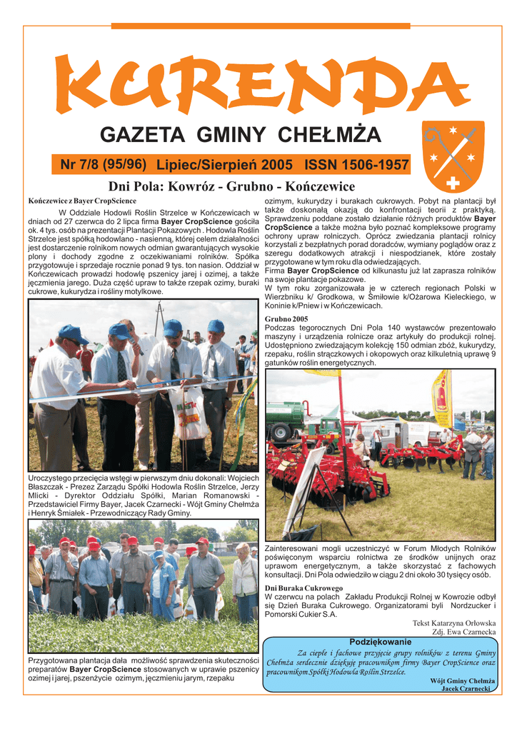 GAZETA GMINY CHEŁMŻA Nr 7/8 (95/96) Lipiec/Sierpień 2005 ISSN 1506-1957 Dni Pola: Kowróz - Grubno - Kończewice Kończewice z Bayer CropScience W Oddziale Hodowli Roślin Strzelce w Kończewicach w dniach od 27 czerwca do 2 lipca firma Bayer CropScience gościła ok. 4 tys. osób na prezentacji Plantacji Pokazowych . Hodowla Roślin Strzelce jest spółką hodowlano - nasienną, której celem działalności jest dostarczenie rolnikom nowych odmian gwarantujących wysokie plony i dochody zgodne z oczekiwaniami rolników. Spółka przygotowuje i sprzedaje rocznie ponad 9 tys. ton nasion. Oddział w Kończewicach prowadzi hodowlę pszenicy jarej i ozimej, a także jęczmienia jarego. Duża część upraw to także rzepak ozimy, buraki cukrowe, kukurydza i rośliny motylkowe. ozimym, kukurydzy i burakach cukrowych. Pobyt na plantacji był także doskonałą okazją do konfrontacji teorii z praktyką. Sprawdzeniu poddane zostało działanie różnych produktów Bayer CropScience a także można było poznać kompleksowe programy ochrony upraw rolniczych. Oprócz zwiedzania plantacji rolnicy korzystali z bezpłatnych porad doradców, wymiany poglądów oraz z szeregu dodatkowych atrakcji i niespodzianek, które zostały przygotowane w tym roku dla odwiedzających. Firma Bayer CropScience od kilkunastu już lat zaprasza rolników na swoje plantacje pokazowe. W tym roku zorganizowała je w czterech regionach Polski w Wierzbniku k/ Grodkowa, w Śmiłowie k/Ożarowa Kieleckiego, w Koninie k/Pniew i w Kończewicach. Grubno 2005 Podczas tegorocznych Dni Pola 140 wystawców prezentowało maszyny i urządzenia rolnicze oraz artykuły do produkcji rolnej. Udostępniono zwiedzającym kolekcję 150 odmian zbóż, kukurydzy, rzepaku, roślin strączkowych i okopowych oraz kilkuletnią uprawę 9 gatunków roślin energetycznych. Uroczystego przecięcia wstęgi w pierwszym dniu dokonali: Wojciech Błaszczak - Prezez Zarządu Spółki Hodowla Roślin Strzelce, Jerzy Mlicki - Dyrektor Oddziału Spółki, Marian Romanowski Przedstawiciel Firmy Bayer, Jacek Czarnecki - Wójt Gminy Chełmża i Henryk Śmiałek - Przewodniczący Rady Gminy. Zainteresowani mogli uczestniczyć w Forum Młodych Rolników poświęconym wsparciu rolnictwa ze środków unijnych oraz uprawom energetycznym, a także skorzystać z fachowych konsultacji. Dni Pola odwiedziło w ciągu 2 dni około 30 tysięcy osób. Dni Buraka Cukrowego W czerwcu na polach Zakładu Produkcji Rolnej w Kowrozie odbył się Dzień Buraka Cukrowego. Organizatorami byli Nordzucker i Pomorski Cukier S.A. Tekst Katarzyna Orłowska Zdj. Ewa Czarnecka Przygotowana plantacja dała możliwość sprawdzenia skuteczności preparatów Bayer CropScience stosowanych w uprawie pszenicy ozimej i jarej, pszenżycie ozimym, jęczmieniu jarym, rzepaku Serwis informacyjny z Urzędu Gminy Informacje z pracy Wójta Informacja z pracy Wójta i Urzędu Gminy w okresie od 1 maja do 15 czerwca br Konferencja prasowa u Prezydenta Miasta Torunia I. Przetargi 1. Ocieplenie sali gimnastycznej w Głuchowie. Ilość złożonych ofert 5. Najkorzystniejsza ofertę złożyła firma „Izobud Garden” ze Świecia na łączna kwotę 103.475,95 zł. 2. Ocieplenie sali gimnastycznej w Pluskowęsach.Ilość złożonych ofert 5. Najkorzystniejsza ofertę złożyła firma „Izobud Garden” ze Świecia na łączna kwotę 92.568,89 zł. 3. Dostawa sprzętu do konserwacji i utrzymania terenów zielonych. Przetarg obejmował 4 części tj. dostawę kosiarki wysięgnikowej, kosiarki samojezdnej, przyczepki transportowej oraz wykaszarki plecakowej. W postępowaniu wpłynęła tylko 1 oferta ( na część nr 1 kosiarka wysięgnikowa) złożona przez firmę „Ozamet” z Olsztyna na kwotę 24.644,00 zł. 4. Remont 2 autobusów szkolnych. Ilość złożonych ofert 3. Najkorzystniejsza ofertę złożyła firma „Polo” Przedsiębiorstwo Handlowo-Usługowe z Ciechocinka na łączna kwotę 147.864,00 zł. II. Inwestycje i remonty 1. Sale gimnastyczne zakres prowadzonych prac: a) Głuchowo wykonanie ławy fundamentowej i fundamentów pod zaplecze sali gimnastycznej (łącznik ) - wykonanie ocieplenia wraz z elewacją obiektu sali gimnastycznej, b) Pluskowęsy roboty murarskie ( ściany łącznika) - wykonanie ocieplenia wraz z elewacją obiektu sali gimnastycznej. 2. Świetlice wiejskie a) zakończono remont świetlicy wiejskiej w Grzegorzu (wymiana instalacji elektrycznej, płytkowanie posadzki, cyklinowanie i malowanie parkietu, prace wykończeniowe i malarskie, wykonanie elewacji zewnętrznej i malowanie), b) wykonano prace malarskie w świetlicy wiejskiej w Dziemianach, remont schodów oraz chodnik. 3. Mieszkania komunalne zakres prowadzonych prac a) prace budowlano wykończeniowe związane z dostosowaniem 4 pomieszczeń do funkcji mieszkalnej (były hotel w Kończewicach) b) wykonanie ocieplenia i elewacji budynku w Kończewicach. 4. Budowa chodników realizowano prace w miejscowościach Głuchowo ( ok. 130 m2) oraz Morczyny. 5. Pozostałe roboty a) utworzenie placów zabaw w miejscowościach : Bocień, Dźwierzno, Morczyny, Nowa Chełmża, Zalesie. b) budowa grilla w m-ci Głuchowo c) przygotowanie terenów w Zalesiu do sezonu letniego. III. Rolnictwo i ochrona środowiska 1. Przeprowadzono zabiegi szczepienia psów przeciwko wściekliźnie. Łącznie zaszczepiono 1.400 psów. Koszt jednego zabiegu wyniósł 15 zł w tym 3 zł dopłata z budżetu Gminy. 2. Zakończono realizację projektu „Wiejskie ogrody”. Celem projektu była poprawa estetyki w centrach wsi poprzez uporządkowanie terenów zielonych i nasadzenia kwiatów. Projekt realizowano we wsiach: Zelgno, Dźwierzno, Kuczwały, Grzegorz, Kończewice, Głuchowo, Nawra. 3. Uporządkowano teren starego cmentarza w miejscowości Skąpe (porządkowanie terenu, karczowanie zarośli, wykonanie drogi dojazdowej). 4. W m-cach maj i czerwiec rozpoczęto przeprowadzanie kontroli w zakresie: a) realizacji obowiązku ubezpieczenia gruntów oraz budy
