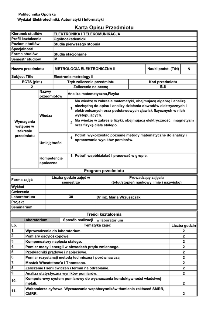 Politechnika Opolska Wydział Elektrotechniki, Automatyki i Informatyki Karta Opisu Przedmiotu Kierunek studiów Profil kształcenia Poziom studiów Specjalność Forma studiów Semestr studiów ELEKTRONIKA I TELEKOMUNIKACJA Ogólnoakademicki Studia pierwszego stopnia Nazwa przedmiotu METROLOGIA ELEKTRONICZNA II Studia stacjonarne IV Nauki podst. (T/N) N Subject Title Electronic metrology II ECTS (pkt.) Tryb zaliczenia przedmiotu Kod przedmiotu B.6 2 Zaliczenie na ocenę Nazwy Analiza matematyczna,Fizyka przedmiotów Ma wiedzę w zakresie matematyki, obejmujacą algebrę i analizę niezbędną do opisu i analizy działania obwodów elektrycznych i 1. elektronicznych oraz podstawowych zjawisk fizycznych w nich występujących. Wiedza Ma wiedzę w zakresie fizyki, obejmujacą elektryczność i magnetyzm Wymagania 2. oraz fizykę ciała stałego. wstępne w zakresie przedmiotu 1. Umiejętności Kompetencje społeczne Potrafi wykorzystać poznane metody matematyczne do analizy i opracowania wyników pomiarów. 1. Potrafi współdziałać i pracować w grupie. Program przedmiotu Forma zajęć Wykład Ćwiczenia Laboratorium Projekt Seminarium Liczba godzin zajęć w semestrze 30 Prowadzący zajęcia (tytuł/stopień naukowy, imię i nazwisko) Dr inż. Maria Wrzuszczak Treści kształcenia Laboratorium Lp. 1. 2. 3. 4. 5. 6. 7. 8. 9. 10. 11. Sposób realizacji w laboratorium Tematyka zajęć Wprowadzenie do laboratorium. Pomiary oscyloskopowe. Kompensatory napięcia stałego. Pomiar mocy i energii w obwodach prądu zmiennego. Przekładniki prądowe i napięciowe. Pomiar rezystancji metodą techniczną i porównawczą. Mostek Wheatstone'a i Thomsona. Zaliczenie I serii ćwiczeń i termin na odrabianie. Analiza statystyczna wyników pomiarów. Komputerowy system pomiarowy do wyznaczania konduktywności właściwej metali. Woltomierze cyfrowe. Wyznaczanie współczynników tłumienia zakłóceń SMRR, CMRR. Liczba godzin 2 2 2 2 2 2 2 2 2 2 2 12. Analiza Fouriera sygnałów okresowych. Pomiar wartości skutecznej napięć odkształconych, wyznaczanie współczynnika zniekształceń nieliniowych. Przetworniki cyfrowo-analogowe. Charakterystyka statyczna i pomiar parametrów dynamicznych. Przetworniki a/c z kompensacją równomierną i wagową, charakterystyka 14. statyczna, błędy przetwarzania. Zaliczenie II serii i termin na odrabianie. 15. Liczba godzin zajęć w semestrze Analiza wyników, sprawdzian pisemny Sposoby sprawdzenia zamierzonych efektów kształcenia 13. 2 2 2 2 30 Ma podstawową wiedzę w zakresie metrologii, zna i rozumie 1. metody pomiaru podstawowych wielkości elektrycznych i magnetycznych (L). Wiedza Efekty kształcenia dla przedmiotu - po zakończonym cyklu kształcenia Umiejętności 2. Zna metody obliczeniowe i narzędzia informatyczne niezbędne do analizy wyników eksperymentu (L). Potrafi mierzyć podstawowe wielkości elektryczne i 1. magnetyczne stosując jednostki miar układu SI oraz wzorce wielkości mierzalnych (L). Potrafi opracować wyniki pomiarów,ocenić błędy i 2. niepewności pomiaru, posługiwać się standardowymi przyrządami pomiarowymi analogowymi i cyfrowymi (L). Potrafi opracować dokumentację dotyczacą realizacji zadania 3. inżynierskiego i przygotować tekst zawierajacy omówienie wyników realizacji tego zadania (L). Kompetencje społeczne Ma świadomość odpowiedzialności za pracę własną oraz gotowość podporządkowania się zasadom pracy w zespole i 1. ponoszenia odpowiedzialności za wspólnie realizowane zadania (L). Ma świadomość odpowiedzialności za pracę własną oraz gotowość podporządkowania się zasadom pracy w zespole i 2. ponoszenia odpowiedzialności za wspólnie realizowane zadania (L). Metody dydaktyczne: Ćwiczenia laboratoryjne realizowane są w grupach 2 osobowych Forma i warunki zaliczenia przedmiotu: Odrobienie wszystkich ćwiczeń i zaliczenie sprawozdań na ocenę pozytywną. Zaliczenie sprawdzianu pisemnego. Literatura podstawowa: [1] SKUBIS T.: Opracowanie wyników pomiarów, przykłady. Wyd. Politechniki Śląskiej Gliwice 2003 [2] TUMAŃSKI S.: Technika pomiarowa, WNT Warszawa 2007 [3] PIOTROWSKI J.: Podstawy miernictwa, WNT, Warszawa 2002 [4] CHWALEBA A., PONIŃSKI M., SIEDLECKI A.: Metrologia elektryczna, WNT, Warszawa 2003 [5] PIOTROWSKI J., KOSTYRKO K.: Wzorcowanie aparatury pomiarowej, PWN, Warszawa 2000 [6] WINIECKI W.: Organizacja komputerowych systemów pomiarowych, Oficyna Wydawnicza Politechniki Warszawskiej, Warszawa 1997. Literatura uzupełniająca: [1] WRZUSZCZAK M., SZYMAŃSKI A.: Metrologia elektryczna i elektroniczna, skrypt nr 286, Politechnika Opolska, Opole 2009. [2] NAWROCKI W: Sensory i systemy pomiarowe. Wyd. Politechniki Poznańskiej, Poznań 2001. ______________ * niewłaściwe przekreślić ………………………………………………….. ………………………………………………………. (kierownik jednostki organizacyjnej/bezpośredni przełożony: (Dziekan Wydziału pieczęć/podpis pieczęć/podpis)
