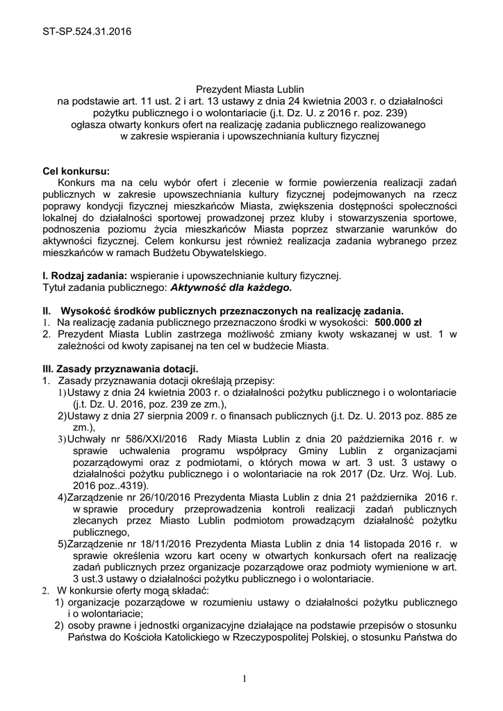 ST-SP.524.31.2016 Prezydent Miasta Lublin na podstawie art. 11 ust. 2 i art. 13 ustawy z dnia 24 kwietnia 2003 r. o działalności pożytku publicznego i o wolontariacie (j.t. Dz. U. z 2016 r. poz. 239) ogłasza otwarty konkurs ofert na realizację zadania publicznego realizowanego w zakresie wspierania i upowszechniania kultury fizycznej Cel konkursu: Konkurs ma na celu wybór ofert i zlecenie w formie powierzenia realizacji zadań publicznych w zakresie upowszechniania kultury fizycznej podejmowanych na rzecz poprawy kondycji fizycznej mieszkańców Miasta, zwiększenia dostępności społeczności lokalnej do działalności sportowej prowadzonej przez kluby i stowarzyszenia sportowe, podnoszenia poziomu życia mieszkańców Miasta poprzez stwarzanie warunków do aktywności fizycznej. Celem konkursu jest również realizacja zadania wybranego przez mieszkańców w ramach Budżetu Obywatelskiego. I. Rodzaj zadania: wspieranie i upowszechnianie kultury fizycznej. Tytuł zadania publicznego: Aktywność dla każdego. II. Wysokość środków publicznych przeznaczonych na realizację zadania. 1. Na realizację zadania publicznego przeznaczono środki w wysokości: 500.000 zł 2. Prezydent Miasta Lublin zastrzega możliwość zmiany kwoty wskazanej w ust. 1 w zależności od kwoty zapisanej na ten cel w budżecie Miasta. III. Zasady przyznawania dotacji. 1. Zasady przyznawania dotacji określają przepisy: 1) Ustawy z dnia 24 kwietnia 2003 r. o działalności pożytku publicznego i o wolontariacie (j.t. Dz. U. 2016, poz. 239 ze zm.), 2)Ustawy z dnia 27 sierpnia 2009 r. o finansach publicznych (j.t. Dz. U. 2013 poz. 885 ze zm.), 3) Uchwały nr 586/XXI/2016 Rady Miasta Lublin z dnia 20 października 2016 r. w sprawie uchwalenia programu współpracy Gminy Lublin z organizacjami pozarządowymi oraz z podmiotami, o których mowa w art. 3 ust. 3 ustawy o działalności pożytku publicznego i o wolontariacie na rok 2017 (Dz. Urz. Woj. Lub. 2016 poz..4319). 4)Zarządzenie nr 26/10/2016 Prezydenta Miasta Lublin z dnia 21 października 2016 r. w sprawie procedury przeprowadzenia kontroli realizacji zadań publicznych zlecanych przez Miasto Lublin podmiotom prowadzącym działalność pożytku publicznego, 5)Zarządzenie nr 18/11/2016 Prezydenta Miasta Lublin z dnia 14 listopada 2016 r. w sprawie określenia wzoru kart oceny w otwartych konkursach ofert na realizację zadań publicznych przez organizacje pozarządowe oraz podmioty wymienione w art. 3 ust.3 ustawy o działalności pożytku publicznego i o wolontariacie. 2. W konkursie oferty mogą składać: 1) organizacje pozarządowe w rozumieniu ustawy o działalności pożytku publicznego i o wolontariacie; 2) osoby prawne i jednostki organizacyjne działające na podstawie przepisów o stosunku Państwa do Kościoła Katolickiego w Rzeczypospolitej Polskiej, o stosunku Państwa do 1 innych kościołów i związków wyznaniowych oraz o gwarancjach wolności sumienia i wyznania, jeżeli ich cele statutowe obejmują prowadzenie działalności pożytku publicznego; 3) stowarzyszenia jednostek samorządu terytorialnego; 4) spółdzielnie socjalne; 5) spółki akcyjne i spółki z ograniczoną odpowiedzialnością oraz kluby sportowe będące spółkami działającymi na podstawie przepisów ustawy z dnia 25 czerwca 2010 r. o sporcie (j.t. Dz. U. z 2016 r., poz. 176), które nie działają w celu osiągnięcia zysku oraz przeznaczają całość dochodu na realizację celów statutowych oraz nie przeznaczają zysku do podziału między swoich udziałowców, akcjonariuszy i pracowników. 3. Forma realizacji zadania: powierzenie. 4. Złożona oferta musi być zgodna ze wzorem określonym w rozporządzenia Ministra Rodziny, Pracy i Polityki Społecznej z dnia 17 sierpnia 2016 r. w sprawie wzorów ofert i ramowych wzorów umów dotyczących realizacji zadań publicznych oraz wzorów sprawozdań z wykonania tych zadań (Dz. U. 2016 poz. 1300) – oraz posiadać załączniki w niej wymienione. 5. Wszystkie pozycje formularza oferty muszą zostać wypełnione zgodnie z pouczeniem co do sposobu wypełniania oferty. 6. Wypełnienie części IV pkt 5 tabela Dodatkowe informacje dotyczące rezultatów realizacji zadania publicznego - nie jest obowiązkowe. 7. Wypełnienie części IV pkt 8 kolumna 10 - z wkładu rzeczowego (w zł) w tabeli Kalkulacja przewidywanych kosztów na rok …… - nie jest obowiązkowe. 8. Do oferty należy dołączyć również (w wersji papierowej) aktualny odpis z Krajowego Rejestru Sądowego, innego rejestru lub ewidencji. 9. Ofertę muszą podpisać osoby uprawnione do reprezentowania danego podmiotu lub podmiotów i składania oświadczeń woli w jego imieniu. Jeżeli osoby uprawnione nie posiadają pieczątek imiennych, podpis musi być złożony pełnym imieniem i nazwiskiem w sposób czytelny z podaniem pełnionej funkcji. 10. W przypadku braków lub błędów formalnych w ofercie lub/i załącznikach do oferty, oferent może zostać wezwany w celu ich uzupełnienia. Uzupełnienie to musi nastąpić w terminie 3 dni od daty otrzymania informacji w tej sprawie. 11. W przypadku dołączania pełnomocnictwa należy złożyć dowód wniesienia opłaty skarbowej (od oryginału, odpisu, wypisu, kopii) w oparciu o przepisy ustawy z dnia 16 listopada 2006 r. o opłacie skarbowej (j.t. Dz. U. z 2015, poz. 783 ze zm.). Opłatę w wysokości 17 zł należy dokonać na konto Urzędu Miasta Lublin nr 95 1240 2092 9329 9200 0620 0000). 12. Oferty podmiotów, w stosunku do których prowadzone jest postępowanie egzekucyjne, lub które zalegają z opłacaniem należności z tytułu zobowiązań podatkowych lub/i na ubezpieczenie społeczne nie będą rozpatrywane. 13. Złożenie oferty nie jest równoznaczne z udzieleniem dotacji. 14. Dotacje na realizację zadania otrzymają podmioty, których oferty zostaną wybrane w niniejszym postępowaniu konkursowym. 15. Prezydent Miasta Lublin lub jego zastępca działający na podstawie upoważnienia, 