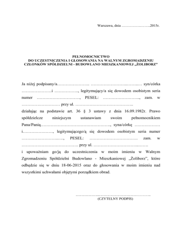 Warszawa, dnia …………….……..2015r. PEŁNOMOCNICTWO DO UCZESTNICZENIA I GŁOSOWANIA NA WALNYM ZGROMADZENIU CZŁONKÓW SPÓŁDZIELNI - BUDOWLANO MIESZKANIOWEJ „ŻOLIBORZ” Ja niżej podpisany/a………………….. ……………………..……..… syn/córka …………………i …………….., legitymujący/a się dowodem osobistym seria numer …………………………, PESEL: …………………….., zam. w ……………………… przy ul. ………………………………….. działając na podstawie art. 36 § 3 ustawy z dnia 16.09.1982r. Prawo spółdzielcze niniejszym ustanawiam swoim pełnomocnikiem Pana/Panią…………………………………………., syna/córkę ……………… i…………………, legitymującego/ą się dowodem osobistym seria numer ……………………..…., PESEL: ……………………………. zam. w …………………………………. przy ul. …………………………..……. i upoważniam go/ją do uczestniczenia w moim imieniu w Walnym Zgromadzeniu Spółdzielni Budowlano - Mieszkaniowej „Żoliborz”, które odbędzie się w dniu 18-06-2015 oraz do głosowania w moim imieniu nad wszystkimi uchwałami objętymi porządkiem obrad. ……………..……………………………….. (CZYTELNY PODPIS)