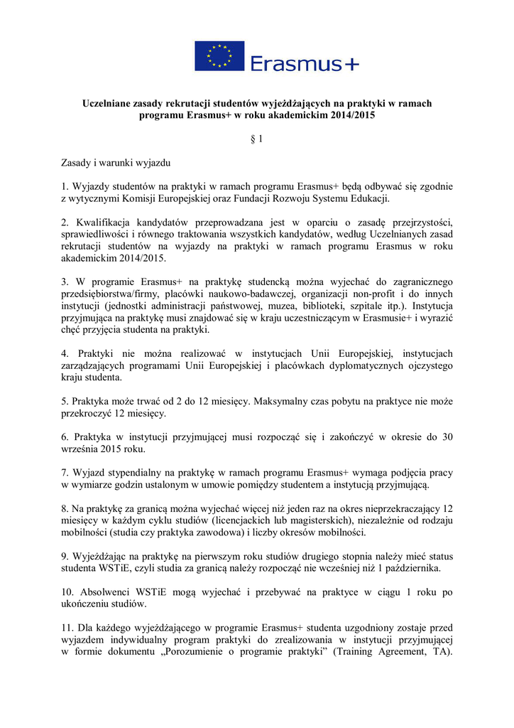Uczelniane zasady rekrutacji studentów wyjeżdżających na praktyki w ramach programu Erasmus+ w roku akademickim 2014/2015 §1 Zasady i warunki wyjazdu 1. Wyjazdy studentów na praktyki w ramach programu Erasmus+ będą odbywać się zgodnie z wytycznymi Komisji Europejskiej oraz Fundacji Rozwoju Systemu Edukacji. 2. Kwalifikacja kandydatów przeprowadzana jest w oparciu o zasadę przejrzystości, sprawiedliwości i równego traktowania wszystkich kandydatów, według Uczelnianych zasad rekrutacji studentów na wyjazdy na praktyki w ramach programu Erasmus w roku akademickim 2014/2015. 3. W programie Erasmus+ na praktykę studencką można wyjechać do zagranicznego przedsiębiorstwa/firmy, placówki naukowo-badawczej, organizacji non-profit i do innych instytucji (jednostki administracji państwowej, muzea, biblioteki, szpitale itp.). Instytucja przyjmująca na praktykę musi znajdować się w kraju uczestniczącym w Erasmusie+ i wyrazić chęć przyjęcia studenta na praktyki. 4. Praktyki nie można realizować w instytucjach Unii Europejskiej, instytucjach zarządzających programami Unii Europejskiej i placówkach dyplomatycznych ojczystego kraju studenta. 5. Praktyka może trwać od 2 do 12 miesięcy. Maksymalny czas pobytu na praktyce nie może przekroczyć 12 miesięcy. 6. Praktyka w instytucji przyjmującej musi rozpocząć się i zakończyć w okresie do 30 września 2015 roku. 7. Wyjazd stypendialny na praktykę w ramach programu Erasmus+ wymaga podjęcia pracy w wymiarze godzin ustalonym w umowie pomiędzy studentem a instytucją przyjmującą. 8. Na praktykę za granicą można wyjechać więcej niż jeden raz na okres nieprzekraczający 12 miesięcy w każdym cyklu studiów (licencjackich lub magisterskich), niezależnie od rodzaju mobilności (studia czy praktyka zawodowa) i liczby okresów mobilności. 9. Wyjeżdżając na praktykę na pierwszym roku studiów drugiego stopnia należy mieć status studenta WSTiE, czyli studia za granicą należy rozpocząć nie wcześniej niż 1 października. 10. Absolwenci WSTiE mogą wyjechać i przebywać na praktyce w ciągu 1 roku po ukończeniu studiów. 11. Dla każdego wyjeżdżającego w programie Erasmus+ studenta uzgodniony zostaje przed wyjazdem indywidualny program praktyki do zrealizowania w instytucji przyjmującej w formie dokumentu „Porozumienie o programie praktyki” (Training Agreement, TA). Porozumienie powinno zostać podpisane przed wyjazdem studenta na praktyki za granicę, przez trzy strony: uczelnię macierzystą, instytucję przyjmującą i studenta. 12. Wszystkie zmiany wprowadzone do TA przez którąkolwiek ze stron wymagają potwierdzenia na piśmie. Zaleca się, aby wprowadzenie ewentualnych zmian było zakończone w ciągu 1 miesiąca od przyjazdu studenta do instytucji przyjmującej. 13. Praktyki mogą stanowić integralną część szkolenia zawodowego studentów lub wspierać ich wejście na rynek pracy, jeżeli praktyka w ramach programu Erasmus+ nie jest integralną częścią studiów uczelnia odnotuje fakt jej realizacji w suplemencie do dyplomu. 14. Zwrot stypendium nie będzie wymagany od studenta w przypadku zaistnienia okoliczności określonej jako „siła wyższa” (tj. sytuacja niezależna od studenta związana z poważną chorobą lub nieszczęśliwym zdarzeniem). Przypadek taki wymaga potwierdzenia w formie pisemnej z Narodowej Agencji programu Erasmus+. 15. Stypendium otrzymywane z budżetu programu Erasmus+ na czas pobytu za granicą podczas praktyki ma charakter uzupełniający, co oznacza, że nie pokrywa ono wszystkich kosztów związanych z podróżą i pobytem w kraju docelowym. Jest ono przeznaczone na pokrycie dodatkowych kosztów związanych z wyjazdem i pobytem w zagranicznej instytucji przyjmującej (koszty podróży, ubezpieczenia, przygotowania językowego, zwiększone koszty utrzymania za granicą). 16. W czasie pobytu w instytucji przyjmującej student zobowiązany jest do kontynuacji opłat za naukę w Wyższej Szkole Turystyki i Ekologii w Suchej Beskidzkiej w pełnej wysokości. 17. Wypłata stypendiów krajowych (np. socjalne, Rektora, inne), do których student nabył prawo przed wyjazdem, będzie kontynuowana w czasie pobytu studenta w instytucji przyjmującej. Student ma również zagwarantowane prawo do ubiegania się o stypendia po powrocie z praktyki. 18. Wyjeżdżając za granicę w ramach programu Erasmus+ student nie może być na urlopie dziekańskim. 19. Pobyt za granicą w ramach programu Erasmus+ nie może wykroczyć poza jeden - ten sam - rok akademicki - tzn. stypendium, które rozpoczęło się w semestrze letnim jednego roku akademickiego nie może być kontynuowane w semestrze zimowym następnego roku. 20. Po uzyskaniu akceptacji instytucji przyjmującej student ma prawo ubiegać się o przedłużenie pobytu na stypendium. Przedłużenie pobytu w instytucji przyjmującej w ramach programu Erasmus+ jest możliwe tylko w czasie jednego roku akademickiego. Dodatkowe stypendium na przedłużenie pobytu zostanie przyznane, tylko wtedy gdy Uczelnia będzie dysponować wolnymi środkami przeznaczonymi na ten cel. 21. Decyzję o ewentualnym przedłużeniu podejmuje: a) Pełnomocnik Rektora ds. Praktyk b) Uczelniany koordynator programu Erasmus. 22. Aby przedłużyć pobyt o kolejne miesiące w ramach tego samego roku akademickiego należy: a) wypełnić wniosek o przedłużenie pobytu, b) uzyskać zgodę instytucji goszczącej i macierzystej, c) uzgodnić „Porozumienie o programie praktyki” na kolejny okres, d) podpisać stosowny aneks do umowy z Wyższą Szkołą Turystyki i Ekologii 23. Z każdym studentem zakwalifikowanym na wyjazd w programie Erasmus+ zostanie sporządzona pisemna umowa. Umowa szczegółowo określa warunki wyjazdu oraz wypłaty i rozliczenia stypendium (m.in. czas trwania pobytu w instytucji przyjmującej, wysokość stypendium, sposób jego wypłaty, termin, w którym trzeba się rozliczyć z uczelnią macierzystą itp.). 24. Ka