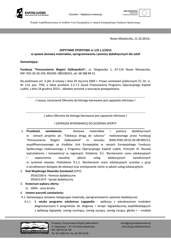 Człowiek – Najlepsza inwestycja Projekt współfinansowany ze środków Unii Europejskiej w ramach Europejskiego Funduszu Społecznego Nowe Miasteczko, 11.10.2013r. ZAPYTANIE OFERTOWE nr 1/9.1.2/2013 w spawie dostawy materiałów, oprogramowania i pomocy dydaktycznych dla szkół Zamawiający: Fundacja "Porozumienie Wzgórz Dalkowskich", ul. Głogowska 1, 67-124 Nowe Miasteczko, NIP: 925-20-20-159, REGON: 080106331, tel. 68 388 84 31. Na podstawie art. 4 pkt. 8 ustawy z dnia 29 stycznia 2004 r. Prawo zamówień publicznych (Tj. Dz. U. Nr 113, poz. 759), a także punktem 2.2.7.2 Zasad Finansowania Programu Operacyjnego Kapitał Ludzki, z dnia 24 grudnia 2012r., składam wniosek o wszczęcie postępowania: ……………………………………………………………………………………………………………..………………………………… / nazwa, oznaczenie Oferenta do którego kierowane jest zapytanie ofertowe / ………………………………………………………………………………………..……………………………………………………… / adres Oferenta do którego kierowane jest zapytanie ofertowe / I ZAPRASZA WYKONAWCĘ DO ZŁOŻENIA OFERTY ___________________________________________________________________________ 1. Przedmiot zamówienia: dostawa materiałów i pomocy dydaktycznych w ramach projektu pn. "Edukacja drogą do sukcesu” realizowanego przez Fundację "Porozumienie Wzgórz Dalkowskich" nr winsoku WND-POKL.09.01.02-08-095/13, współfinansowanego ze środków Unii Europejskiej w ramach Europejskiego Funduszu Społecznego realizowanego z Programu Operacyjnego Kapitał Ludzki, Priorytet IX. Rozwój wykształcenia i kompetencji w regionach, Działanie: 9.1. Wyrównanie szans edukacyjnych i zapewnienie wysokiej jakości usług edukacyjnych świadczonych w systemie oświaty, Podziałanie 9.1.2. Wyrównanie szans edukacyjnych uczniów z grup o utrudnionym dostępie do edukacji oraz zmniejszenie różnic w jakości usług edukacyjnych. 2. Kod Wspólnego Słownika Zamówień (CPV): 39162100-6 - Pomoce dydaktyczne 39162110-9 - Sprzęt dydaktyczny 3. Kryterium wyboru oferty: 1) 100% - cena brutto 4. Istotne warunki zamówienia: 4.1 Zamawiający zamawia następujące materiały, oprogramowania i pomoce dydaktyczne: 4.1.1 1 sztuka programu eduSensus Logopedia - aplikacja z wbudowanym modułem diagnostycznym; 5 programów do diagnozy i terapii logopedycznej, współdziałających z aplikacją logopedy: szereg szumiący, szereg syczący, szereg ciszący, głoska r – moduły Fundacja „Porozumienie Wzgórz Dalkowskich” ul. Głogowska 1, 67-124 Nowe Miasteczko NIP: 925-20-20-159 Tel. 68 3 888 431, fax. 68 355 09 98 [email protected] www.WzgorzaDalkowskie.pl Człowiek – Najlepsza inwestycja Projekt współfinansowany ze środków Unii Europejskiej w ramach Europejskiego Funduszu Społecznego 4.1.2 4.1.3 4.1.4 4.1.5 4.1.6 4.1.7 4.1.8 4.1.9 4.1.10 4.1.11 4.1.12 4.1.13 4.1.14 podstawowe, różnicowanie szeregów; wyposażonych w szereg narzędzi pomocniczych, takich jak: interfejs foniczny, profesjonalny mikrofon, nakładki na mikrofon. 1 sztuka programu eduSensus Dysleksja - program składający się z: Aplikacji terapeuty pozwalającej na archiwizowanie i drukowanie przydatnej dokumentacji; Oceny ryzyka dysleksji - modułu diagnostycznego dla dzieci po pierwszym roku nauki czytania, zawierający zestaw materiałów interaktywnych wspomagających badanie przesiewowe dzieci oraz profilaktykę w zakresie trudności w czytaniu i pisaniu; Programu Litery modułu terapeutycznego dla dzieci do 7-9 lat, służącego do nauki i utrwalania kształtu liter i zawierającego ćwiczenia z wielu obszarów. 1 komplet makatki z ułamkami zawierającej kolorowe kartoniki z zapisem ułamków zwykłych, dziesiętnych i procentów, wym. makatki 68,5 x 50 cm, 9 kieszonek na kartonowe paski. 1 komplet ułamków koło zawierających 9 kolorowych kół, wykonanych z przezroczystego plastiku, podzielonych od 1/2 do 1/12 części; śr. 8,7 cm, 51 elementów umieszczonych w plastikowym pojemniku. 1 komplet ułamków kwadrat składających się z 9 kolorowych kwadratów, podzielonych od 1/2 do 1/12 części. wym. 10 x 10 cm, 51 elementów umieszczonych w solidnym, plastikowym pojemniku. 2 komplety systemu dziesiętnego wykonanego z twardego tworzywa sztucznego, 51 szt. w 9 kolorach. 1 komplet aktywnej maty - czas - winylowa mata o wym. 137 x 137 cm, 4 kostki (nadmuchiwane) o boku 13 cm, 20 kart, instrukcja. 1 sztuka drabiny do koordynacji wykonana z mocnego kolorowego PCV (szczebelki) oraz taśmy polietylenowej koloru czarnego, długość 4 m, szerokość 48 cm, standardowy rozstaw szczebli w drabinkach. 4 sztuki piłek 65 z PCV do gier i zabaw ruchowych oraz rehabilitacyjnych, śr. 65 cm. 1 sztuka: piłka Sensoryczna 65 z miękkiej gumy z wypustkami na powierzchni śr. 65 cm. 1 sztuka: piłka Fasolka 55 o wymiarach. 55 x 100 cm, 1 kg. 5 sztuk: materac gimnastyczny o wymiarach 2m x 1,2 m x 0,1 m, pokrowiec materaca wykonany z materiału typu skaj, wzmocnionego na narożnikach i wypełnionego pianką, posiadający odpowietrzniki i uchwyty do transportu. 1 sztuka: eduROM - gra edukacyjna "Czytanie i pisanie" - zestaw zawierający 176 różnorodnych zadań, ponad 200 multimedialnych stron, zróżnicowany stopień trudności zadań, gry utrwalające pisownie trudniejszych wyrazów. Program przeznaczony dla dzieci z zaburzeniami czytania i pisania, umożliwiający śledzenie postępów w nauce poprzez rejestr wyników, tablica rekordzistów, stopniowalny poziom trudności zadań. 8 kompletów: czytaj i pisz poprawnie - karty pracy, zróżnicowany stopień trudności ćwiczeń, przeznaczony dla uczniów zagrożonych ryzykiem dysleksji. Fundacja „Porozumienie Wzgórz Dalkowskich” ul. Głogowska 1, 67-124 Nowe Miasteczko NIP: 925-20-20-159 Tel. 68 3 888 431, fax. 68 355 09 98 [email protected] www.WzgorzaDalkowskie.pl Człowiek – Najlepsza inwe