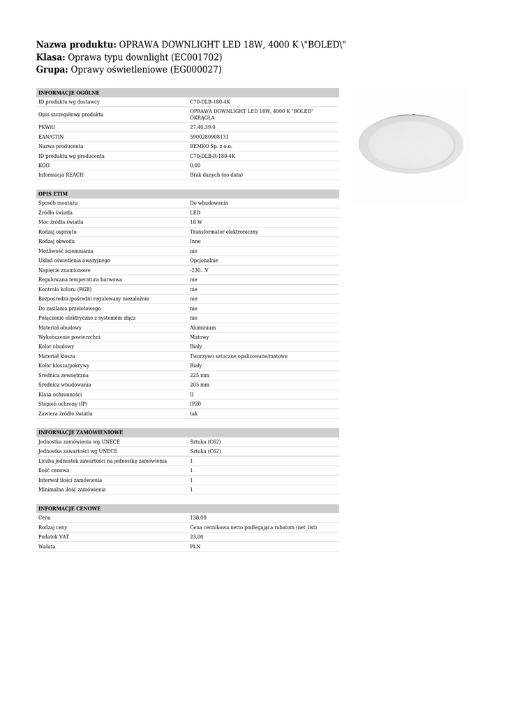 Nazwa produktu: OPRAWA DOWNLIGHT LED 18W, 4000 K \"BOLED\" Klasa: Oprawa typu downlight (EC001702) Grupa: Oprawy oświetleniowe (EG000027) INFORMACJE OGÓLNE ID produktu wg dostawcy C70-DLB-180-4K Opis szczegółowy produktu OPRAWA DOWNLIGHT LED 18W, 4000 K "BOLED" OKRĄGŁA PKWiU 27.40.39.0 EAN/GTIN 5900280908131 Nazwa producenta BEMKO Sp. z o.o. ID produktu wg producenta C70-DLB-R-180-4K KGO 0,00 Informacja REACH Brak danych (no data) OPIS ETIM Sposób montażu Do wbudowania Źródło światła LED Moc źródła światła 18 W Rodzaj osprzętu Transformator elektroniczny Rodzaj obwodu Inne Możliwość ściemniania nie Układ oświetlenia awaryjnego Opcjonalnie Napięcie znamionowe -230...V Regulowana temperatura barwowa nie Kontrola koloru (RGB) nie Bezpośredni-/pośredni regulowany niezależnie nie Do zasilania przelotowego nie Połączenie elektryczne z systemem złącz nie Materiał obudowy Aluminium Wykończenie powierzchni Matowy Kolor obudowy Biały Materiał klosza Tworzywo sztuczne opalizowane/matowe Kolor klosza/pokrywy Biały Średnica zewnętrzna 225 mm Średnica wbudowania 205 mm Klasa ochronności II Stopień ochrony (IP) IP20 Zawiera źródło światła tak INFORMACJE ZAMÓWIENIOWE Jednostka zamówienia wg UNECE Sztuka (C62) Jednostka zawartości wg UNECE Sztuka (C62) Liczba jednostek zawartości na jednostkę zamówienia 1 Ilość cenowa 1 Interwał ilości zamówienia 1 Minimalna ilość zamówienia 1 INFORMACJE CENOWE Cena 138,00 Rodzaj ceny Cena cennikowa netto podlegająca rabatom (net_list) Podatek VAT 23,00 Waluta PLN