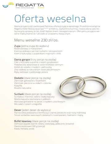 Oferta weselna Mamy przyjemność zaoferować Państwu ofertę przyjęcia weselnego. Przestronne wnętrza Regatta Hotel Restauracja Spa**** w Kiekrzu, wykwintna kuchnia i nowoczesna sala restauracyjna sprawią, że ten dzień będzie dniem niezapomnianym. Oferujemy przyjęcia weselne maksymalnie do 120 osób w ustawieniu klasycznym. Menu weselne 230 zł/os. Zupa (jedna zupa do wyboru) Rosół domowy z makaronem Esencja wołowa z pernod, kurkami i szczypiorkiem Krem z kukurydzy z pulpecikami mięsnymi i chilli Dania gorące (trzy porcje na osobę) Filet z kurczaka supreme z sosem grzybowym Polędwiczka wieprzowa w sosie śliwkowo-winnym Kotlet de volaille z masłem i pietruszką Zraz wołowy w naturalnym sosie pieczeniowym Ryby siatkowe z pobliskiego jeziora Dodatki (dwie porcje na osobę) Ziemniaki gotowane z koperkiem Ziemniaki pieczone w ziołach i czosnku Kopytka Risotto naturalne Surówki (dwie porcje na osobę) Surówka z marchwi, selera i białej kapusty Modra kapusta zasmażana z jabłkiem Warzywa gotowane na parze z masłem czosnkowym Mix sałat z sosem vinegrette Deser (jeden deser do wyboru) Panna cotta podawana z konfiturą z czarnej porzeczki oraz nutą malinową Tercet sorbetów owocowych, podanych z szampanem, malinami i miętą Bufet kawowy (dwie porcje na osobę) Domowe wypieki (sernik oblany czekoladą, jabłecznik, brownie) Owoce sezonowe (100 g/porcja) Kawa, herbata, woda Zimne zakąski (2,5 porcji na osobę) Polędwiczka wieprzowa w ziołach gotowana metodą sous vide Schab z suszoną morelą gotowany metodą sous vide Galantyna z kurczaka z warzywami Szparagi zawijane w szynkę konserwową Deska serów Deska wędlin Tatar wołowy z jajkiem i pudrem z oliwy czosnkowej Łosoś gravlax na konfiturze z czerwonej cebuli Pieczywo, masło Sałatki (jedna porcja na osobę) Caprese z bazylią Młody szpinak z kozim serem, pestkami dyni i musztardowo-miodowym vinegrette Grecka Sosy zimne (tatarski, zielone curry, cumberland) Kolacja ciepła (jedna porcja na osobę) Zupa gulaszowa lub żurek staropolski Żeberka pieczone w ziołach, miodzie i piwie Boeuf strogonof z kurczaka z kluseczkami Kapusta kiszona zasmażana okraszona wędzonką Cena obejmuje również: Powitanie Pary Młodej chlebem i solą Brak opłaty korkowej za wódkę i wino Białe obrusy i serwetki, świeczniki Apartament dla Nowożeńców ze śniadaniem Bezpłatny parking hotelowy Zakwaterowanie podczas Wesela: Do dyspozycji Państwa oddajemy 23 komfortowo urządzone pokoje w specjalnej cenie: Pokój jednoosobowy 200 zł + śniadanie 35 zł/os. Pokój dwuosobowy 230 zł + śniadanie 35 zł/os. W cenie doby hotelowej bezpłatny dostęp do strefy Wellness & Spa: basen z przeciwprądem, sauna fińska i turecka, jacuzzi, salka fitness. Atrakcje dodatkowe: Fontanna czekolady z owocami: 700 zł Pokaz fajerwerków: 1000 zł Stół wiejski : 25 zł/os. Dekoracja kwiatowa stołów: 10 zł/os. Udziec wieprzowy serwowany przez Szefa Kuchni z sosem grzybowym oraz pieczywem: 20 zł/os. Kontakt: Joanna Gulczyńska / joanna.gulczyń[email protected]/ tel.: 501 221 215 Regatta Hotel Restauracja Spa**** / ul. Chojnicka 49 ; 60 -480 Poznań-Kiekrz telefon: + 48 61 848 83 08 / mob. + 48 502 78 78 10 / fax: + 48 61 840 32 10 email: [email protected] / www.regattahotel.pl