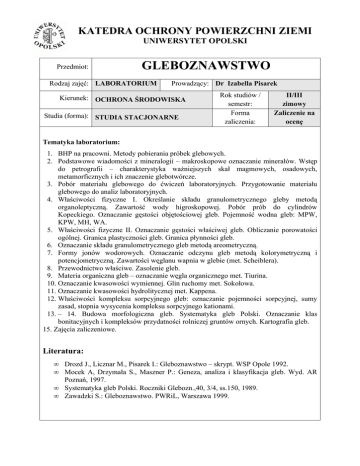 KATEDRA OCHRONY POWIERZCHNI ZIEMI UNIWERSYTET OPOLSKI Przedmiot: GLEBOZNAWSTWO Rodzaj zajęć: LABORATORIUM Prowadzący: Dr Izabella Pisarek Kierunek: OCHRONA ŚRODOWISKA Studia (forma): STUDIA STACJONARNE Rok studiów / semestr: Forma zaliczenia: II/III zimowy Zaliczenie na ocenę Tematyka laboratorium: 1. BHP na pracowni. Metody pobierania próbek glebowych. 2. Podstawowe wiadomości z mineralogii – makroskopowe oznaczanie minerałów. Wstęp do petrografii – charakterystyka ważniejszych skał magmowych, osadowych, metamorficznych i ich znaczenie glebotwórcze. 3. Pobór materiału glebowego do ćwiczeń laboratoryjnych. Przygotowanie materiału glebowego do analiz laboratoryjnych. 4. Właściwości fizyczne I. Określanie składu granulometrycznego gleby metodą organoleptyczną. Zawartość wody higroskopowej. Pobór prób do cylindrów Kopeckiego. Oznaczanie gęstości objętościowej gleb. Pojemność wodna gleb: MPW, KPW, MH, WA. 5. Właściwości fizyczne II. Oznaczanie gęstości właściwej gleb. Obliczanie porowatości ogólnej. Granica plastyczności gleb. Granica płynności gleb. 6. Oznaczanie składu granulometrycznego gleb metodą areometryczną. 7. Formy jonów wodorowych. Oznaczanie odczynu gleb metodą kolorymetryczną i potencjometryczną. Zawartości węglanu wapnia w glebie (met. Scheiblera). 8. Przewodnictwo właściwe. Zasolenie gleb. 9. Materia organiczna gleb – oznaczanie węgla organicznego met. Tiurina. 10. Oznaczanie kwasowości wymiennej. Glin ruchomy met. Sokołowa. 11. Oznaczanie kwasowości hydrolitycznej met. Kappena. 12. Właściwości kompleksu sorpcyjnego gleb: oznaczanie pojemności sorpcyjnej, sumy zasad, stopnia wysycenia kompleksu sorpcyjnego kationami. 13. – 14. Budowa morfologiczna gleb. Systematyka gleb Polski. Oznaczanie klas bonitacyjnych i kompleksów przydatności rolniczej gruntów ornych. Kartografia gleb. 15. Zajęcia zaliczeniowe. Literatura: • • • • Drozd J., Licznar M., Pisarek I.: Gleboznawstwo – skrypt. WSP Opole 1992. Mocek A, Drzymała S., Maszner P.: Geneza, analiza i klasyfikacja gleb. Wyd. AR Poznań, 1997. Systematyka gleb Polski. Roczniki Glebozn.,40, 3/4, ss.150, 1989. Zawadzki S.: Gleboznawstwo. PWRiL, Warszawa 1999. KATEDRA OCHRONY POWIERZCHNI ZIEMI UNIWERSYTET OPOLSKI Przedmiot: GLEBOZNAWSTWO Rodzaj zajęć: LABORATORIUM Prowadzący: Dr Izabella Pisarek Kierunek: OCHRONA ŚRODOWISKA Studia (forma): STUDIA STACJONARNE Rok studiów / semestr: Forma zaliczenia: I/II letni Zaliczenie na ocenę Tematyka laboratorium: 1. BHP na pracowni. Metody pobierania próbek glebowych. 2. Podstawowe wiadomości z mineralogii – makroskopowe oznaczanie minerałów. Wstęp do petrografii – charakterystyka ważniejszych skał magmowych, osadowych, metamorficznych i ich znaczenie glebotwórcze. 3. Pobór materiału glebowego do ćwiczeń laboratoryjnych. Przygotowanie materiału glebowego do analiz laboratoryjnych. 4. Właściwości fizyczne I. Określanie składu granulometrycznego gleby metodą organoleptyczną. Zawartość wody higroskopowej. Pobór prób do cylindrów Kopeckiego. Oznaczanie gęstości objętościowej gleb. Pojemność wodna gleb: MPW, KPW, MH, WA. 5. Właściwości fizyczne II. Oznaczanie gęstości właściwej gleb. Obliczanie porowatości ogólnej. Granica plastyczności gleb. Granica płynności gleb. 6. Oznaczanie składu granulometrycznego gleb metodą areometryczną. 7. Formy jonów wodorowych. Oznaczanie odczynu gleb metodą kolorymetryczną i potencjometryczną. Zawartości węglanu wapnia w glebie (met. Scheiblera). 8. Przewodnictwo właściwe. Zasolenie gleb. 9. Materia organiczna gleb – oznaczanie węgla organicznego met. Tiurina. 10. Oznaczanie kwasowości wymiennej. Glin ruchomy met. Sokołowa. 11. Oznaczanie kwasowości hydrolitycznej met. Kappena. 12. Właściwości kompleksu sorpcyjnego gleb: oznaczanie pojemności sorpcyjnej, sumy zasad, stopnia wysycenia kompleksu sorpcyjnego kationami. 13.–14. Budowa morfologiczna gleb. Systematyka gleb Polski. Oznaczanie klas bonitacyjnych i kompleksów przydatności rolniczej gruntów ornych. Kartografia gleb. 15. Zajęcia zaliczeniowe. Literatura: • Drozd J., Licznar M., Pisarek I.: Gleboznawstwo – skrypt. WSP Opole 1992. • Mocek A, Drzymała S., Maszner P.: Geneza, analiza i klasyfikacja gleb. Wyd. AR Poznań, 1997. • Systematyka gleb Polski. Roczniki Glebozn.,40, 3/4, ss.150, 1989. • Zawadzki S.: Gleboznawstwo. PWRiL, Warszawa 1999.