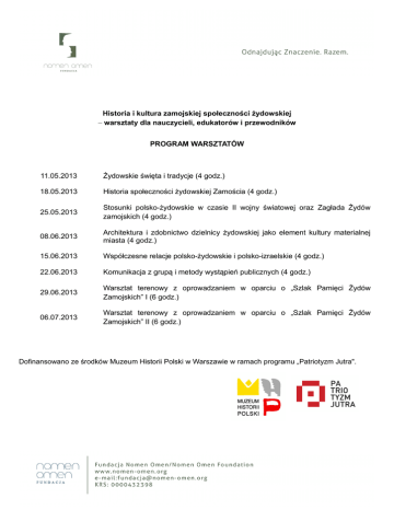 Historia i kultura zamojskiej społeczności żydowskiej – warsztaty dla nauczycieli, edukatorów i przewodników PROGRAM WARSZTATÓW 11.05.2013 Żydowskie święta i tradycje (4 godz.) 18.05.2013 Historia społeczności żydowskiej Zamościa (4 godz.) 25.05.2013 Stosunki polsko-żydowskie w czasie II wojny światowej oraz Zagłada Żydów zamojskich (4 godz.) 08.06.2013 Architektura i zdobnictwo dzielnicy żydowskiej jako element kultury materialnej miasta (4 godz.) 15.06.2013 Współczesne relacje polsko-żydowskie i polsko-izraelskie (4 godz.) 22.06.2013 Komunikacja z grupą i metody wystąpień publicznych (4 godz.) 29.06.2013 Warsztat terenowy z oprowadzaniem w oparciu o „Szlak Pamięci Żydów Zamojskich” I (6 godz.) 06.07.2013 Warsztat terenowy z oprowadzaniem w oparciu o „Szlak Pamięci Żydów Zamojskich” II (6 godz.) Dofinansowano ze środków Muzeum Historii Polski w Warszawie w ramach programu „Patriotyzm Jutra".