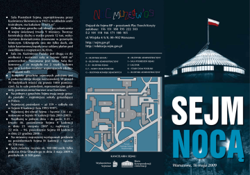 Dojazd do Sejmu RP – przystanek Plac Trzech Krzyży autobusy: 116 151 180 195 222 503 E-2 101 118 166 171 108 105 ul. Wiejska 4/6/8, 00–902 Warszawa http://sejm.gov.pl http://edukacja.sejm.gov.pl A – BUDYNEK SENATU H – BUDYNEK ADMINISTRACYJNY B – BUDYNEK ADMINISTRACYJNY I – SALA POSIEDZEŃ SEJMU C, D – BUDYNKI SEJMU J – ŁĄCZNIK E, F – NOWY DOM POSELSKI K – STARY DOM POSELSKI G – BUDYNEK KOMISJI SEJMOWYCH L – BUDYNEK ADMINISTRACYJNY A B E F C D J I K ca ul. ka ejs Wi Pomnik Polskiego Państwa Podziemnego ti ul. Matejki .F ra s KANCELARIA SEJMU Wydawnictwo Sejmowe Biuro Korespondencji i Informacji ul. Piękna H ul ul. Górnośląska L ul. Piotra Maszyńskiego G ul. Senacka Sala Posiedzeń Sejmu, zaprojektowana przez Kazimierza Skórewicza w 1925 r. w układzie amfiteatralnym, ma kubaturę 15 675 m3. Odbudowa gmachu sali obrad po zakończeniu II wojny światowej trwała 9 miesięcy. Tworząc konstrukcję dachu o wadze prawie 12 ton, wykorzystano doświadczenia stosowane w przemyśle lotniczym. Udźwignęła ona nie tylko dach, ale także kasetonową kopułę oraz szklany plafon pod świetlikiem o rozpiętości 16,10 m. Sala im. Kazimierza Pużaka jest drugą co do wielkości i ważności salą w Sejmie (600 m2 powierzchni). Nazywana jest także Salą Kolumnową – ze względu na 2 rzędy kolumn (po 10 w każdym rzędzie) wspierających zdobiony stiukami sufit. Kompleks gmachów sejmowych położony jest w parku na skraju skarpy warszawskiej. W ponad 10 budynkach mieści się prawie 1400 pomieszczeń. Są to sale posiedzeń, reprezentacyjne gabinety, pomieszczenia biurowe oraz hotelowe. Na jednym z gmachów Sejmu mają swoje gniazdo pustułki – najmniejsze sokoły gniazdujące w Polsce. Najwięcej posiedzeń – aż 119 – odbyło się w Sejmie II kadencji (lata 1993-1997). Najwięcej dni obrad Sejmu – łącznie 334 – zanotowano w Sejmie IV kadencji (lata 2001-2005). Najdłużej w jednym dniu – do godz. 4.51 – trwało 46. posiedzenie Sejmu V kadencji w dniu 25 sierpnia 2007 r.; najkrócej – 22 min. – 96. posiedzenie Sejmu III kadencji w dniu 23 grudnia 2000 r. Na mównicy najczęściej występowali posłowie na posiedzeniach Sejmu IV kadencji – łącznie 46 556 razy. Sejm zwiedza rocznie ok. 100 000 osób; tylko podczas Dnia Otwartego w dniu 3 maja 2009 r. przybyło ok. 8 500 gości. SEJM NOCĄ Warszawa, 16 maja 2009 Sala Posiedzeń – klasycystyczny gmach zaprojektowany przez Kazimierza Skórewicza – została oddana do użytku w 1928 r. po 3 latach budowy. Wnętrze w układzie amfiteatralnym, nawiązujące do Panteonu, pozostaje po odbudowie ze zniszczeń wojennych wierne przedwojennemu projektowi. Powojenną dekorację utrzymaną w stylu art déco wykonał Aleksander Żurakowski. Na mównicy znajduje się płaskorzeźba Historia. Na płaszczyźnie balustrady znajduje się 12 personifikacji, w tym w centralnej części ukazano: Sprawiedliwość, Przemysł, Rolnictwo, Sztuki Piękne. Nad barierką rzeźbione orły z umieszczonymi na piersiach herbami miast: Łowicza, Legnicy, Jeleniej Góry, Warszawy, Gniezna, Krakowa, Wrocławia i Poznania. Salę otacza korytarz kuluarów o kolebkowatym sklepieniu z lunetami, oświetlony oknami. Hall Główny zbudowany wg projektu Bohdana Pniewskiego to dwukondygnacyjne wnętrze za głównym wejściem do Sejmu. Na drzwiach wejściowych znajdują się ozdobne kraty ze stylizowanym motywem łuku, tarczy i strzały. Wewnątrz nad wejściem umieszczono zegar w ceramicznej oprawie. Posadzkę z geometrycznym wzorem (stylizowanym meandrem) ułożono z szarego marmuru ze Sławniowic i czarnego z Dębnika. Białe tło wykonano z marmuru kararyjskiego. Na ścianach jasne sztablatury. Na piętrze szare stiukowe kanelowane kolumny. Naturalne górne oświetlenie zapewniają okrągłe świetliki. Marmurowe trójbiegowe rozdzielne schody są ozdobione kutą żelazną balustradą, w którą wmontowano wykonane z brązu plakiety dekoracyjne z wyobrażeniami główek dziewczęcych. Balustradę wieńczy poręcz w kształcie węża z jasnego brązu. Sala Kolumnowa (im. Kazimierza Pużaka) pomyślana była jako miejsce przechadzek i spotkań. To drugie największe pomieszczenie sejmowe po Sali Posiedzeń Sejmu. Wejście ozdobiono kratą utrzymaną w złocisto-czarnej tonacji. Na marmurowej posadzce 3 rozety ułożone z Carrary, Dębnika, złotego onyksu, czerwonego marmuru węgierskiego, „zielonej Marianny” i jasnoszarego marmuru Szewce. Na suficie stiukowa dekoracja z liści wawrzynu. Pomiędzy 20 kolumnami umieszczono szklane kandelabry zaprojektowane przez Tadeusza Gronowskiego. Galeria nazwana Korytarzem Marszałkowskim, z 2 rzędami przyściennych szarych stiukowych kolumn, stanowi trakt komunikacyjny między Sejmem i Senatem. Pośrednie oświetlenie, ulokowane nad belkowaniem wspartym na kolumnach, eksponuje światłocień tworzony przez wysunięty gzyms. Zwężające się ku dołowi kolumny z namiastką kapitelu w postaci tzw. wolich oczu.