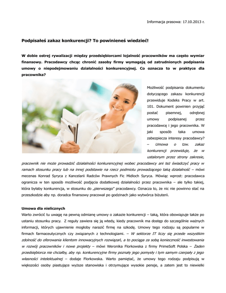 Informacja prasowa: 17.10.2013 r. Podpisałeś zakaz konkurencji? To powinieneś wiedzieć! W dobie ostrej rywalizacji między przedsiębiorcami lojalność pracowników ma często wymiar finansowy. Pracodawcy chcąc chronić zasoby firmy wymagają od zatrudnionych podpisania umowy o niepodejmowaniu działalności konkurencyjnej. Co oznacza to w praktyce dla pracownika? Możliwość podpisania dokumentu dotyczącego zakazu konkurencji przewiduje Kodeks Pracy w art. 101. Dokument powinien przyjąć postać pisemnej, umowy odrębnej podpisanej przez pracodawcę i jego pracownika. W jaki sposób taka umowa zabezpiecza interesy pracodawcy? – Umowa konkurencji o tzw. przewiduje, zakaz że w ustalonym przez strony zakresie, pracownik nie może prowadzić działalności konkurencyjnej wobec pracodawcy ani też świadczyć pracy w ramach stosunku pracy lub na innej podstawie na rzecz podmiotu prowadzącego taką działalność – mówi mecenas Konrad Syryca z Kancelarii Radców Prawnych Fic Midloch Syryca. Mówiąc wprost: pracodawca ogranicza w ten sposób możliwość podjęcia dodatkowej działalności przez pracownika – ale tylko takiej, która byłaby konkurencja, w stosunku do „pierwszego” pracodawcy. Oznacza to, że nic nie powinno stać na przeszkodzie aby np. doradca finansowy pracował po godzinach jako wytwórca biżuterii. Umowa dla nielicznych Warto zwrócić tu uwagę na pewną odmianę umowy o zakazie konkurencji – taką, która obowiązuje także po ustaniu stosunku pracy. Z reguły zawiera się ją wtedy, kiedy pracownik ma dostęp do szczególnie ważnych informacji, których ujawnienie mogłoby narazić firmę na szkodę. Umowy tego rodzaju są popularne w firmach farmaceutycznych czy związanych z technologiami. – W sektorze IT liczy się przede wszystkim zdolność do oferowania klientom innowacyjnych rozwiązań, a to pociąga za sobą konieczność inwestowania w rozwój pracowników i nowe projekty – mówi Weronika Florkowska z firmy PrimeSoft Polska – Żaden przedsiębiorca nie chciałby, aby np. konkurencyjne firmy poznały jego pomysły i tym samym czerpały z jego własności intelektualnej – dodaje Florkowska. Warto pamiętać, że umowy tego rodzaju podpisują w większości osoby piastujące wyższe stanowiska i otrzymujące wysokie pensje, a zatem jest to niewielki odsetek wszystkich pracowników. Odszkodowanie za lojalność Warto pamiętać, że prawo dobrze zabezpiecza osoby, które podpisały zakaz konkurencji po ustaniu stosunku pracy. Umowa tego typu musi być zawarta na czas określony (czyli np. będzie trwać pół roku po ustaniu stosunku pracy). To nie wszystko: pracodawca musi jednocześnie zobowiązać się do wypłaty odpowiedniego odszkodowania. Jego wysokość nie może być niższa od 25% wynagrodzenia otrzymanego przez pracownika przed ustaniem stosunku pracy przez okres odpowiadający okresowi obowiązywania zakazu konkurencji. Odszkodowanie może być wypłacane w comiesięcznych ratach. Zakaz konkurencji tego rodzaju może przestać obowiązywać przed terminem określonym w umowie. Stanie się tak, jeżeli ustaną przyczyny, które stały się powodem zakazu lub jeśli pracodawca nie będzie płacił odszkodowania. ------------------------------Dystrybucja materiałów: Kinga Przybysz [email protected] kom./+48/ 519-181-900