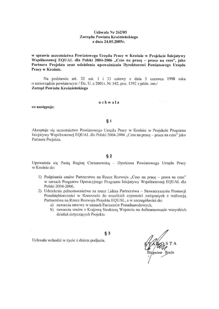 Uchwahi N1· 262/05 Za rz~ldu Powiatu Krośnieńs ldcgo z dnia 24.05.2005r. w sprrnvie uczestnictwa Powiatowego Urzędu Pracy w Krośnie w Projekcie Infojatywy Wspólnotowej EQUAL dla Polski 2004-2006 „Czas na pracę - praca na czas" , jako Partnera Projektu on1z udzielenia upoważnienia Dyrektorowi Powiatowego Urzędu Pracy w Krośnie. Na podstawie art. 32 ust. i 33 ustawy z dnia 5 czerwca 1998 roku o samorządzie powiatowym /Dz. U. z 200 1r. Nr 142, poz. 1592 z późn. zm./ Zarząd Powiatu Krośnieńskiego u chwa la co następuj e: §1 Akceptuje się uczesh1ictwo Powiatowego Urzędu Pracy w Krośnie w Projekcie Progratnu Inicjatywy Wspólnotowej EQUAL dla Polski 2004-2006 „Czas na pracę - praca na czas" jako Partnera Projektu. §2 VtJOWażnia się Panią Reginę C hrzanowską - Dyrek.tara llowiatowego Urzędu Pracy w Krośnie do: 1) Podpisania urnów Partnerstwa na Rzecz Rozwoju „Czas na pracę - praca na czas'' w ramach Programu Operacyjnego Programu [nicjatywy Wspólnotowej EQUAL dla Polski 2004-2006, 2) Udzie.lenia peł nomocn ictwa na rzecz Lidem Partnerstwa - Stowarzyszenia Promocj i Przedsięb io rczości w Rzeszowie do wszelkich czy 1rności związanych z realizacją Partnerstwa na Rzecz Rozwoju Projektu EQUAL, a w szczególności do: a) zawarcia umowy w ramach Partnerstw Ponadnarodowych, b) zawarcia Ltmów z Krajową Slrukturą Wsparcia na dofinansowanie wszystkich działań dotyczących Projeklu §3 Uchwała wchodzi w życie z dniem podjęcia.