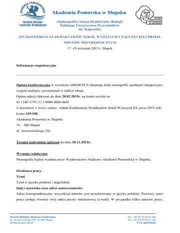 Akademia Pomorska w Słupsku Ogólnopolska Sekcja Dydaktyków Biologii Polskiego Towarzystwa Przyrodników im. Kopernika XIX KONFERENCJA DYDAKTYKÓW SZKÓŁ WYŻSZYCH I NAUCZYCIELI PRZEDMIOTÓW PRZYRODNICZYCH 17 -19 wrzesień 2015 r. Słupsk Informacje organizacyjne Opłata konferencyjna w wysokości 600,00 PLN obejmuje druk monografii, spotkanie integracyjne, wyjazd studyjny, poczęstunek w trakcie obrad. Opłatę należy dokonać do dnia 28.02.2015r. na konto uczelni nr: 62 1240 3770 1111 0000 4068 0604 Z dopiskiem w treści wpłaty: wpłata Konferencja Dydaktyków Szkół Wyższych Ed. przyr.2015 subkonto 249-548 Akademia Pomorska w Słupsku 76 – 200 Słupsk ul. Arciszewskiego 22a Termin nadsyłania zgłoszeń do dnia 20.12.2014r.. Wymogi redakcyjne Monografia będzie wydana przez Wydawnictwo Naukowe Akademii Pomorskiej w Słupsku. Struktura pracy Tytuł Tytuł w języku polskim i angielskim Imię i nazwisko oraz adres autora/autorów Adres korespondencyjny wszystkich autorów jest przedstawiany w języku polskim. Pierwszy autor pracy podaje również swój adres poczty internetowej (e-mail). W przypadku kilku autorów pracy, Instytut Biologii i Ochrony Środowiska: ul. Arciszewskiego 22b, 76-200 Słupsk [email protected] Tel. +48 (0) 59 84 05 348 Fax +48 (0) 59 84 05 328 www.apsl.edu.pl Akademia Pomorska w Słupsku Ogólnopolska Sekcja Dydaktyków Biologii Polskiego Towarzystwa Przyrodników im. Kopernika adresy wszystkich współautorów identyfikowane są za pomocą cyfry arabskiej umieszczonej w formie indeksu górnego za nazwiskiem. Abstrakt Napisany wyłącznie w języku angielskim, zawiera syntetyczne streszczenie głównych wyników badań. Jego objętość nie powinna przekraczać 200 wyrazów. Słowa kluczowe W języku polskim i angielskim – nie więcej niż 5. Wprowadzenie, materiały i metody badań, wyniki i dyskusja. Literatura Spis publikacji w kolejności alfabetycznej. W każdej z publikacji należy zachować następującą kolejność: nazwisko autora, inicjały imion, rok wydania, tytuł, skrót nazwy czasopisma, tom i strony. Pozycje książkowe muszą zawierać informacje o wydawnictwie i miejscu wydania. Wzorce poprawnie cytowanych prac zostały przedstawione poniżej: • Czasopismo: Brown W.P., Roth R.R. 2004. Juvenile survival and recruitment of wood thrushes Hylocichla mustelina in a forest fragment. J. Avian Biol., 35: 316-326. • Książka: Tomiałojć L. 1990. Ptaki Polski – rozmieszczenie I liczebność. PWN. Warszawa. • Rozdział: Banaszak J. 2004. Z badań nad owadami zapylającymi w Bydgoszczy (Hymenoptera, Apoidea). W: P. Indykiewicz, T. Barczak (red.). Fauna miast Europy Środkowej 21. wieku. Wyd. P.M. LOGO. Bydgoszcz: 225-223. Wskazówki redakcyjne 1. Całkowita objętość artykułu 21 - 23 strony (wraz z tabelami i rysunkami). Artykuły przeznaczone do druku powinny być przygotowane w edytorze Word z zachowaniem następujących zasad formatowania: 2,5 cm marginesy, typ czcionki – Times New Roman, rozmiar czcionki – 12 pkt., odstęp między wierszami – 1,5. Nie należy stosować pogrubień ani wyróżnień oprócz akapitów i nazw taksonomicznych pisanych kursywą, bez nawiasów; 2. W pracach należy stosować Międzynarodowy System Jednostek SI; 3. Wszystkie tabele i ryciny powinny być przygotowane osobno, na pojedynczych arkuszach formatu A4. Tabele powinny zawierać jak najmniej krawędzi pionowych. Ryciny powinny być czytelne i wysokiej jakości w konwencji czarno-białej lub odcieni szarości (możliwość Instytut Biologii i Ochrony Środowiska: ul. Arciszewskiego 22b, 76-200 Słupsk [email protected] Tel. +48 (0) 59 84 05 348 Fax +48 (0) 59 84 05 328 www.apsl.edu.pl Akademia Pomorska w Słupsku Ogólnopolska Sekcja Dydaktyków Biologii Polskiego Towarzystwa Przyrodników im. Kopernika umieszczenia rycin kolorowych jedynie w szczególnych przypadkach). Podpisy do tabel i rycin należy przedstawić w języku polskim i angielskim na osobnej stronie; 4. Cytowanie literatury w tekście pracy powinno zachować następujące reguły: podanie nazwiska autora i roku wydania w nawiasie, np. (Kowalski 2004) lub Kowalski (2004). W przypadku dwóch autorów pracy są oni cytowani: Kowalski i Nowak 2005, a gdy więcej niż dwóch autorów: Kowalski i inni 2005. Cytowanie wielu prac jednocześnie powinno być uporządkowane według lat wydania, np. (Kowalski i Nowak 2000, Kasprzak 2002). Cytowanie należy wyłącznie prace, które ukazały się drukiem lub są w druku. 5. Tekst pracy powinien być przysłany w dwóch egzemplarzach na pojedynczych arkuszach formatu A4 oraz na płycie CD-R lub e-mail na adres: Dorota Morka Instytut Biologii i Ochrony Środowiska Akademia Pomorska w Słupsku ul. Arciszewskiego 22b 76-200 Słupsk e-mail: [email protected] Serdecznie zapraszamy Organizatorzy Instytut Biologii i Ochrony Środowiska: ul. Arciszewskiego 22b, 76-200 Słupsk [email protected] Tel. +48 (0) 59 84 05 348 Fax +48 (0) 59 84 05 328 www.apsl.edu.pl