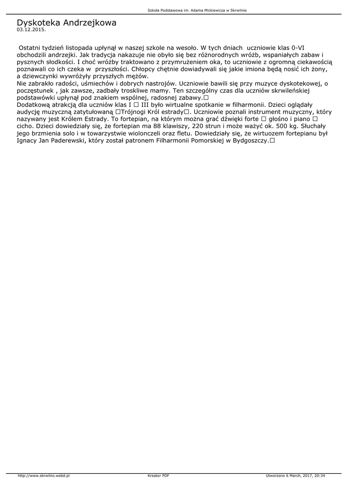 Szkoła Podstawowa im. Adama Mickiewicza w Skrwilnie Dyskoteka Andrzejkowa 03.12.2015. Ostatni tydzień listopada upłynął w naszej szkole na wesoło. W tych dniach uczniowie klas 0-VI obchodzili andrzejki. Jak tradycja nakazuje nie obyło się bez różnorodnych wróżb, wspaniałych zabaw i pysznych słodkości. I choć wróżby traktowano z przymrużeniem oka, to uczniowie z ogromną ciekawością poznawali co ich czeka w przyszłości. Chłopcy chętnie dowiadywali się jakie imiona będą nosić ich żony, a dziewczynki wywróżyły przyszłych mężów. Nie zabrakło radości, uśmiechów i dobrych nastrojów. Uczniowie bawili się przy muzyce dyskotekowej, o poczęstunek , jak zawsze, zadbały troskliwe mamy. Ten szczególny czas dla uczniów skrwileńskiej podstawówki upłynął pod znakiem wspólnej, radosnej zabawy. Dodatkową atrakcją dla uczniów klas I III było wirtualne spotkanie w filharmonii. Dzieci oglądały audycję muzyczną zatytułowaną Trójnogi Król estrady. Uczniowie poznali instrument muzyczny, który nazywany jest Królem Estrady. To fortepian, na którym można grać dźwięki forte głośno i piano cicho. Dzieci dowiedziały się, że fortepian ma 88 klawiszy, 220 strun i może ważyć ok. 500 kg. Słuchały jego brzmienia solo i w towarzystwie wiolonczeli oraz fletu. Dowiedziały się, że wirtuozem fortepianu był Ignacy Jan Paderewski, który został patronem Filharmonii Pomorskiej w Bydgoszczy. http://www.skrwilno.webd.pl Kreator PDF Utworzono 6 March, 2017, 20:34