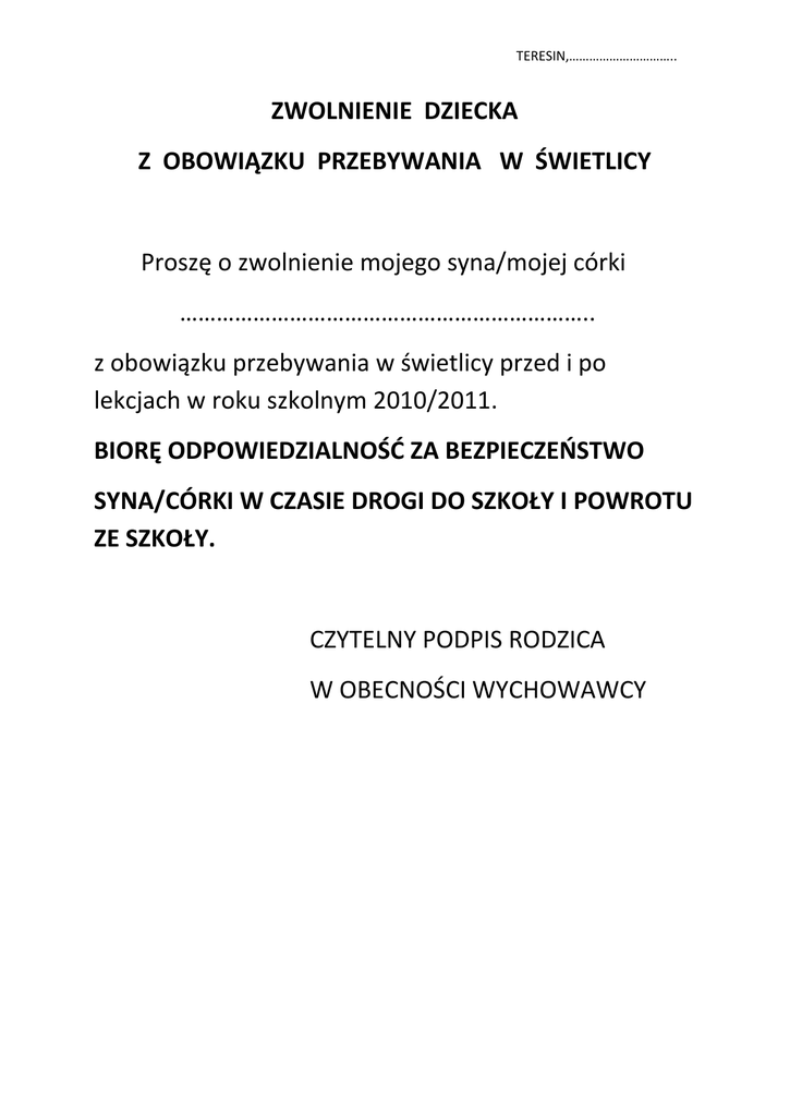 TERESIN,………………………….. ZWOLNIENIE DZIECKA Z OBOWIĄZKU PRZEBYWANIA W ŚWIETLICY Proszę o zwolnienie mojego syna/mojej córki ………………………………………………………….. z obowiązku przebywania w świetlicy przed i po lekcjach w roku szkolnym 2010/2011. BIORĘ ODPOWIEDZIALNOŚD ZA BEZPIECZEŃSTWO SYNA/CÓRKI W CZASIE DROGI DO SZKOŁY I POWROTU ZE SZKOŁY. CZYTELNY PODPIS RODZICA W OBECNOŚCI WYCHOWAWCY