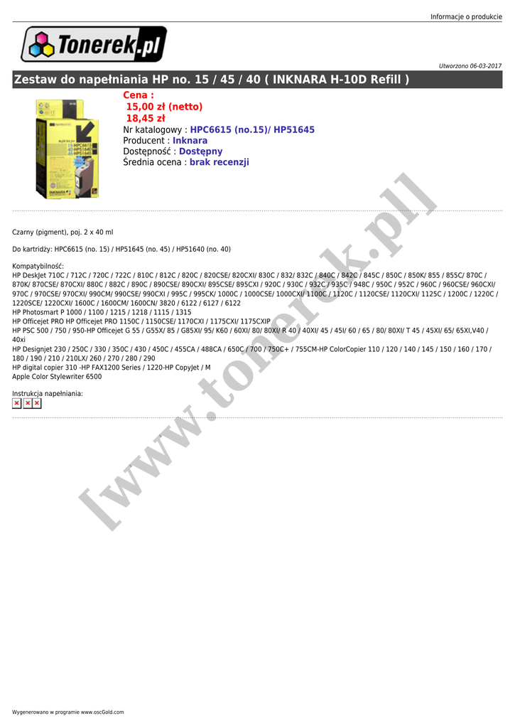 Informacje o produkcie Utworzono 06-03-2017 Zestaw do napełniania HP no. 15 / 45 / 40 ( INKNARA H-10D Refill ) Cena : 15,00 zł (netto) 18,45 zł .p l] Nr katalogowy : HPC6615 (no.15)/ HP51645 Producent : Inknara Dostępność : Dostępny Średnia ocena : brak recenzji Czarny (pigment), poj. 2 x 40 ml Do kartridży: HPC6615 (no. 15) / HP51645 (no. 45) / HP51640 (no. 40) .t [w w w Instrukcja napełniania: on er ek Kompatybilność: HP DeskJet 710C / 712C / 720C / 722C / 810C / 812C / 820C / 820CSE/ 820CXI/ 830C / 832/ 832C / 840C / 842C / 845C / 850C / 850K/ 855 / 855C/ 870C / 870K/ 870CSE/ 870CXI/ 880C / 882C / 890C / 890CSE/ 890CXI/ 895CSE/ 895CXI / 920C / 930C / 932C / 935C / 948C / 950C / 952C / 960C / 960CSE/ 960CXI/ 970C / 970CSE/ 970CXI/ 990CM/ 990CSE/ 990CXI / 995C / 995CK/ 1000C / 1000CSE/ 1000CXI/ 1100C / 1120C / 1120CSE/ 1120CXI/ 1125C / 1200C / 1220C / 1220SCE/ 1220CXI/ 1600C / 1600CM/ 1600CN/ 3820 / 6122 / 6127 / 6122 HP Photosmart P 1000 / 1100 / 1215 / 1218 / 1115 / 1315 HP Officejet PRO HP Officejet PRO 1150C / 1150CSE/ 1170CXI / 1175CXI/ 1175CXIP HP PSC 500 / 750 / 950-HP Officejet G 55 / G55X/ 85 / G85XI/ 95/ K60 / 60XI/ 80/ 80XI/ R 40 / 40XI/ 45 / 45I/ 60 / 65 / 80/ 80XI/ T 45 / 45XI/ 65/ 65XI,V40 / 40xi HP Designjet 230 / 250C / 330 / 350C / 430 / 450C / 455CA / 488CA / 650C / 700 / 750C+ / 755CM-HP ColorCopier 110 / 120 / 140 / 145 / 150 / 160 / 170 / 180 / 190 / 210 / 210LX/ 260 / 270 / 280 / 290 HP digital copier 310 -HP FAX1200 Series / 1220-HP CopyJet / M Apple Color Stylewriter 6500 Wygenerowano w programie www.oscGold.com