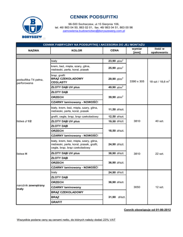CENNIK PODSUFITKI 96-500 Sochaczew, ul.15 Sierpnia 106, tel. 46/ 863 04 50, 863 02 01, fax. 46/ 863 04 51, 863 00 96 [email protected] CENNIK FABRYCZNY NA PODSUFITKĘ I AKCESORIA DO JEJ MONTAŻU NAZWA podsufitka T4 pełna, perforowana KOLOR CENA biały 23,90 zł/m2 krem, beż, mięta, szary, glina, niebieski, perła, koral, piasek 25,90 zł/m2 brąz, grafit BRĄZ CZEKOLADOWY CEGLASTY 29,90 zł/m2 ZŁOTY DĄB UV plus 49,90 zł/m2 wymiar [mm] ilość w opakowaniu 3390 x 305 18 szt / 18,6 m2 3810 40 szt. 3810 22 szt. 3050 12 szt. ZŁOTY DĄB ORZECH 39,90 zł/m2 CZARNY laminowany - NOWOŚĆ! listwa J 1/2 biały, krem, beż, mięta, szary, glina, niebieski, perła, koral, piasek 11,50 zł/szt. grafit, cegła, brąz, brąz czekoladowy 12,50 zł/szt. ZŁOTY DĄB UV plus 19,50 zł/szt. ZŁOTY DĄB ORZECH 18,50 zł/szt. CZARNY laminowany - NOWOŚĆ! listwa H biały, krem, beż, mięta, szary, glina, niebieski, perła, koral, piasek, grafit, cegła, brąz, brąz czekoladowy 24,90 zł/szt. ZŁOTY DĄB UV plus 38,90 zł/szt. ZŁOTY DĄB ORZECH 36,90 zł/szt. CZARNY laminowany - NOWOŚĆ! biały 24,90 zł/szt. ZŁOTY DĄB ORZECH narożnik zewnętrzny mały 36,90 zł/szt. CZARNY laminowany BRĄZ CZEKOLADOWY BRĄZ 31,90 zł/szt. GRAFIT Cennik obowiązuje od 01-06-2012 Wszystkie podane ceny są cenami netto, do których należy dodać 23% VAT