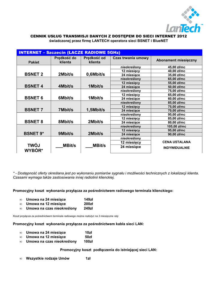 CENNIK USŁUG TRANSMISJI DANYCH Z DOSTĘPEM DO SIECI INTERNET 2012 świadczonej przez firmę LANTECH operatora sieci BSNET i BlueNET INTERNET – Szczecin (ŁACZE RADIOWE 5GHz) Pakiet Prędkość do klienta Prędkość od klienta BSNET 2 2Mbit/s 0,6Mbit/s BSNET 4 4Mbit/s 1Mbit/s BSNET 6 6Mbit/s 1Mbit/s BSNET 7 7Mbit/s 1,5Mbit/s BSNET 8 8Mbit/s 2Mbit/s BSNET 9* 9Mbit/s 2Mbit/s TWÓJ WYBÓR* ___MBit/s ___MBit/s Czas trwania umowy Abonament miesięczny nieokreślony 12 miesięcy 24 miesiące nieokreślony 12 miesięcy 24 miesiące nieokreślony 12 miesięcy 24 miesiące nieokreślony 12 miesięcy 24 miesiące nieokreślony 12 miesięcy 24 miesiące nieokreślony 12 miesięcy 24 miesiące nieokreślony 45,00 zł/mc 40,00 zł/mc 35,00 zł/mc 65,00 zł/mc 55,00 zł/mc 50,00 zł/mc 75,00 zł/mc 65,00 zł/mc 60,00 zł/mc 85,00 zł/mc 75,00 zł/mc 70,00 zł/mc 95,00 zł/mc 85,00 zł/mc 80,00 zł/mc 105,00 zł/mc 95,00 zł/mc 90,00 zł/mc 12 miesięcy 24 miesiące CENA USTALANA INDYWIDUALNIE * - Dostępność oferty określana jest po wykonaniu pomiarów sygnału i możliwości technicznych z lokalizacji klienta. Czasami wymaga także zastosowania innej radiolinii klienckiej. Promocyjny koszt wykonania przyłącza za pośrednictwem radiowego terminala klienckiego: • • • Umowa na 24 miesiące Umowa na 12 miesiące Umowa na czas nieokreślony 149zł 200zł 249zł Koszt przyłącza za pośrednictwem terminala radiowego można rozłożyć na 3 miesięczne raty Promocyjny koszt wykonania przyłącza za pośrednictwem kabla sieci LAN: • • • Umowa na 24 miesiące Umowa na 12 miesiące Umowa na czas nieokreślony 10zł 50zł 100zł Promocyjny koszt podłączenia do istniejącej sieci LAN: • Wszystkie rodzaje Umów 1zł USŁUGI INSTALACYJNE - OPŁATY JEDNORAZOWE ( bez promocji) Instalacja kablowa 1.22 zł w przypadku istniejącego zakończenia kablowego sieci LANTECH w lokalu Klienta; zakończenie końcówką RJ45 Instalacja kablowa 60.00 zł w przypadku braku istniejącego zakończenia kablowego sieci LANTECH w lokalu Klienta; dociągnięcie kabla + zakończenie końcówką RJ45 250.00 zł** Instalacja radiowa zawiera wypożyczenie terminala radiowego, potrzebnego do uruchomienia i poprawnego działania usługi na jednym komputerze; zakończenie końcówką RJ45 * cena zależna od warunków technicznych, ustalana indywidualnie ** cena bez promocji. Konfiguracja urządzeń sieciowych Klienta przy instalacji radiowej lub kablowej 50.00zł dotyczy konfiguracji jednego urządzenia. * w przypadku kilku urządzeń cena jest negocjowana indywidualnie POZOSTAŁE OPŁATY Zmiana abonamentu na wyższy 0.00 zł Zmiana abonamentu na niższy 50.00 zł Wystawienie duplikatu faktury 10.00 zł Wcześniejsze rozwiązanie umowy terminowej 500.00zł Instalacja karty sieciowej w komputerze klienta 30.00zł Zakup karty sieciowej Nieuzasadnione wezwanie serwisu technicznego 35.00zł 50,00zł Naprawa lub modernizacja sieci w lokalu Klienta (na życzenie Klienta lub z przyczyn leżących po jego stronie) Wysłanie wezwania do zapłaty 50,00zł 15,00zł Wizyta technika - pomoc w rozwiązywaniu problemów / konfiguracja urządzeń / 60zł/rbg modernizacja lub rozbudowa sieci w lokalu na życzenie klienta (każda rozpoczęta godzina pracy technika + cena materiałów) WYMIANA URZĄZEŃ W PRZYPADKU USZKODZENIA LUB ZNISZCZENIA Z WINY KLIENTA Kliencki terminal radiowy 500.00 zł Router radiowo-kablowy 250.00 zł Zasilacz sieciowy do urządzeń operatora 60,00zł Kabel sieciowy 20,00zł Ceny zawarte w cenniku są cenami brutto - podatek VAT 23% Cennik obowiązuje od dnia 01 maja 2012