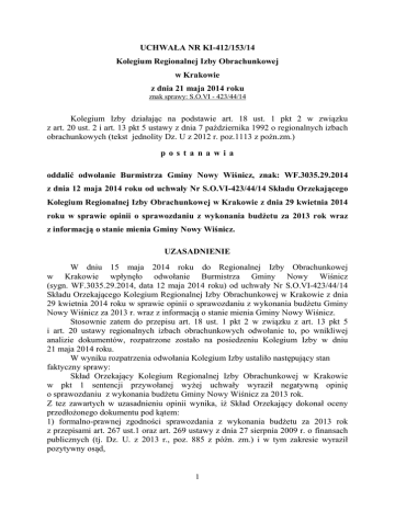 UCHWAŁA NR KI-412/153/14 Kolegium Regionalnej Izby Obrachunkowej w Krakowie z dnia 21 maja 2014 roku znak sprawy: S.O.VI - 423/44/14 Kolegium Izby działając na podstawie art. 18 ust. 1 pkt 2 w związku z art. 20 ust. 2 i art. 13 pkt 5 ustawy z dnia 7 października 1992 o regionalnych izbach obrachunkowych (tekst jednolity Dz. U z 2012 r. poz.1113 z poźn.zm.) p os t a na wi a oddalić odwołanie Burmistrza Gminy Nowy Wiśnicz, znak: WF.3035.29.2014 z dnia 12 maja 2014 roku od uchwały Nr S.O.VI-423/44/14 Składu Orzekającego Kolegium Regionalnej Izby Obrachunkowej w Krakowie z dnia 29 kwietnia 2014 roku w sprawie opinii o sprawozdaniu z wykonania budżetu za 2013 rok wraz z informacją o stanie mienia Gminy Nowy Wiśnicz. UZASADNIENIE W dniu 15 maja 2014 roku do Regionalnej Izby Obrachunkowej w Krakowie wpłynęło odwołanie Burmistrza Gminy Nowy Wiśnicz (sygn. WF.3035.29.2014, data 12 maja 2014 roku) od uchwały Nr S.O.VI-423/44/14 Składu Orzekającego Kolegium Regionalnej Izby Obrachunkowej w Krakowie z dnia 29 kwietnia 2014 roku w sprawie opinii o sprawozdaniu z wykonania budżetu Gminy Nowy Wiśnicz za 2013 r. wraz z informacją o stanie mienia Gminy Nowy Wiśnicz. Stosownie zatem do przepisu art. 18 ust. 1 pkt 2 w związku z art. 13 pkt 5 i art. 20 ustawy regionalnych izbach obrachunkowych odwołanie to, po wnikliwej analizie dokumentów, rozpatrzone zostało na posiedzeniu Kolegium Izby w dniu 21 maja 2014 roku. W wyniku rozpatrzenia odwołania Kolegium Izby ustaliło następujący stan faktyczny sprawy: Skład Orzekający Kolegium Regionalnej Izby Obrachunkowej w Krakowie w pkt 1 sentencji przywołanej wyżej uchwały wyraził negatywną opinię o sprawozdaniu z wykonania budżetu Gminy Nowy Wiśnicz za 2013 rok. Z tez zawartych w uzasadnieniu opinii wynika, iż Skład Orzekający dokonał oceny przedłożonego dokumentu pod kątem: 1) formalno-prawnej zgodności sprawozdania z wykonania budżetu za 2013 rok z przepisami art. 267 ust.1 oraz art. 269 ustawy z dnia 27 sierpnia 2009 r. o finansach publicznych (tj. Dz. U. z 2013 r., poz. 885 z późn. zm.) i w tym zakresie wyraził pozytywny osąd, 1 2) prawidłowości procesów związanych z wykonaniem budżetu roku 2013 przedstawionych w treści sprawozdania, w tym gromadzenia dochodów, dokonywania wydatków, realizacji przychodów oraz rozchodów budżetu. W tym zakresie Skład Orzekający zwrócił uwagę na: a) niskie wykonanie dochodów majątkowych to jest na poziomie 24,47 % planu, b) zaniechanie realizacji ustawowego obowiązku przekazania równowartości odpisów na wyodrębnione konto ZFŚS, wynikającego z art. 6 ust. 2 ustawy z dnia 4 marca 1994 roku o zakładowym funduszu świadczeń socjalnych (tj. Dz. U. z 2012 r., poz. 592), co w konsekwencji doprowadziło do powstania nowych zobowiązań wymagalnych na kwotę 449.427 zł, c) skutki finansowe wcześniejszych zaniechań terminowego regulowania zobowiązań wyrażające się w konieczności dokonania w roku 2013 wydatków budżetowych z tytułu odsetek na kwotę 254.883,25 zł, d) brak monitorowania w trakcie wykonywania budżetu poziomu dochodów i wydatków. Skład Orzekający stanął na stanowisku, iż już z tych powodów nie sposób uznać, że proces gromadzenia dochodów i dokonywania wydatków w roku budżetowym 2013 zasługuje na pozytywną ocenę. Powody te przesądziły - zdaniem Składu Orzekającego - o wyrażeniu negatywnej opinii o sprawozdaniu z wykonania budżetu Gminy za rok 2013. Burmistrz Gminy Nowy Wiśnicz kwestionuje opinię Składu Orzekającego, uznając, iż brak jest podstaw do negatywnej oceny sprawozdania z wykonania budżetu, albowiem: 1) przedłożone sprawozdanie z wykonania budżetu, od strony formalno-prawnej, jest sporządzone w sposób zgodny z wymienionymi wyżej przepisami ustawy o finansach publicznych, 2) budżet roku 2013 w zakresie dochodów i wydatków bieżących zrealizowany został w sposób nienaruszający dyspozycji przepisu art. 243 ustawy o finansach publicznych. Realizacja przychodów z tytułu kredytów i pożyczek nie spowodowała przekroczenia limitu zadłużenia Gminy określonego przepisem art. 170 „starej” ustawy o finansach publicznych, a nadto poziom zadłużenia Gminy uległ obniżeniu o 4,48 %, 3) w sprawozdaniu z wykonania budżetu szczegółowo wyjaśnione zostały przyczyny odchyleń od wykonania planu dochodów, jak i wskazano, iż miały one charakter obiektywny, niezależny od organu wykonawczego, 4) Skład Orzekający nie wniósł zastrzeżeń do realizacji wydatków rzeczowych, w tym zadań inwestycyjnych, omówienia stopnia realizacji zadań zleconych i powierzonych, co zdaniem Burmistrza prowadzi do uznania, że sprawozdanie w tym zakresie zostało uznane przez opiniujących za wystarczające oraz zgodne z wymogami prawa, 5) zaniechanie w roku 2013 dokonania wydatków z tytułu odpisu na zakładowy fundusz świadczeń socjalnych spowodowane było koniecznością uregulowania w pierwszej kolejności spłaty powstałych przed rokiem 2013 zobowiązań wobec nauczycieli i nie doprowadziło do powstania - cyt. „odsetek, kar i opłat” oraz nie wynikało z braku odpowiedniej kontroli zarządczej, 2 6) organ wykonawczy dochował należytej staranności przy wykonywaniu budżetu, co doprowadziło do obniżenia zadłużenia Gminy, w tym znacznego obniżenia poziomu zobowiązań wymagalnych, a przedłożone Radzie Miejskiej sprawozdanie z wykonania budżetu przedstawia w sposób rzetelny i obiektywny wszystkie okoliczności mające wpływ na wykonywanie budżetu za rok 2013 . Burmistrz Gminy Nowy Wiśnicz wnosi do Kolegium Izby o wydanie opinii pozytywnej (z uwagami) o sprawozdaniu z wykonania budżetu Gminy Nowy Wiśnicz za 2013 r. Kolegium Izby, po dokonaniu wnikliwej analizy sprawozdania z wykonania budżetu za rok 2013 uznało, iż negatywna opinia o sprawozdaniu z wykonania budżetu ma uzasadnione podstawy i to w znacznie szerszym zakresie niż wynikające z uzasadnienia opinii. W ocenie K