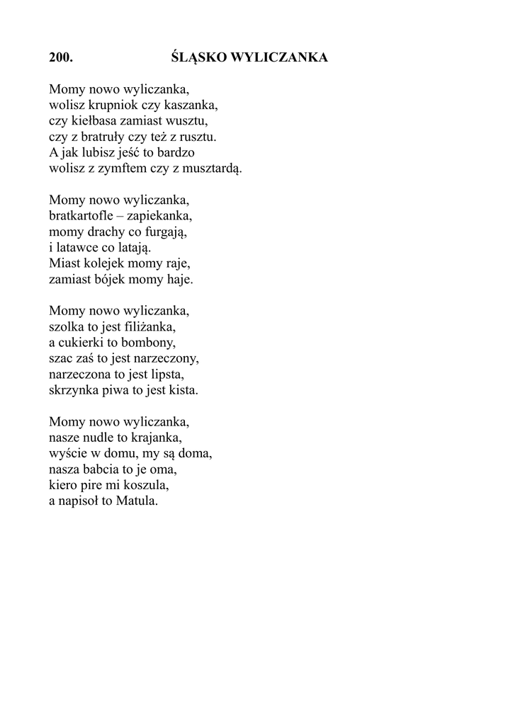 200. ŚLĄSKO WYLICZANKA Momy nowo wyliczanka, wolisz krupniok czy kaszanka, czy kiełbasa zamiast wusztu, czy z bratruły czy też z rusztu. A jak lubisz jeść to bardzo wolisz z zymftem czy z musztardą. Momy nowo wyliczanka, bratkartofle – zapiekanka, momy drachy co furgają, i latawce co latają. Miast kolejek momy raje, zamiast bójek momy haje. Momy nowo wyliczanka, szolka to jest filiżanka, a cukierki to bombony, szac zaś to jest narzeczony, narzeczona to jest lipsta, skrzynka piwa to jest kista. Momy nowo wyliczanka, nasze nudle to krajanka, wyście w domu, my są doma, nasza babcia to je oma, kiero pire mi koszula, a napisoł to Matula.