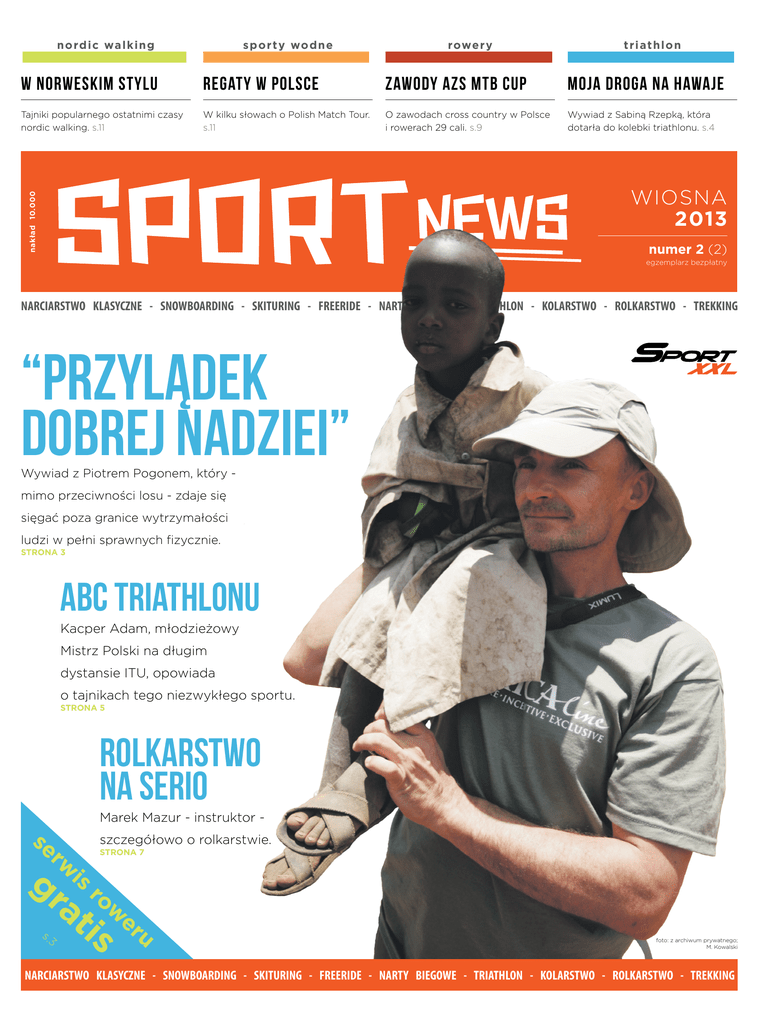 no rdi c wal k i ng sporty wodne rower y tr iath lo n W NORWESKIM STYLU REGATY W POLSCE ZAWODY AZS MTB CUP MOJA DROGA NA HAWAJE Tajniki popularnego ostatnimi czasy nordic walking. s.11 W kilku słowach o Polish Match Tour. s.11 O zawodach cross country w Polsce i rowerach 29 cali. s.9 Wywiad z Sabiną Rzepką, która dotarła do kolebki triathlonu. s.4 nakład 10.000 WIOSNA 2013 numer 2 (2) egzemplarz bezpłatny NARCIARSTWO KLASYCZNE - SNOWBOARDING - SKITURING - FREERIDE - NARTY BIEGOWE - TRIATHLON - KOLARSTWO - ROLKARSTWO - TREKKING “PRZYLĄDEK DOBREJ NADZIEI” Wywiad z Piotrem Pogonem, który mimo przeciwności losu - zdaje się sięgać poza granice wytrzymałości ludzi w pełni sprawnych fizycznie. STRONA 3 ABC TRIATHLONU Kacper Adam, młodzieżowy Mistrz Polski na długim dystansie ITU, opowiada o tajnikach tego niezwykłego sportu. STRONA 5 ROLKARSTWO NA SERIO Marek Mazur - instruktor - se rw szczegółowo o rolkarstwie. STRONA 7 gr is ro at we is ru s.3 foto: z archiwum prywatnego; M. Kowalski NARCIARSTWO KLASYCZNE - SNOWBOARDING - SKITURING - FREERIDE - NARTY BIEGOWE - TRIATHLON - KOLARSTWO - ROLKARSTWO - TREKKING SPORT NEWS 2 BBL, czyli „Biegam Bo Lubię” to akcja, która Jeśli szukacie nietuzinkowych ma promować zdrowy tryb życia. W Mikołowie rozrywek - zarówno zimą, jak spotkania i latem, odpowiedzią na Wasze na miłośników stadionie biegania miejskim. Do odbywają wspólnego się biegania KALENDARZ I M P R E Z potrzeby może być Czarny może dołączyć każdy, kto tylko ma na to ochotę. Groń w Rzykach koło Andrychowa. Masa atrakcji Choć w postaci parku linowego, wieży lotów, a zimą się nieoficjalnie od stycznia, tegorocznego to BBL-u uczestnicy spotykali oficjalna inauguracja doskonale 23 snowparku z wieloma przeszkodami i lodowiska to miała miejsce marca. - Na oficjalnej inauguracji, pomimo temperatury -7 stopni Celsjusza, przyszło 30 osób. Kwiecień Każdy przygotowanego stoku narciarskiego, nie wszystko. Najważniejszy jest bowiem klimat, który Wielkanocny Turniej Tenisa Stołowego Turnieje piłki nożnej dla dzieci i młodzieży XIII Mikołowska Siatkarska Wiosna – turniej w piłce siatkowej mężczyzn dla amatorów Świąteczny Turniej w Piłce Siatkowej – kadetki VI Mikołowski Rodzinny Rajd Rowerowy Turniej Koszykówki „Czwartki Lekkoatletyczne” - XIX edycja ogólnopolskich zawodów dziecięcych w LA Foto: www.facebook.com/BiegamBoLubie z uczestników przed zajęciami dostał kartkę ze swoim imieniem. Trzeba było przypiąć ją w widocznym II Turniej Tenisa Ziemnego o Puchar Dyrektora MOSiR 2 Rajd Mikołowski – wyścigi samochodowe miejscu tak, aby inni współćwiczący mogli bez W akcji biegowej biorą udział nie tylko mieszkańcy Mikołowa, na zajęciach regularnie pojawiają się biegacze z Tychów, Katowic czy Bytomia. Średnia wieku biegaczy to ok. 30 lat, ale pojawiają się również zarówno biegacze w wieku kilku, jak i kilkudziesięciu lat. - Biega z nami m.in. pan Edward, który jest chyba najstarszym biegaczem w Polsce. VI Mistrzostwa Sołectw w Piłce Nożnej zajęcia. więcej informacji na www.czarnygron.pl VI Spartakiada Przedszkolaków z Hektorem Mikołowska Liga Orlików – VI edycja turnieju piłki nożnej dla uczniów szkół gimnazjalnych Orlikowska Liga Siatkówki MOSiR – V edycja prowadzących K2 Ronin Splash został skonstruowany na stoku. Mistrzostwa Śląska w Szpadzie jego 85-te urodziny – opowiedziała Aleksandra z oraz przejazd przez basen, który na potrzeby „Polska biega” – biegi przełajowe dla dzieci i młodzieży – IV edycja akcji ogólnopolskiej XVI Mikołowska Powiatowa Spartakiada Abstynencka druga w historii przejazd na nartach i snowboardzie XIX Sportowy Turniej Miast i Gmin – akcja ogólnopolska W ubiegłym roku po zajęciach „świętowaliśmy” Wajda, najlepiej oddają zdjęcia, przedstawiające pierwszy przez knajpę podczas imprezy urodzinowej K2 Maj problemu dogadać się z nowymi uczestnikami – powiedział Piotr Wajda, jeden z prowadzących zajęcia. Foto: www.facebook.com/czarnygron Mistrzostwa Mikołowa w Karate Orlikowska Liga Streetballa MOSiR – V edycja Jednak mikołowski BBL to nie tylko bieganie, podczas Turniej w Piłce Siatkowej każdego ze spotkań uczestnicy zawsze znajdą chwilę Turniej Minisiatkówki Kinder +Sport na rozmowę między sobą, zawsze jest trochę śmiechu. Foto: www.facebook.com/czarnygron Ekologiczny Piknik Rodzinny - Podczas rozgrzewki przed jednym z treningów nie zabrakło elementów humorystycznych – trzeba było Czerwiec biec naśladując samolot (niektórzy byli myśliwcami III Turniej Charytatywny w Piłce Siatkowej i strzelali do innych) oraz poruszać się jak baletnica II Zawody o Puchar Dyrektora MOSiR w Akrobatyce Sportowej podczas solowego występu – dodają prowadzący. Mikołowskie się w spotkania każdą sobotę BBL-u o odbywają godzinie 9.30. XI Grand Prix Miast Śląskich w Siatkówce Plażowej IV Otwarte Mistrzostwa Mikołowa Cross Country IV Zawody Jeździeckie o Puchar Burmistrza Miasta Mikołowa W dniach 1 - 2 czerwca 2013 na terenie Beskidu Śląskiego odbędzie się trzecia już edycja Rajdu Górskiego Dolomite. W ciągu dwóch dni będziemy delektować się świeżym powietrzem na szlakach, wsłuchiwać się w opowieści przewodników górskich, przeżywać przygody podróżników podczas Gry i zabawy z okazji Dnia Dziecka na Orlikach oraz krytej pływalni + egzamin na kartę pływacką ich prelekcji i slajdowisk, a wieczorem oddamy V Zawody Pływackie z okazji „Dnia Dziecka” dla uczniów szkół podstawowych z DJem. Uczestnictwo w Rajdzie będzie możliwe się zabawie w postaci konkursów i na imprezie Festyn z okazji Dnia Dziecka po uprzedniej rejestracji za pośrednictwem strony Bieg o tytuł Mistrza Nordic Walking internetowej lub telefonicznie oraz po uiszczeniu Rajd Rowerowy Powiatu Mikołowskiego opłaty startowej w wysokości 60 złotych w pakiecie Kino Plenerowe podstawowym (pakiet starto