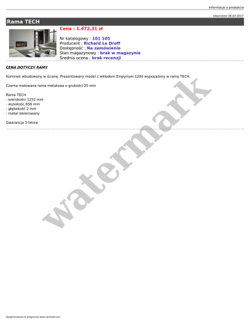 Informacje o produkcie Utworzono 06-03-2017 Rama TECH Cena : 1.472,31 zł Nr katalogowy : 101 105 Producent : Richard Le Droff Dostępność : Na zamówienie Stan magazynowy : brak w magazynie Średnia ocena : brak recenzji CENA DOTYCZY RAMY Kominek wbudowany w ścianę. Prezentowany model z wkładem Empyrium 1200 wyposażony w ramę TECH. Rama TECH - szerokości 1252 mm - wysokośc 656 mm - głębokość 2 mm - metal lakierowany w at Gwarancja 5-letnia er m ar k Czarna malowana rama metalowa o grubości 25 mm Wygenerowano w programie www.oscGold.com