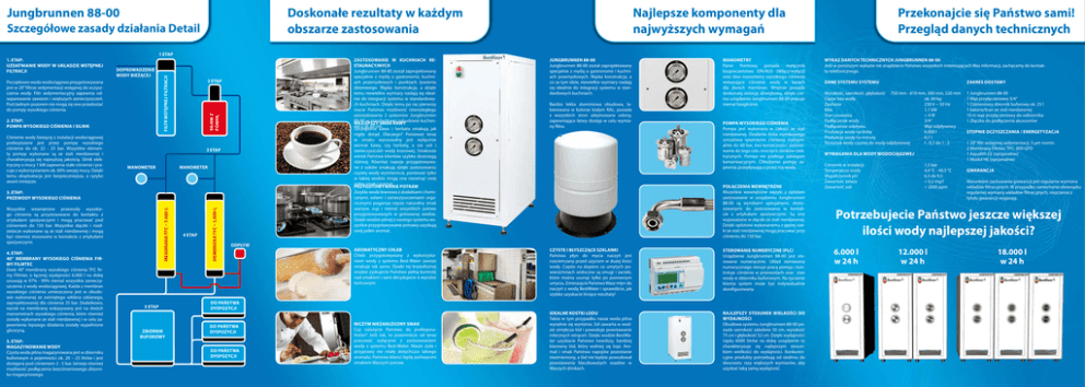 Jungbrunnen 88-00 Doskonałe rezultaty w każdym obszarze zastosowania Szczegółowe zasady działania Detail Najlepsze komponenty dla najwyższych wymagań Początkowo woda wodociągowa przygotowywana jest w 20” filtrze sedymentacji wstępnej do oczyszczenia wody. Filtr sedymentacyjny zapewnia odseparowanie zawiesin i większych zanieczyszczeń. Pod żadnym pozorem nie mogą się one przedostać do pompy wysokiego ciśnienia. 2. Etap: Pompa wysokiego ciśnienia i silnik Ciśnienie wody bieżącej z instalacji wodociągowej podwyższane jest przez pompę wysokiego ciśnienia do ok. 22 - 25 bar. Wszystkie elementy pompy wykonane są ze stali nierdzewnej i charakteryzują się najwyższą jakością. Silnik elektryczny o mocy 1 kW zapewnia stałe ciśnienie i pracuje z wykorzystaniem ok. 60% swojej mocy. Dzięki temu eksploatacja jest bezpieczniejsza, a ryzyko awarii mniejsze. 2 ETAP SILNIK Z POMPĄ DOPROWADZENIE WODY BIEŻĄCEJ FILTR WSTĘPNEJ FILTRACJI 1 ETAP 1. Etap: Uzdatnianie wody w układzie wstępnej filtracji 3 ETAP Manometer Manometer 4. Etap: 40“ membrany wysokiego ciśnienia firmy Filmtec Dwie 40” membrany wysokiego ciśnienia TFC firmy Filmtec o łącznej wydajności 6.000 l na dobę usuwają w 97% - 99% niemal wszystkie zanieczyszczenia z wody wodociągowej. Każda z membran wysokiego ciśnienia umieszczona jest w obudowie wykonanej ze zwiniętego włókna szklanego, zaprojektowanej dla ciśnienia 35 bar. Dodatkowo, nacisk na membranę wskazywany jest na dwóch manometrach wysokiego ciśnienia, które również zostały wykonane ze stali nierdzewnej i w celu zapewnienia lepszego działania zostały wypełnione gliceryną. 5. Etap: Magazynowanie wody Czysta woda pitna magazynowana jest w zbiorniku buforowym o pojemności ok. 20 – 25 litrów i jest dostępna pod ciśnieniem 2 - 5 bar. Istnieje również możliwość podłączenia bezciśnieniowego zbiornika magazynowego. MEMBRANA TFC – 3.000-L Wszystkie wewnętrzne przewody wysokiego ciśnienia są przystosowane do kontaktu z artykułami spożywczymi i mogą pracować pod ciśnieniem do 150 bar. Wszystkie złączki i rozdzielacze wykonane są ze stali nierdzewnej i mogą być również stosowane w kontakcie z artykułami spożywczymi. 5 ETAP ZBIORNIK BUFOROWY 4 ETAP MEMBRANA TFC – 3.000-L 3. Etap: Przewody wysokiego ciśnienia ODPŁYW Jungbrunnen 88-00 Jungbrunnen 88-00 został zaprojektowany specjalnie z myślą o gastronomii i kuchniach przemysłowych. Wąska konstrukcja, a co za tym idzie, niewielkie wymiary nadają się idealnie do integracji systemu w standardowych kuchniach. AROMATYCZNY CHLEB Chleb przygotowywany z wykorzystaniem wody z systemu Best-Water zawsze smakuje tak samo. Dzięki tej krystalicznej wodzie zyskujecie Państwo pełną kontrolę nad smakiem i sami decydujecie o wyrobie końcowym. CZYSTE I BŁYSZCZĄCE SZKLANKI Państwa płyn do mycia naczyń jest rozcieńczany przed użyciem w dużej ilości wody. Często na dopiero co umytych powierzchniach widoczne są smugi i zacieki, które można usunąć tylko po ponownym umyciu. Zmieszajcie Państwo Wasz młyn do naczyń z wodą BestWater i sprawdźcie, jak szybko uzyskacie lśniące rezultaty! STEROWANIE NUMERYCZNE (PLC) Urządzenie Jungbrunnen 88-00 jest sterowane numerycznie. Układ sterowania numerycznego steruje pracą pompy i kontroluje ciśnienie w przewodach oraz stan wody w zbiorniku buforowym. Na życzenie klienta system może być indywidualnie skonfigurowany. IDEALNE KOSTKI LODU Także w tym przypadku nasza woda pitna wyraźnie się wyróżnia. Sól zawarta w wodzie zmiękcza lód i powoduje powstawanie mlecznych wtrąceń. Dzięki wodzie BestWater uzyskacie Państwo twardszy, bardziej klarowny lód, który wolniej się topi. Aromat i smak Państwa napojów pozostanie niezmieniony, a lód nie będzie powodował powstawania kłaczkowatych osadów w Waszych drinkach. NAJLEPSZY STOSUNEK WIELKOŚCI DO WYDAJNOŚCI Obudowa systemu Jungbrunnen 88-00 posiada szerokość zaledwie 30 cm, wysokość 75 cm i głębokość 52 cm. Dzięki wydajności rzędu 6000 litrów na dobę urządzenie to charakteryzuje się najlepszym stosunkiem wielkości do wydajności. Konkurencyjne produkty potrzebują od siedmiu do dwunastu razy większych wymiarów, aby uzyskać taką samą wydajność. DO PAŃSTWA DYSPOZYCJI DO PAŃSTWA DYSPOZYCJI DO PAŃSTWA DYSPOZYCJI MANOMETRY Panel frontowy posiada wyłącznik bezpieczeństwa EIN/AUS [Włącz/wyłącz] oraz dwa manometry wysokiego ciśnienia wskazujące ciśnienie wody w barach dla dwóch membran. Wnętrze posiada doskonałą izolację dźwiękową, dzięki czemu urządzenie Jungbrunnen 88-00 pracuje niemal bezgłośnie. ZASTOSOWANIE W KUCHNIACH RESTAURACYJNYCH Jungbrunnen 88-80 został zaprojektowany specjalnie z myślą o gastronomii, kuchniach przemysłowych i punktach żywienia zbiorowego. Wąska konstrukcja, a dzięki temu niewielkie wymiary nadają się idealnie do integracji systemu w standardowych kuchniach. Dzięki temu po raz pierwszy macie Państwo możliwość równoległego zainstalowania 2 systemów Jungbrunnen 88-80 w standardowej zabudowie kuchenNAJLEPSZY SMAK KAWY nej o gł. 60 cm. Szczególnie kawa i herbata smakują jak nigdy dotąd. Dlaczego? Ponieważ teraz w smaku wyczuwalny jest wyłącznie aromat kawy, czy herbaty, a nie soli i zanieczyszczeń wody kranowej. Smakosze wśród Państwa klientów szybko dostrzegą różnicę. Również napoje przygotowywane z soków smakują dzięki zastosowaniu czystej wody wyśmienicie, ponieważ tylko w takiej wodzie mogą one rozwinąć swój pełny smak i aromat. PRZYGOTOWYWANIE POTRAW Zwykła woda kranowa z dodatkami chemicznymi, solami i zanieczyszczeniami organicznymi pogarsza często naturalny smak warzyw, zup i niemal wszystkich potraw przygotowywanych w gotowanej wodzie. Dzięki wodzie pitnej z naszego systemu wszystkie przygotowywane potrawy uzyskują swój pełen aromat. NICZYM NIEZAKŁÓCONY SMAK Czy należycie Państwo do profesjonalistów? Jeśli t