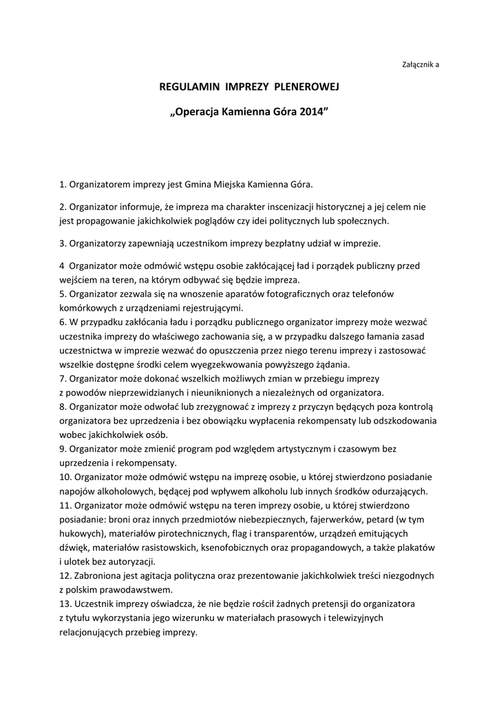 Załącznik a REGULAMIN IMPREZY PLENEROWEJ „Operacja Kamienna Góra 2014” 1. Organizatorem imprezy jest Gmina Miejska Kamienna Góra. 2. Organizator informuje, że impreza ma charakter inscenizacji historycznej a jej celem nie jest propagowanie jakichkolwiek poglądów czy idei politycznych lub społecznych. 3. Organizatorzy zapewniają uczestnikom imprezy bezpłatny udział w imprezie. 4 Organizator może odmówić wstępu osobie zakłócającej ład i porządek publiczny przed wejściem na teren, na którym odbywać się będzie impreza. 5. Organizator zezwala się na wnoszenie aparatów fotograficznych oraz telefonów komórkowych z urządzeniami rejestrującymi. 6. W przypadku zakłócania ładu i porządku publicznego organizator imprezy może wezwać uczestnika imprezy do właściwego zachowania się, a w przypadku dalszego łamania zasad uczestnictwa w imprezie wezwać do opuszczenia przez niego terenu imprezy i zastosować wszelkie dostępne środki celem wyegzekwowania powyższego żądania. 7. Organizator może dokonać wszelkich możliwych zmian w przebiegu imprezy z powodów nieprzewidzianych i nieuniknionych a niezależnych od organizatora. 8. Organizator może odwołać lub zrezygnować z imprezy z przyczyn będących poza kontrolą organizatora bez uprzedzenia i bez obowiązku wypłacenia rekompensaty lub odszkodowania wobec jakichkolwiek osób. 9. Organizator może zmienić program pod względem artystycznym i czasowym bez uprzedzenia i rekompensaty. 10. Organizator może odmówić wstępu na imprezę osobie, u której stwierdzono posiadanie napojów alkoholowych, będącej pod wpływem alkoholu lub innych środków odurzających. 11. Organizator może odmówić wstępu na teren imprezy osobie, u której stwierdzono posiadanie: broni oraz innych przedmiotów niebezpiecznych, fajerwerków, petard (w tym hukowych), materiałów pirotechnicznych, flag i transparentów, urządzeń emitujących dźwięk, materiałów rasistowskich, ksenofobicznych oraz propagandowych, a także plakatów i ulotek bez autoryzacji. 12. Zabroniona jest agitacja polityczna oraz prezentowanie jakichkolwiek treści niezgodnych z polskim prawodawstwem. 13. Uczestnik imprezy oświadcza, że nie będzie rościł żadnych pretensji do organizatora z tytułu wykorzystania jego wizerunku w materiałach prasowych i telewizyjnych relacjonujących przebieg imprezy. 14. Uczestnik imprezy przyjmuje do wiadomości, że na imprezie przebywa na własne ryzyko i odpowiedzialność. 15. Uczestnik imprezy może być narażony na ciągłe przebywanie w strefie dźwięków mogących spowodować uszkodzenie słuchu. 16. Uczestnik imprezy zobowiązany jest do bezwzględnego przestrzegania poleceń i zarządzeń służb odpowiedzialnych za ochronę i bezpieczeństwo podczas imprezy. 18. Organizator nie bierze odpowiedzialności za sytuacje będące wynikiem nie przestrzegania zawartych powyżej postanowień oraz zarządzeń i poleceń służb odpowiedzialnych za bezpieczeństwo i porządek. 19. Uczestnik imprezy ponosi pełną odpowiedzialność materialną za szkody wyrządzone przez niego na terenie, gdzie odbywa się impreza w stosunku do innych jej uczestników jak i za szkody wyrządzone w mieniu organizatora. 20. Udział w imprezie jest równoznaczny z akceptacją przez uczestnika niniejszego Regulaminu. 21. Rozstrzyganie wszelkich sporów i podejmowanie decyzji, o których niniejszy Regulamin nie traktuje, jak również prawo do interpretowania wszystkich zapisów niniejszego Regulaminu przysługuje wyłącznie Organizatorowi. 22. Niniejszy Regulamin jest dostępny: - w siedzibie Organizatora, - na stronie internetowej Organizatora.