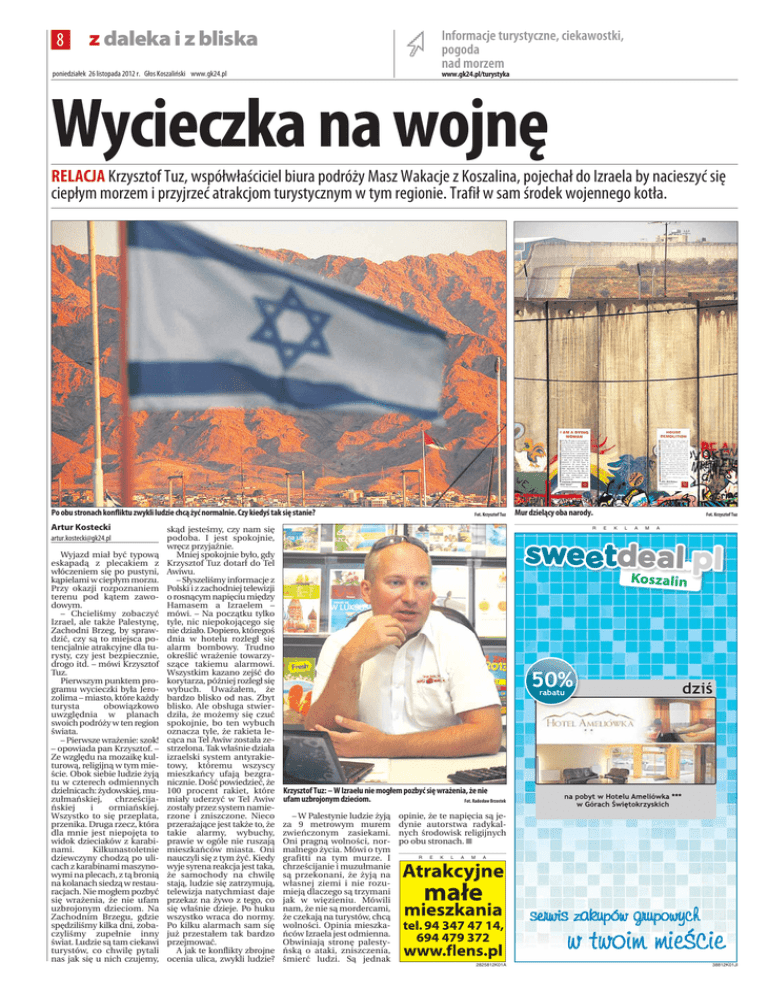 8 Informacje turystyczne, ciekawostki, pogoda nad morzem z daleka i z bliska poniedziałek 26 listopada 2012 r. Głos Koszaliński www.gk24.pl www.gk24.pl/turystyka Wycieczka na wojnę RELACJA Krzysztof Tuz, współwłaściciel biura podróży Masz Wakacje z Koszalina, pojechał do Izraela by nacieszyć się ciepłym morzem i przyjrzeć atrakcjom turystycznym w tym regionie. Trafił w sam środek wojennego kotła. Po obu stronach konfliktu zwykli ludzie chcą żyć normalnie. Czy kiedyś tak się stanie? Artur Kostecki [email protected] Wyjazd miał być typową eskapadą z plecakiem z włóczeniem się po pustyni, kąpielami w ciepłym morzu. Przy okazji rozpoznaniem terenu pod kątem zawodowym. – Chcieliśmy zobaczyć Izrael, ale także Palestynę, Zachodni Brzeg, by sprawdzić, czy są to miejsca potencjalnie atrakcyjne dla turysty, czy jest bezpiecznie, drogo itd. – mówi Krzysztof Tuz. Pierwszym punktem programu wycieczki była Jerozolima – miasto, które każdy turysta obowiązkowo uwzględnia w planach swoich podróży w ten region świata. – Pierwsze wrażenie: szok! – opowiada pan Krzysztof. – Ze względu na mozaikę kulturową, religijną w tym mieście. Obok siebie ludzie żyją tu w czterech odmiennych dzielnicach: żydowskiej, muzułmańskiej, chrześcijańskiej i ormiańskiej. Wszystko to się przeplata, przenika. Druga rzecz, która dla mnie jest niepojęta to widok dzieciaków z karabinami. Kilkunastoletnie dziewczyny chodzą po ulicach z karabinami maszynowymi na plecach, z tą bronią na kolanach siedzą w restauracjach. Nie mogłem pozbyć się wrażenia, że nie ufam uzbrojonym dzieciom. Na Zachodnim Brzegu, gdzie spędziliśmy kilka dni, zobaczyliśmy zupełnie inny świat. Ludzie są tam ciekawi turystów, co chwilę pytali nas jak się u nich czujemy, skąd jesteśmy, czy nam się podoba. I jest spokojnie, wręcz przyjaźnie. Mniej spokojnie było, gdy Krzysztof Tuz dotarł do Tel Awiwu. – Słyszeliśmy informacje z Polski i z zachodniej telewizji o rosnącym napięciu między Hamasem a Izraelem – mówi. – Na początku tylko tyle, nic niepokojącego się nie działo. Dopiero, któregoś dnia w hotelu rozległ się alarm bombowy. Trudno określić wrażenie towarzyszące takiemu alarmowi. Wszystkim kazano zejść do korytarza, później rozległ się wybuch. Uważałem, że bardzo blisko od nas. Zbyt blisko. Ale obsługa stwierdziła, że możemy się czuć spokojnie, bo ten wybuch oznacza tyle, że rakieta lecąca na Tel Awiw została zestrzelona. Tak właśnie działa izraelski system antyrakietowy, któremu wszyscy mieszkańcy ufają bezgranicznie. Dość powiedzieć, że 100 procent rakiet, które miały uderzyć w Tel Awiw zostały przez system namierzone i zniszczone. Nieco przerażające jest także to, że takie alarmy, wybuchy, prawie w ogóle nie ruszają mieszkańców miasta. Oni nauczyli się z tym żyć. Kiedy wyje syrena reakcja jest taka, że samochody na chwilę stają, ludzie się zatrzymują, telewizja natychmiast daje przekaz na żywo z tego, co się właśnie dzieje. Po huku wszystko wraca do normy. Po kilku alarmach sam się już przestałem tak bardzo przejmować. A jak te konflikty zbrojne ocenia ulica, zwykli ludzie? Fot. Krzysztof Tuz Mur dzielący oba narody. R Fot. Krzysztof Tuz E K L A M A Krzysztof Tuz: – W Izraelu nie mogłem pozbyć się wrażenia, że nie ufam uzbrojonym dzieciom. Fot. Radosław Brzostek – W Palestynie ludzie żyją za 9 metrowym murem zwieńczonym zasiekami. Oni pragną wolności, normalnego życia. Mówi o tym grafitti na tym murze. I chrześcijanie i muzułmanie są przekonani, że żyją na własnej ziemi i nie rozumieją dlaczego są trzymani jak w więzieniu. Mówili nam, że nie są mordercami, że czekają na turystów, chcą wolności. Opinia mieszkańców Izraela jest odmienna. Obwiniają stronę palestyńską o ataki, zniszczenia, śmierć ludzi. Są jednak opinie, że te napięcia są jedynie autorstwa radykalnych środowisk religijnych po obu stronach. d R E K L A M A 2825812K01A 38812K01JI