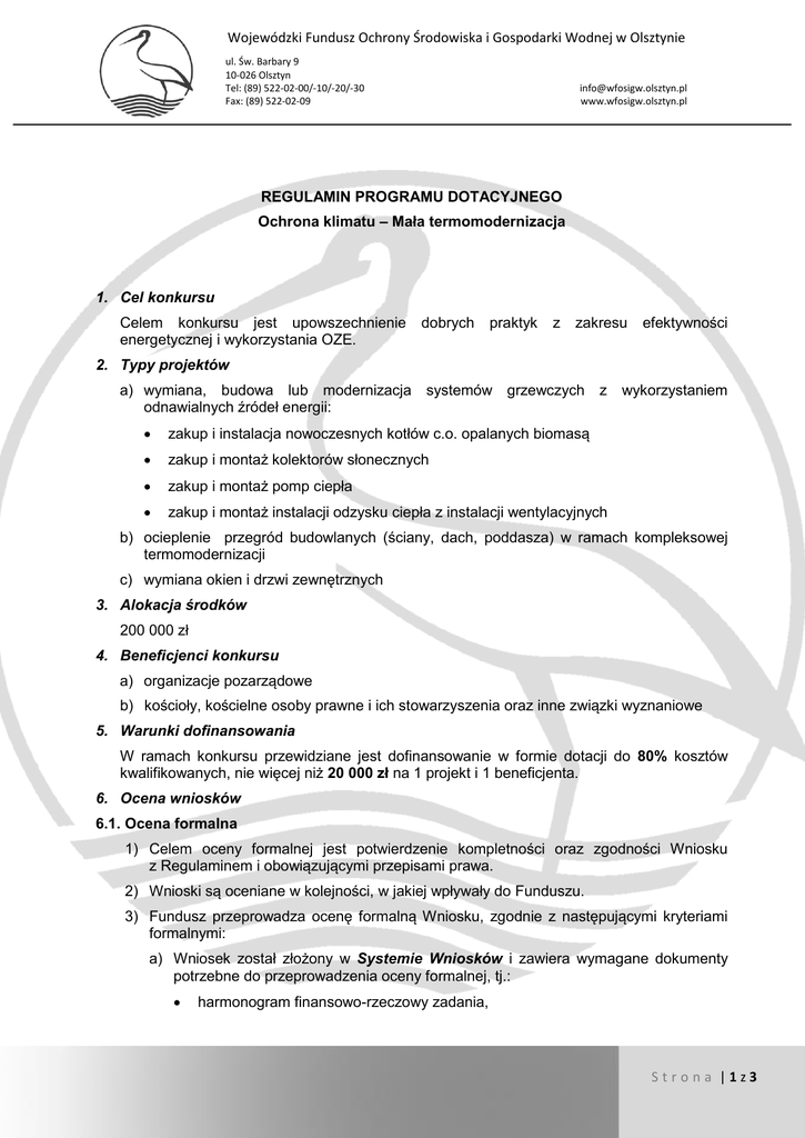 Wojewódzki Fundusz Ochrony Środowiska i Gospodarki Wodnej w Olsztynie ul. Św. Barbary 9 10-026 Olsztyn Tel: (89) 522-02-00/-10/-20/-30 Fax: (89) 522-02-09 [email protected] www.wfosigw.olsztyn.pl REGULAMIN PROGRAMU DOTACYJNEGO Ochrona klimatu – Mała termomodernizacja 1. Cel konkursu Celem konkursu jest upowszechnienie energetycznej i wykorzystania OZE. dobrych praktyk z zakresu efektywności 2. Typy projektów a) wymiana, budowa lub modernizacja systemów grzewczych z wykorzystaniem odnawialnych źródeł energii: zakup i instalacja nowoczesnych kotłów c.o. opalanych biomasą zakup i montaż kolektorów słonecznych zakup i montaż pomp ciepła zakup i montaż instalacji odzysku ciepła z instalacji wentylacyjnych b) ocieplenie przegród budowlanych (ściany, dach, poddasza) w ramach kompleksowej termomodernizacji c) wymiana okien i drzwi zewnętrznych 3. Alokacja środków 200 000 zł 4. Beneficjenci konkursu a) organizacje pozarządowe b) kościoły, kościelne osoby prawne i ich stowarzyszenia oraz inne związki wyznaniowe 5. Warunki dofinansowania W ramach konkursu przewidziane jest dofinansowanie w formie dotacji do 80% kosztów kwalifikowanych, nie więcej niż 20 000 zł na 1 projekt i 1 beneficjenta. 6. Ocena wniosków 6.1. Ocena formalna 1) Celem oceny formalnej jest potwierdzenie kompletności oraz zgodności Wniosku z Regulaminem i obowiązującymi przepisami prawa. 2) Wnioski są oceniane w kolejności, w jakiej wpływały do Funduszu. 3) Fundusz przeprowadza ocenę formalną Wniosku, zgodnie z następującymi kryteriami formalnymi: a) Wniosek został złożony w Systemie Wniosków i zawiera wymagane dokumenty potrzebne do przeprowadzenia oceny formalnej, tj.: harmonogram finansowo-rzeczowy zadania, Strona |1z3 Wojewódzki Fundusz Ochrony Środowiska i Gospodarki Wodnej w Olsztynie ul. Św. Barbary 9 10-026 Olsztyn Tel: (89) 522-02-00/-10/-20/-30 Fax: (89) 522-02-09 [email protected] www.wfosigw.olsztyn.pl aktualne zaświadczenie z Urzędu Marszałkowskiego o wywiązywaniu się z należnych opłat za korzystanie ze środowiska (ważne 3 m-ce od daty wystawienia), oświadczenie Wnioskodawcy o kwalifikowalności podatku VAT. b) Dodatkowo Wnioskodawca w części techniczno-ekologicznej Wniosku przedstawi dane umożliwiające przeprowadzenie oceny merytorycznej. 4) Ocena formalna jest oceną „0/1”, co oznacza, że niespełnienie jednego z warunków formalnych, powoduje odrzucenie Wniosku z dalszej procedury. 5) Wniosek może zostać odrzucony na etapie oceny formalnej z uwagi na: błędy formalne, niepodlegające uzupełnieniu lub poprawie, niedostarczenie wymaganych dokumentów w wyznaczonym terminie oraz wprowadzenie dodatkowych zmian we Wniosku i załącznikach nie informując o tym fakcie Funduszu. 6) Fundusz na etapie oceny formalnej dopuszcza jedną poprawkę złożonego Wniosku. Wszelkie zmiany możliwe są w ciągu 5 dni kalendarzowych od daty cofnięcia Wniosku do edycji w Systemie Wniosków. 7) W przypadku wystąpienia okoliczności, gdy Wnioskodawca nie dostarczy uzupełnienia w terminie wskazanym przez Regulamin lub nie dokona uzupełnienia wszystkich elementów Wniosku i załączników wskazanych w informacji wygenerowanej w Systemie Wniosków, Wniosek zostanie odrzucony, a Fundusz informuje Wnioskodawcę o wyłączeniu Wniosku z dalszego rozpatrywania. 8) Wniosek, który przeszedł pozytywnie ocenę formalną, przekazywany jest do oceny merytorycznej. 6.2 Ocena merytoryczna 1) Ocena merytoryczna odbywa się w oparciu o poniższe kryteria. Parametr Zgodność z Listą Przedsięwzięć Priorytetowych Zgodność z celami ustawy – Prawo ochrony środowiska Zgodność z obowiązującymi Zasadami WFOŚiGW Lokalizacja zadania na obszarze NATURA 2000 Zadanie realizowane w ramach: a) Energetycznego wykorzystania Odnawialnych Źródeł Energii b) Produkcji energii w kogeneracji z wykorzystaniem Odnawialnych Źródeł Energii c) Termomodernizacji i pozostałych zadań Maksymalna liczba punktów Liczba pkt. TAK 1 1 NIE 0 0 1 1 0 0 a) 0-3 a) 0 b) 0-3 b) 0 c) 0-2 12 c) 0 0 2) Na podstawie wyników oceny merytorycznej tworzona jest lista rankingowa projektów, którą zatwierdza Zarząd Funduszu. 7. Termin naboru wniosków o dofinansowanie 1) Wnioski należy składać w terminie do dnia 04.03.2016 r. (piątek) do godziny 15.30. 2) Wnioski należy składać wyłącznie elektronicznie w Systemie Wniosków – liczy się data wysłania Wniosku w Systemie. 3) Wnioski, które wpłyną po wyznaczonym terminie nie będą rozpatrywane. Strona |2z3 Wojewódzki Fundusz Ochrony Środowiska i Gospodarki Wodnej w Olsztynie ul. Św. Barbary 9 10-026 Olsztyn Tel: (89) 522-02-00/-10/-20/-30 Fax: (89) 522-02-09 [email protected] www.wfosigw.olsztyn.pl 8. Postanowienia końcowe 1) W kwestiach nieobjętych niniejszym Regulaminem, obowiązują zapisy Regulaminu programów dotacyjnych oraz Zasad udzielania i umarzania pożyczek, udzielania dotacji oraz dopłat do oprocentowania kredytów i pożyczek ze środków Wojewódzkiego Funduszu Ochrony Środowiska i Gospodarki Wodnej w Olsztynie na rok 2016. 2) Dokumentacja (w szczególności Wnioski) służy wyłącznie do użytku służbowego Funduszu oraz podmiotów uprawnionych do przeprowadzenia kontroli. 9. Osoba do kontaktu Anna Granacka tel. (089) 522-02-12, e-mail: [email protected], Strona |3z3