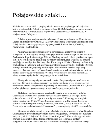Połajewskie szlaki… W dniu 9 czerwca 2012 r. przybędzie do mnie z wizytą kolega z Grecji- Max, który przyjechał do Polski w związku z Euro 2012. Mieszkam w malowniczym województwie wielkopolskim, w powiecie czarnkowsko- trzcianeckim, w miejscowości Połajewo. Połajewo jest miejscowością położoną 18 km na południe od Czarnkowa. Liczba mieszkańców wynosi 2512. Prawdopodobnie właściciel wsi miał na imię Połaj. Bardzo interesujące są nazwy połajewskich ziem: Baba, Grafina, Królewskie i Podbudzina. Naszą wycieczkę rozpoczniemy od zwiedzania ciekawych miejsc w Połajewie. Na szczególną uwagę zasługuje kościół parafialny p. w. św. Michała Archanioła. Jego historia sięga XIX w. Według ustnych relacji parafian, w lipcu 1967 r. w tym kościele modlił się ówczesny biskup Karol Wojtyła. W środku znajdują się rzeźby: św. Barbary i św. Katarzyny z 1620 r. Ciekawą osobistością pochodzącą z Połajewa jest arcybiskup metropolita poznański- Walenty Dymek, którego pomnik znajduje się obok wejścia do kościoła. Oprócz tego przy tryptyku ,,Pokłon pasterzy’’ co roku odbywają się spotkania dudziarzy. Jest to bardzo interesujące wydarzenie. Wielkie wrażenie robi również pomnik ,,Z wiarą w nowe tysiąclecie’’ znajdujący się za kościołem. Następnie udamy się na spacer do parku. Znajduje się tam amfiteatr, w którym odbywają się różne imprezy. W parku jest także wiele imponujących wielkością drzew. Po spacerze pójdziemy do restauracji ,,Gorzelnia 505’’, która oprócz pięknego i przestronnego wnętrza oferuje pyszne jedzenie. Kolejnym punktem naszej wycieczki będzie wizyta w mojej szkole. Gimnazjum w Połajewie zostało wybudowane w 1997 r., a więc jak łatwo policzyć- ma dziś 15 lat. Oprócz szkoły warto zwrócić uwagę na kompleks boisk sportowych Orlik. Wraz z Maxem pogramy w piłkę nożną. Połajewo posiada swój klub piłki nożnej o nazwie ,,Płomień’’, który powstał w 1975 r. Przez cały okres działalności ,,Płomienia’’ przewinęło się ok. 800 zawodników. Ostatnią atrakcją naszej wyprawy będzie wizyta u mojego wujka, Bogdana Garsteckiego. Był on nauczycielem języka rosyjskiego, a obecnie jest autorem książek: ,,Moje Połajewo’’ i ,,Słownictwo Połajewa’’. Zna wiele legend, które opowie mojemu koledze. Bardzo interesująca jest legenda o ciotach połąjewskich, które mieszkały pod wiatrakiem należącym do Niemca Torny. Znajdował się on na Tornowej Górce- najwyższym punkcie miejscowości. Cioty zastraszały ludzi przybierając postać kotów. Strach przed nimi jest żywy do dnia dzisiejszego. Co roku na Tornowej Górce odbywają się zloty ciot połajewskich, na których poprzebierane za nie kobiety śpiewają i odprawiają swoje czary. Inna legenda dotyczy czarnego psa z czerwonymi oczami, który straszył ludzi przechodzących przez ulicę. Są też legendy zabawne, na przykład legenda o dziewczynie, która przestraszyła się pieca chlebowego, w którym nie pieczono nic od 7 lat. Później okazało się, że w piecu rosną pokrzywy. Postanowiłam nauczyć Maxa również kilku ciekawych i zabawnych słów oraz wyrażeń, których w Połajewie używa się na co dzień, np. drzeć kalafę (krzyczeć), kupa lumpów a chłopa ni ma (o kimś bardzo chudym), patrzeć jak byk na małą pyrę (patrzeć na coś ze zdziwieniem, politowaniem), tyle co z łapy do papy (o kimś nieoszczędnym), szastać bejmami (trwonić pieniądze). Maxowi spodobały się słowa: blubrać (gadać głupoty), betka (grzyb), fefry (strach), gnyk (kark), jaka (koszula), klapioki (duże uszy), papa (twarz), rzympolić (źle grać na skrzypcach), rakieta (tyłek) i świeci- baka (lizus, pochlebca). Po wycieczce wybierzemy się razem na mecz do Poznania. Ja i Max zawzięcie będziemy kibicować naszym drużynom. Sylwia Marszałek