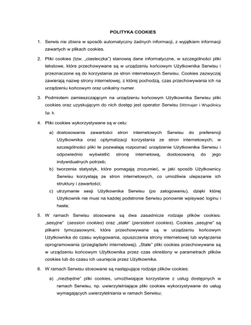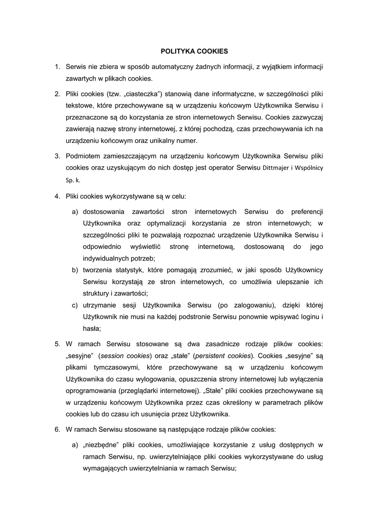 POLITYKA COOKIES 1. Serwis nie zbiera w sposób automatyczny żadnych informacji, z wyjątkiem informacji zawartych w plikach cookies. 2. Pliki cookies (tzw. „ciasteczka”) stanowią dane informatyczne, w szczególności pliki tekstowe, które przechowywane są w urządzeniu końcowym Użytkownika Serwisu i przeznaczone są do korzystania ze stron internetowych Serwisu. Cookies zazwyczaj zawierają nazwę strony internetowej, z której pochodzą, czas przechowywania ich na urządzeniu końcowym oraz unikalny numer. 3. Podmiotem zamieszczającym na urządzeniu końcowym Użytkownika Serwisu pliki cookies oraz uzyskującym do nich dostęp jest operator Serwisu Dittmajer i Wspólnicy Sp. k. 4. Pliki cookies wykorzystywane są w celu: a) dostosowania zawartości stron internetowych Serwisu do preferencji Użytkownika oraz optymalizacji korzystania ze stron internetowych; w szczególności pliki te pozwalają rozpoznać urządzenie Użytkownika Serwisu i odpowiednio wyświetlić stronę internetową, dostosowaną do jego indywidualnych potrzeb; b) tworzenia statystyk, które pomagają zrozumieć, w jaki sposób Użytkownicy Serwisu korzystają ze stron internetowych, co umożliwia ulepszanie ich struktury i zawartości; c) utrzymanie sesji Użytkownika Serwisu (po zalogowaniu), dzięki której Użytkownik nie musi na każdej podstronie Serwisu ponownie wpisywać loginu i hasła; 5. W ramach Serwisu stosowane są dwa zasadnicze rodzaje plików cookies: „sesyjne” (session cookies) oraz „stałe” (persistent cookies). Cookies „sesyjne” są plikami tymczasowymi, które przechowywane są w urządzeniu końcowym Użytkownika do czasu wylogowania, opuszczenia strony internetowej lub wyłączenia oprogramowania (przeglądarki internetowej). „Stałe” pliki cookies przechowywane są w urządzeniu końcowym Użytkownika przez czas określony w parametrach plików cookies lub do czasu ich usunięcia przez Użytkownika. 6. W ramach Serwisu stosowane są następujące rodzaje plików cookies: a) „niezbędne” pliki cookies, umożliwiające korzystanie z usług dostępnych w ramach Serwisu, np. uwierzytelniające pliki cookies wykorzystywane do usług wymagających uwierzytelniania w ramach Serwisu; b) pliki cookies służące do zapewnienia bezpieczeństwa, np. wykorzystywane do wykrywania nadużyć w zakresie uwierzytelniania w ramach Serwisu; c) „wydajnościowe” pliki cookies, umożliwiające zbieranie informacji o sposobie korzystania ze stron internetowych Serwisu; d) „funkcjonalne” pliki cookies, umożliwiające „zapamiętanie” wybranych przez Użytkownika ustawień i personalizację interfejsu Użytkownika, np. w zakresie wybranego języka lub regionu, z którego pochodzi Użytkownik, rozmiaru czcionki, wyglądu strony internetowej itp.; e) „reklamowe” pliki cookies, umożliwiające dostarczanie Użytkownikom treści reklamowych bardziej dostosowanych do ich zainteresowań. 7. W wielu przypadkach oprogramowanie służące do przeglądania stron internetowych (przeglądarka internetowa) domyślnie dopuszcza przechowywanie plików cookies w urządzeniu końcowym Użytkownika. Użytkownicy Serwisu mogą dokonać w każdym czasie zmiany ustawień dotyczących plików cookies. Ustawienia te mogą zostać zmienione w szczególności w taki sposób, aby blokować automatyczną obsługę plików cookies w ustawieniach przeglądarki internetowej bądź informować o ich każdorazowym zamieszczeniu w urządzeniu Użytkownika Serwisu. Szczegółowe informacje o możliwości i sposobach obsługi plików cookies dostępne są w ustawieniach oprogramowania (przeglądarki internetowej). 8. Operator Serwisu informuje, że ograniczenia stosowania plików cookies mogą wpłynąć na niektóre funkcjonalności dostępne na stronach internetowych Serwisu. 9. Pliki cookies zamieszczane w urządzeniu końcowym Użytkownika Serwisu i wykorzystywane mogą być również przez współpracujących z operatorem Serwisu reklamodawców oraz partnerów. 10. Więcej informacji na temat plików cookies dostępnych jest w sekcji „Pomoc” w menu przeglądarki internetowej.