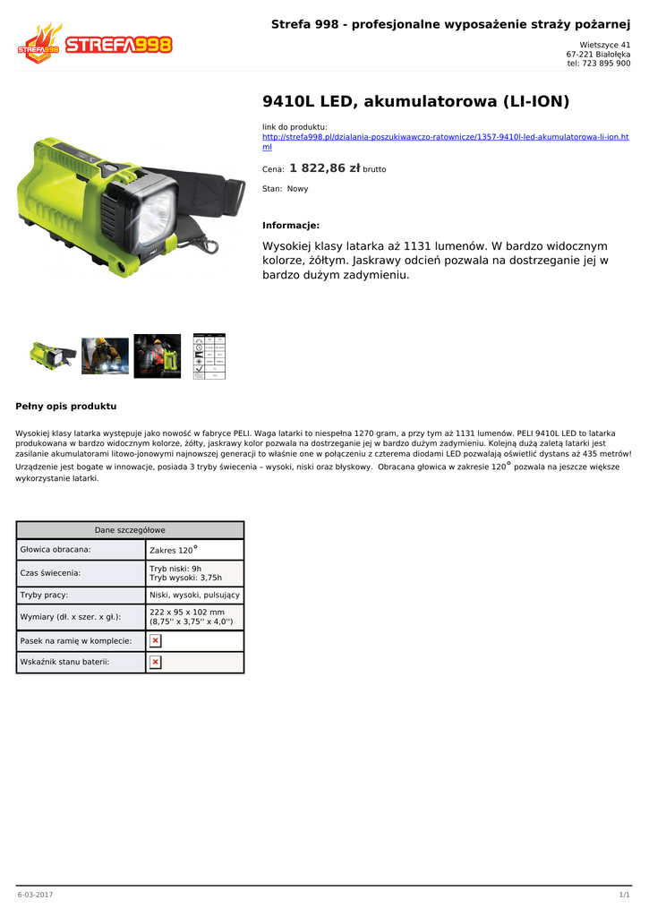 Strefa 998 - profesjonalne wyposażenie straży pożarnej Wietszyce 41 67-221 Białołęka tel: 723 895 900 9410L LED, akumulatorowa (LI-ION) link do produktu: http://strefa998.pl/dzialania-poszukiwawczo-ratownicze/1357-9410l-led-akumulatorowa-li-ion.ht ml Cena: 1 822,86 zł brutto Stan: Nowy Informacje: Wysokiej klasy latarka aż 1131 lumenów. W bardzo widocznym kolorze, żółtym. Jaskrawy odcień pozwala na dostrzeganie jej w bardzo dużym zadymieniu. Pełny opis produktu Wysokiej klasy latarka występuje jako nowość w fabryce PELI. Waga latarki to niespełna 1270 gram, a przy tym aż 1131 lumenów. PELI 9410L LED to latarka produkowana w bardzo widocznym kolorze, żółty, jaskrawy kolor pozwala na dostrzeganie jej w bardzo dużym zadymieniu. Kolejną dużą zaletą latarki jest zasilanie akumulatorami litowo-jonowymi najnowszej generacji to właśnie one w połączeniu z czterema diodami LED pozwalają oświetlić dystans aż 435 metrów! Urządzenie jest bogate w innowacje, posiada 3 tryby świecenia – wysoki, niski oraz błyskowy. Obracana głowica w zakresie 120° pozwala na jeszcze większe wykorzystanie latarki. Dane szczegółowe Głowica obracana: Zakres 120° Czas świecenia: Tryb niski: 9h Tryb wysoki: 3,75h Tryby pracy: Niski, wysoki, pulsujący Wymiary (dł. x szer. x gł.): 222 x 95 x 102 mm (8,75'' x 3,75'' x 4,0'') Pasek na ramię w komplecie: Wskaźnik stanu baterii: 6-03-2017 1/1