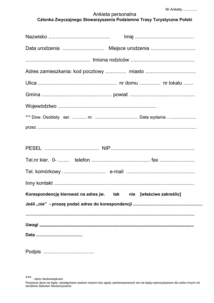 Nr Ankiety .............. Ankieta personalna Członka Zwyczajnego Stowarzyszenia Podziemne Trasy Turystyczne Polski Nazwisko ............................................ Imię .......................................... Data urodzenia .............................. Miejsce urodzenia ................................ .............................................. Imiona rodziców .............................................. Adres zamieszkania: kod pocztowy ............... miasto .................................... Ulica ........................................................ nr domu ............... nr lokalu ....... Gmina .................................................. powiat ............................................... Województwo ...................................................................... *** Dow. Osobisty ser. …......... nr. .................................... Data wydania …..................... przez ..................................................................................................................................... PESEL ....................................... NIP............................................................ Tel.nr kier. 0- ........ telefon .......................................... fax ......................... Tel. komórkowy ............................... e-mail ................................................. Inny kontakt .................................................................................................... Korespondencję kierować na adres jw. tak nie [właściwe zakreślic] Jeśli „nie” - proszę podać adres do korespondencji .......................................................... ............................................................................................................................................. Uwagi ,,,,,,,,,,,,,,,,,,,,,,,,,,,,,,,,,,,,,,,,,,,,,,,,,,,,,,,,,,,,,,,,,,,,,,,,,,,,,,,,,,,,,,,,,,,,,,,,,,,,,,,,,,,,,,,,,,,,,,,,,,,,,,,,, Data ....................................... Podpis .................................... *** - dane nieobowiązkowe Powyższe dane nie będą udostępniane osobom trzecim bez zgody zainteresowanych ani nie będą wykorzystywane dla celów innych niż określone Statutem Stowarzyszenia