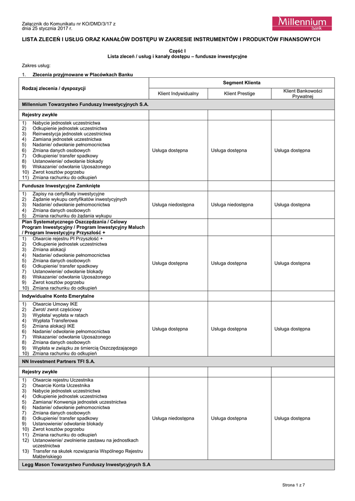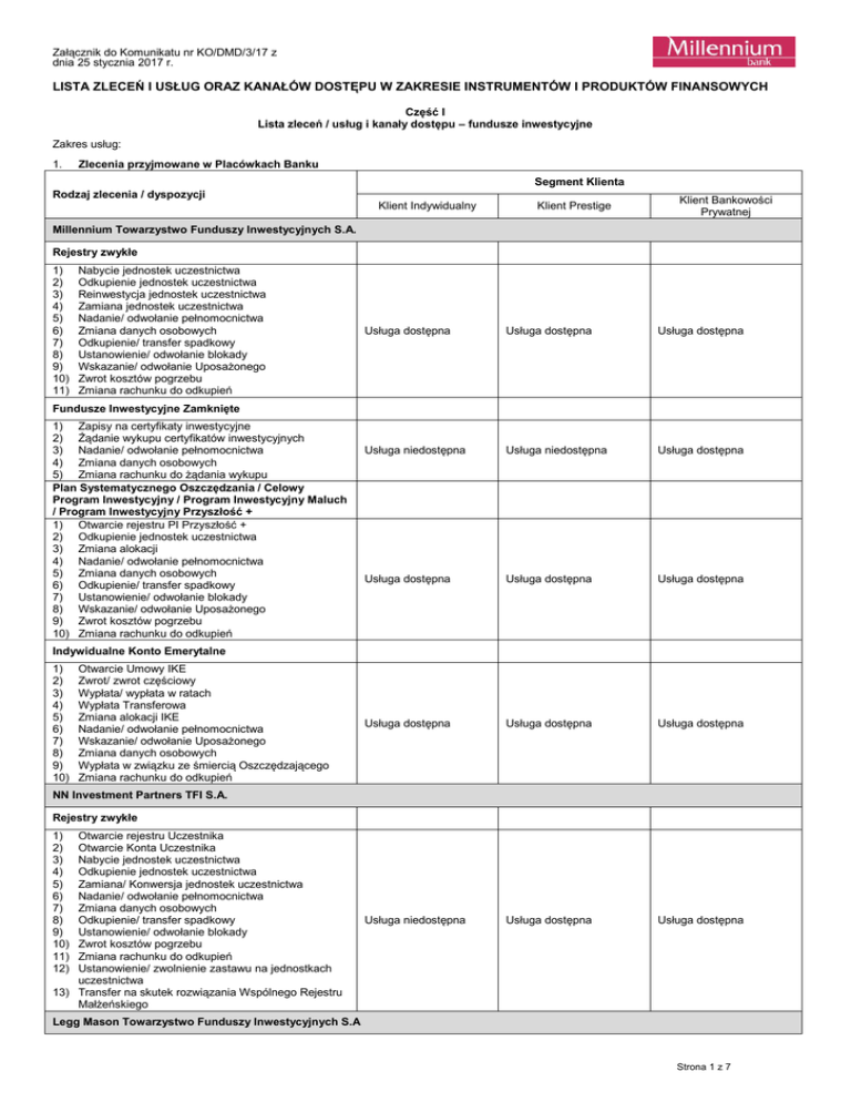Załącznik do Komunikatu nr KO/DMD/3/17 z dnia 25 stycznia 2017 r. LISTA ZLECEŃ I USŁUG ORAZ KANAŁÓW DOSTĘPU W ZAKRESIE INSTRUMENTÓW I PRODUKTÓW FINANSOWYCH Część I Lista zleceń / usług i kanały dostępu – fundusze inwestycyjne Zakres usług: 1. Zlecenia przyjmowane w Placówkach Banku Segment Klienta Rodzaj zlecenia / dyspozycji Klient Indywidualny Klient Prestige Klient Bankowości Prywatnej Millennium Towarzystwo Funduszy Inwestycyjnych S.A. Rejestry zwykłe 1) 2) 3) 4) 5) 6) 7) 8) 9) 10) 11) Nabycie jednostek uczestnictwa Odkupienie jednostek uczestnictwa Reinwestycja jednostek uczestnictwa Zamiana jednostek uczestnictwa Nadanie/ odwołanie pełnomocnictwa Zmiana danych osobowych Odkupienie/ transfer spadkowy Ustanowienie/ odwołanie blokady Wskazanie/ odwołanie Uposażonego Zwrot kosztów pogrzebu Zmiana rachunku do odkupień Usługa dostępna Usługa dostępna Usługa dostępna Usługa niedostępna Usługa niedostępna Usługa dostępna Usługa dostępna Usługa dostępna Usługa dostępna Usługa dostępna Usługa dostępna Usługa dostępna Usługa niedostępna Usługa dostępna Usługa dostępna Fundusze Inwestycyjne Zamknięte 1) Zapisy na certyfikaty inwestycyjne 2) Żądanie wykupu certyfikatów inwestycyjnych 3) Nadanie/ odwołanie pełnomocnictwa 4) Zmiana danych osobowych 5) Zmiana rachunku do żądania wykupu Plan Systematycznego Oszczędzania / Celowy Program Inwestycyjny / Program Inwestycyjny Maluch / Program Inwestycyjny Przyszłość + 1) Otwarcie rejestru PI Przyszłość + 2) Odkupienie jednostek uczestnictwa 3) Zmiana alokacji 4) Nadanie/ odwołanie pełnomocnictwa 5) Zmiana danych osobowych 6) Odkupienie/ transfer spadkowy 7) Ustanowienie/ odwołanie blokady 8) Wskazanie/ odwołanie Uposażonego 9) Zwrot kosztów pogrzebu 10) Zmiana rachunku do odkupień Indywidualne Konto Emerytalne 1) 2) 3) 4) 5) 6) 7) 8) 9) 10) Otwarcie Umowy IKE Zwrot/ zwrot częściowy Wypłata/ wypłata w ratach Wypłata Transferowa Zmiana alokacji IKE Nadanie/ odwołanie pełnomocnictwa Wskazanie/ odwołanie Uposażonego Zmiana danych osobowych Wypłata w związku ze śmiercią Oszczędzającego Zmiana rachunku do odkupień NN Investment Partners TFI S.A. Rejestry zwykłe 1) 2) 3) 4) 5) 6) 7) 8) 9) 10) 11) 12) Otwarcie rejestru Uczestnika Otwarcie Konta Uczestnika Nabycie jednostek uczestnictwa Odkupienie jednostek uczestnictwa Zamiana/ Konwersja jednostek uczestnictwa Nadanie/ odwołanie pełnomocnictwa Zmiana danych osobowych Odkupienie/ transfer spadkowy Ustanowienie/ odwołanie blokady Zwrot kosztów pogrzebu Zmiana rachunku do odkupień Ustanowienie/ zwolnienie zastawu na jednostkach uczestnictwa 13) Transfer na skutek rozwiązania Wspólnego Rejestru Małżeńskiego Legg Mason Towarzystwo Funduszy Inwestycyjnych S.A Strona 1 z 7 Fundusze Inwestycyjne Otwarte (rejestry zwykłe/ Celowy Plan Oszczędnościowy) 1) 2) 3) 4) 5) 6) 7) 8) 9) 10) 11) 12) 13) 14) 15) 16) Otwarcie rejestru Uczestnika Nabycie jednostek uczestnictwa Odkupienie jednorazowe/ systematyczne jednostek uczestnictwa Odwołanie odkupienia systematycznego Reinwestycja jednostek uczestnictwa Transfer Zamiana/ Konwersja jednostek uczestnictwa Nadanie/ odwołanie pełnomocnictwa Zmiana danych osobowych Odkupienie/ transfer spadkowy Ustanowienie/ odwołanie blokady Wskazanie/ odwołanie Uposażonego Zwrot kosztów pogrzebu Zmiana rachunku do odkupień Ustanowienie/ zwolnienie zastawu na jednostkach uczestnictwa Zamknięcie Rejestru Usługa niedostępna Usługa dostępna Usługa dostępna Usługa niedostępna Usługa dostępna Usługa dostępna Usługa niedostępna Usługa dostępna Usługa dostępna Usługa niedostępna Usługa dostępna Usługa dostępna Usługa niedostępna Usługa niedostępna Usługa dostępna Fundusze Inwestycyjne Zamknięte 1) 2) 3) 4) 5) Zapisy na certyfikaty inwestycyjne Żądanie wykupu certyfikatów inwestycyjnych Nadanie/ odwołanie pełnomocnictwa Zmiana danych osobowych Zmiana rachunku do żądania wykupu Investors Towarzystwo Funduszy Inwestycyjnych S.A. Rejestry zwykłe 1) 2) 3) 4) 5) 6) 7) 8) 9) 10) 11) 12) 13) 14) Otwarcie rejestru Uczestnika Nabycie jednostek uczestnictwa Odkupienie jednostek uczestnictwa Reinwestycja jednostek uczestnictwa Transfer Zamiana/ Konwersja jednostek uczestnictwa Nadanie/ odwołanie pełnomocnictwa Zmiana danych osobowych Odkupienie / transfer spadkowy Ustanowienie/ odwołanie blokady Wskazanie/ odwołanie Uposażonego Zwrot kosztów pogrzebu Zmiana rachunku do odkupień Ustanowienie/ zwolnienie zastawu na jednostkach uczestnictwa BlackRock Investment Management Limited Rejestry zwykłe 1) 2) 3) 4) 5) 6) 7) 8) 9) Otwarcie uczestnictwa i pierwsze nabycie Nabycie tytułów uczestnictwa Odkupienie tytułów uczestnictwa Zamiana tytułów uczestnictwa Transfer Nadanie/ odwołanie pełnomocnictwa Zmiana danych osobowych Odkupienie/ transfer spadkowy Zmiana rachunku do odkupień Quercus Towarzystwo Funduszy Inwestycyjnych S.A. Rejestry zwykłe 1) 2) 3) 4) 5) 6) 7) 8) 9) 10) 11) 12) 13) 14) Otwarcie Konta Uczestnika Otwarcie Rejestru Uczestnika Nabycie jednostek uczestnictwa Odkupienie jednostek uczestnictwa Zamiana/Konwersja jednostek uczestnictwa Nadanie/ odwołanie pełnomocnictwa Zmiana danych osobowych Odkupienie / transfer spadkowy Ustanowienie/ odwołanie blokady Wskazanie/ odwołanie Uposażonego Zwrot kosztów pogrzebu Zmiana rachunku do odkupień Ustanowienie/zmiana/odwołanie uposażonego Transfer na skutek ustania wspólności majątkowej 2. Zlecenia przyjmowane odpowiednio dla Segmentu Klienta za pośrednictwem Linii Prestige / Linii Bankowości Prywatnej / TeleMillennium w ramach korzystania z Kanałów Bankowości Elektronicznej, z zastrzeżeniem, iż realizacja poniższych zleceń uzależniona jest od ustanowienia przez Klienta odpowiednio - Pełnomocnictwa dla Banku Millennium SA – Bankowość Prywatna/ Prestige. Strona 2 z 7 Segment Klienta Rodzaj zlecenia / dyspozycji Klient Indywidualny Klient Prestige Klient Bankowości Prywatnej M