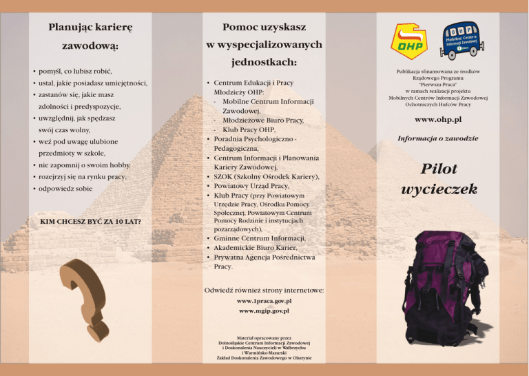 Planuj¹c karierê Pomoc uzyskasz zawodow¹: w wyspecjalizowanych jednostkach: • pomyœl, co lubisz robiæ, • ustal, jakie posiadasz umiejêtnoœci, • zastanów siê, jakie masz zdolnoœci i predyspozycje, • uwzglêdnij, jak spêdzasz swój czas wolny, • weŸ pod uwagê ulubione przedmioty w szkole, • nie zapomnij o swoim hobby, • rozejrzyj siê na rynku pracy, • odpowiedz sobie KIM CHCESZ BYÆ ZA 10 LAT? • Centrum Edukacji i Pracy M³odzie¿y OHP: - Mobilne Centrum Informacji Zawodowej, - M³odzie¿owe Biuro Pracy, - Klub Pracy OHP, • Poradnia Psychologiczno Pedagogiczna, • Centrum Informacji i Planowania Kariery Zawodowej, • SZOK (Szkolny Oœrodek Kariery), • Powiatowy Urz¹d Pracy, • Klub Pracy (przy Powiatowym Urzêdzie Pracy, Oœrodku Pomocy Spo³ecznej, Powiatowym Centrum Pomocy Rodzinie i instytucjach pozarz¹dowych), • Gminne Centrum Informacji, • Akademickie Biuro Karier, • Prywatna Agencja Poœrednictwa Pracy. OdwiedŸ równie¿ strony internetowe: www.1praca.gov.pl www.mgip.gov.pl Materia³ opracowany przez Dolnoœl¹skie Centrum Informacji Zawodowej i Doskonalenia Nauczycieli w Wa³brzychu i Warmiñsko-Mazurski Zak³ad Doskonalenia Zawodowego w Olsztynie Publikacja sfinansowana ze œrodków Rz¹dowego Programu "Pierwsza Praca" w ramach realizacji projektu Mobilnych Centrów Informacji Zawodowej Ochotniczych Hufców Pracy www.ohp.pl Informacja o zawodzie Pilot wycieczek Funkcje i zadania: Predyspozycje do zawodu: • Nadzoruje realizacjê za³o¿onego programu pobytu lub objazdu turystycznego, przygotowanego przez biuro podró¿y i zaakceptowanego przez jej uczestników; • samodzielnoœæ i umiejêtnoœæ organizacji pracy; •komunikatywnoœæ: kontakty z innymi ludŸmi s¹ bardzo intensywne i niezbêdne; • Sprawuje opiekê nad uczestnikami imprezy przyjazdowej (pilotowanie turystów zagranicznych) oraz wyjazdowej (pilotowanie turystów krajowych); • odpornoœæ psychiczna: cech¹ pracy pilota wycieczek jest ryzyko powstawania sytuacji konfliktowych; • Zobowi¹zany jest do sta³ej opieki nad grup¹ i ci¹g³ego informowania uczestników o wszystkich szczegó³ach wycieczki; • cierpliwoœæ: musi wci¹¿ odpowiadaæ na wiele pytañ uczestników wycieczki i czêsto wystêpowaæ w roli ich doradcy; • Pilot jest tzw. "administratorem" wycieczki: sprawuje pieczê nad wszystkimi dokumentami wyjazdowymi, takimi jak bilety czy vouchery; • erudycja: niezbêdna jest znajomoœæ jêzyków obcych (oraz orientacja w wielu innych dziedzinach, takich jak: historia, kultura i sztuka, geografia, polityka); •Reprezentuje grupê w miejscach jej pobytu, np. w hotelach, restauracjach, galeriach, muzeach; • odpowiedzialnoœæ: odpowiada nie tylko za bezpieczeñstwo i zdrowie uczestników wycieczek, ale równie¿ za finanse, gdy¿ dysponuje funduszem na realizacjê wycieczek; • Zapoznaje uczestników imprezy z histori¹, kultur¹, zabytkami i innymi wartoœciami kraju, w którym siê znajduje; • Dba o dobre imiê organizatora imprezy, a uczestnikom gwarantuje mi³y i ciekawy sposób spêdzenia czasu. Mo¿liwoœci zdobycia zawodu: • niezbêdne jest wykszta³cenie co najmniej œrednie; • wymagane jest ukoñczenie specjalistycznego kursu dla pilotów wycieczek; • konieczna jest bieg³a znajomoœæ jêzyków obcych, w szczególnoœci jêzyka angielskiego, niemieckiego, francuskiego, rosyjskiego, hiszpañskiego, w³oskiego lub innych. • dobry stan zdrowia: pilot wycieczek pracuje czêsto powy¿ej 12 godzin. Praca mo¿e odbywaæ siê zarówno w dzieñ jak i w nocy. Wiêcej szczegó³ów znajdziesz w teczce informacji o zawodzie