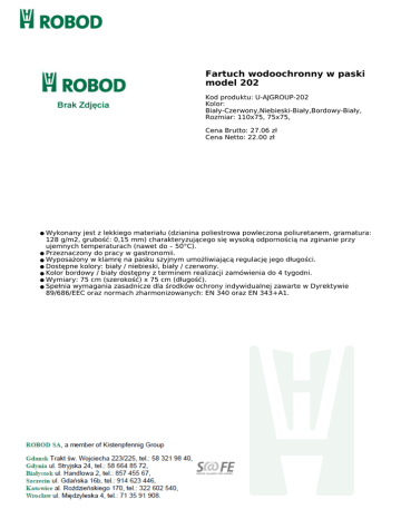 Fartuch wodoochronny w paski model 202 Kod produktu: U-AJGROUP-202 Kolor: Biały-Czerwony,Niebieski-Biały,Bordowy-Biały, Rozmiar: 110x75, 75x75, Cena Brutto: 27.06 zł Cena Netto: 22.00 zł Wykonany jest z lekkiego materiału (dzianina poliestrowa powleczona poliuretanem, gramatura: 128 g/m2, grubość: 0,15 mm) charakteryzującego się wysoką odpornością na zginanie przy ujemnych temperaturach (nawet do – 50°C). ● Przeznaczony do pracy w gastronomii. ● Wyposażony w klamrę na pasku szyjnym umożliwiającą regulację jego długości. ● Dostępne kolory: biały / niebieski, biały / czerwony. ● Kolor bordowy / biały dostępny z terminem realizacji zamówienia do 4 tygodni. ● Wymiary: 75 cm (szerokość) x 75 cm (długość). ● Spełnia wymagania zasadnicze dla środków ochrony indywidualnej zawarte w Dyrektywie 89/686/EEC oraz normach zharmonizowanych: EN 340 oraz EN 343+A1. ●