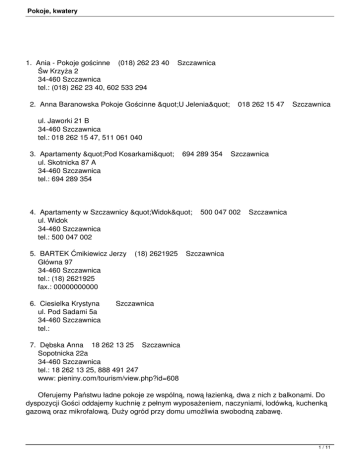 Pokoje, kwatery 1. Ania - Pokoje gościnne (018) 262 23 40 Szczawnica Św Krzyża 2 34-460 Szczawnica tel.: (018) 262 23 40, 602 533 294 2. Anna Baranowska Pokoje Gościnne "U Jelenia" 018 262 15 47 Szczawnica ul. Jaworki 21 B 34-460 Szczawnica tel.: 018 262 15 47, 511 061 040 3. Apartamenty "Pod Kosarkami" 694 289 354 Szczawnica ul. Skotnicka 87 A 34-460 Szczawnica tel.: 694 289 354 4. Apartamenty w Szczawnicy "Widok" 500 047 002 Szczawnica ul. Widok 34-460 Szczawnica tel.: 500 047 002 5. BARTEK Ćmikiewicz Jerzy (18) 2621925 Szczawnica Główna 97 34-460 Szczawnica tel.: (18) 2621925 fax.: 00000000000 6. Ciesielka Krystyna Szczawnica ul. Pod Sadami 5a 34-460 Szczawnica tel.: 7. Dębska Anna 18 262 13 25 Szczawnica Sopotnicka 22a 34-460 Szczawnica tel.: 18 262 13 25, 888 491 247 www: pieniny.com/tourism/view.php?id=608 Oferujemy Państwu ładne pokoje ze wspólną, nową łazienką, dwa z nich z balkonami. Do dyspozycji Gości oddajemy kuchnię z pełnym wyposażeniem, naczyniami, lodówką, kuchenką gazową oraz mikrofalową. Duży ogród przy domu umożliwia swobodną zabawę. 1 / 11 Pokoje, kwatery 8. Domek "Basia" Maria i Tadeusz Zachwieja 604 548 189 Szczawnica ul. Kunie 3 B 34-460 Szczawnica tel.: 604 548 189 Polecamy Państwu nasz nowootwarty domek "Basia" położony na pograniczu Popradzkiego Parku Krajobrazowego, blisko wodospadu "Zaskalnik" oraz przebiegających dwóch szlaków turystycznych na Bereśnik i Prehybę. 9. Dom Gościnny "Majerczakowie" Stefan i Madzia Majerczakowie 018 262 12 77 Szczawnica ul. Główna 103 34-460 Szczawnica tel.: 018 262 12 77, 608 345 139 Oferujemy noclegi w pokojach 2, 3 lub 4 osobowych. Wszystkie pokoje wyposażone są w łazienkę oraz tv. Dla gości udostępniamy miejsce do parkowania, mieszczace sie na terenie posesji. Warto także skorzystać z wyśmienitych warunków do grilowania, ogniska, a także wielu innych atrakcji. Przyjmujemy na kwatery zarówno pojedynczych turystów jak i zorganizowane grupy (wycieczki, kolonie, zielone szkoły). W pobliżu domu przepływa rzeczka Grajcarek, wzdłuż której wije się ścieżka rowerowo-spacerowa prowadząca do przejścia granicznego ze Słowacją. Nieopodal znajduje się także centrum Szczawnicy, kompleks wyciągów narciarskich oraz przystań flisacka. 10. Dom Gościnny "Nad Brzózkami" Piotr i Gosia Majerczakowie 018 542 41 84 Szczawnica ul. Skotnicka 6 34-460 Szczawnica tel.: 018 542 41 84, 604 210 047 11. Domki Całoroczne 0 602 59 85 16 Szczawnica ul. Szlachtowska 80a 34-460 Szczawnica tel.: 0 602 59 85 16 12. Dziedzina Elżbieta 0501 301 868 Szczawnica Główna 52 34-460 Szczawnica tel.: 0501 301 868 13. Gabryś Maria 18 262 1416 Szczawnica ul Skotnicka 25 34-460 Szczawnica tel.: 18 262 1416 Dom połozony w zacisznym miejscu,pokoje z balkonami ,obok domu parking,ogród z 2 / 11 Pokoje, kwatery miejscem na grila.Zapraszamy 14. Gębala Anna (018) 262 29 55 Szczawnica Św. Krzyża 30 34-460 Szczawnica tel.: (018) 262 29 55, 600 801 990 Pokoje z łazienkami 15. Grawicz Janina (018) 2622465 Szczawnica ul. Skotnicka 7 34-460 Szczawnica tel.: (018) 2622465 16. Halina Śliz 0 18 262 12 84 Szczawnica ul. Jana Wiktora 20a 34-460 Szczawnica tel.: 0 18 262 12 84 17. Hurkała Anna 018 2621334 Szczawnica Samorody 3 34-460 Szczawnica tel.: 018 2621334 pokoje 2 - 3 osobowe 18. Jadłodajnia i Noclegi "Łęg" 018 542 49 56 Szczawnica ul. Groń 2 34-460 Szczawnica tel.: 018 542 49 56, 506 080 064 www: szczawnica-leg.pl 19. Jendrusiak Irena 608 742 231 Szczawnica Szalaya 97 34-460 Szczawnica tel.: 608 742 231 www: szczawnica.pieniny.net./jendrusiak/ 20. Kasprzak Józef (018) 262 11 23 Szczawnica ul. Słoneczna 16 34-460 Szczawnica tel.: (018) 262 11 23, 507 440 881 Pokoje dla turystów w Szczawnicy 21. KOLIBA 18 262 1647 Szczawnica 3 / 11 Pokoje, kwatery ul Groń 3 34-460 Szczawnica tel.: 18 262 1647, 604675566 Serdecznie zapraszamy do naszego domu położonego w uzdrowiskowej miejscowości . Sąsiedztwo Pienińskiego Parku Narodowego oraz rezerwatów przyrody sprawiają, że goście naszego domu mogą wypocząć w spokojnej okolicy . 22. Korusówka (18) 262 11 02 Szczawnica Szalaya 53a 34-460 Szczawnica tel.: (18) 262 11 02 23. Kostrzewska Elżbieta 0505 104 041 Szczawnica Zielona 3 34-460 Szczawnica tel.: 0505 104 041 24. Łopatka Barbara 0-18 262-13-76 Szczawnica Pienińska 11a 34-460 Szczawnica tel.: 0-18 262-13-76 www: pieninska11.pl/ Dom położony jest w sercu uzdrowiskowych Pienin, tuż przy drodze do szlaków turystycznych prowadzących na Sokolicę, Trzy Korony oraz do przejścia granicznego ze Słowacją.Dysponujemy 10 miejscami noclegowymi w pokojach 2,3,4 - osobowych z łazienkami . 25. Madeja Jan (18) 262 1337 Szczawnica Szlachtowska 46 34-460 Szczawnica tel.: (18) 262 1337, 505 425 785 Zapraszamy na wypoczynek w górach w miejscowości Szczawnica. Nasz obiekt znajduje się w malowniczej okolicy u stóp góry Jarmuta. Oferujemy państwu 20 miejsc noclegowych w pokojach 2,3,4 osobowych z łazienką. Pokoje wyposażone są w telewizory, czajniki elektryczne oraz lodówki. Na terenie znajduje się placyk zabaw dla dzieci oraz miejsce na grilla. Nasi goście mają zapewnione bezpłatne miejsce parkingowe znajdujące się na terenie posesji. 26. Magnolia - Owsianka Piotr 509 509 737 Szczawnica Św. Krzyża 12a 34-460 Szczawnica tel.: 509 509 737 4 / 11 Pokoje, kwatery 27. Marciszewska Irena 0 18 262 11 05 Szczawnica ul. Szlaya 58 34-460 Szczawnica tel.: 0 18 262 11 05 28. MENDRALA KATARZYNA (0-18) 2621326 Szczawnica ul. Sopotnicka 22 B 34-460 Szczawnica tel.: (0-18) 2621326 spokojne miejsce 1,5 km od centrum miasta; pokoje 2,3,4 osobowe, ogrodzony parking, grill, duzy ogród. 29. Mikołajczyk Ludwika i Mikołajczyk Andrzej (18) 262 17 94 Szczawnica Połoniny 10 B 34-460 Szczawnica tel.: (18) 262 17 94, 694 97 91 22 Oferujemy Państwu pokoje 2, 3 i 4 osobowe. Gustownie urządzone pokoje z łazienkami i TV pozwolą miło spędzić wolny czas. Dom otoczony jest zielenią gdzie panuje cisza i spokój. 