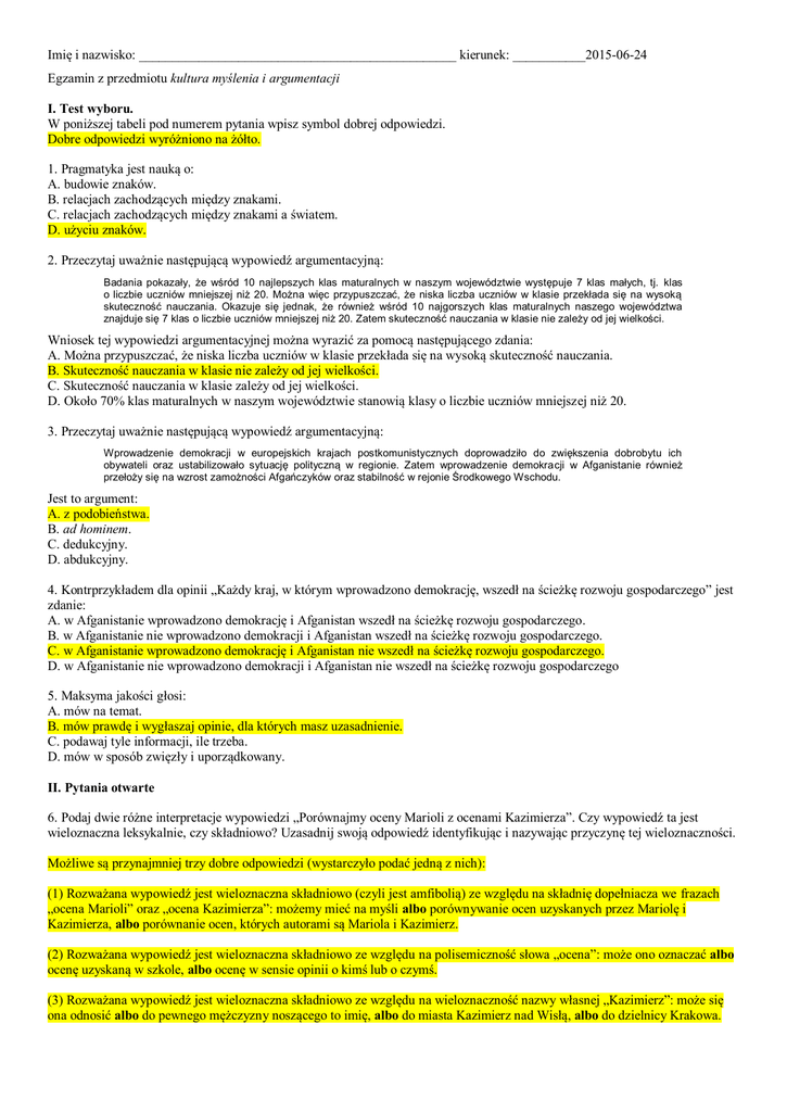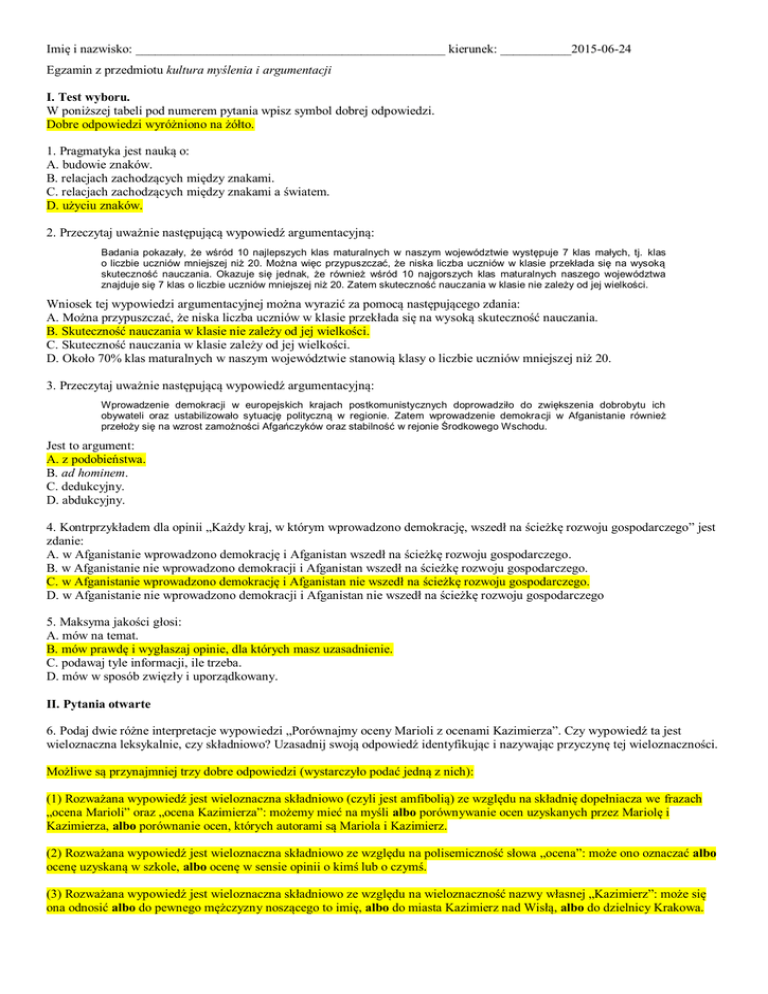 Imię i nazwisko: ________________________________________________ kierunek: ___________2015-06-24 Egzamin z przedmiotu kultura myślenia i argumentacji I. Test wyboru. W poniższej tabeli pod numerem pytania wpisz symbol dobrej odpowiedzi. Dobre odpowiedzi wyróżniono na żółto. 1. Pragmatyka jest nauką o: A. budowie znaków. B. relacjach zachodzących między znakami. C. relacjach zachodzących między znakami a światem. D. użyciu znaków. 2. Przeczytaj uważnie następującą wypowiedź argumentacyjną: Badania pokazały, że wśród 10 najlepszych klas maturalnych w naszym województwie występuje 7 klas małych, tj. klas o liczbie uczniów mniejszej niż 20. Można więc przypuszczać, że niska liczba uczniów w klasie przekłada się na wysoką skuteczność nauczania. Okazuje się jednak, że również wśród 10 najgorszych klas maturalnych naszego województwa znajduje się 7 klas o liczbie uczniów mniejszej niż 20. Zatem skuteczność nauczania w klasie nie zależy od jej wielkości. Wniosek tej wypowiedzi argumentacyjnej można wyrazić za pomocą następującego zdania: A. Można przypuszczać, że niska liczba uczniów w klasie przekłada się na wysoką skuteczność nauczania. B. Skuteczność nauczania w klasie nie zależy od jej wielkości. C. Skuteczność nauczania w klasie zależy od jej wielkości. D. Około 70% klas maturalnych w naszym województwie stanowią klasy o liczbie uczniów mniejszej niż 20. 3. Przeczytaj uważnie następującą wypowiedź argumentacyjną: Wprowadzenie demokracji w europejskich krajach postkomunistycznych doprowadziło do zwiększenia dobrobytu ich obywateli oraz ustabilizowało sytuację polityczną w regionie. Zatem wprowadzenie demokracji w Afganistanie również przełoży się na wzrost zamożności Afgańczyków oraz stabilność w rejonie Środkowego Wschodu. Jest to argument: A. z podobieństwa. B. ad hominem. C. dedukcyjny. D. abdukcyjny. 4. Kontrprzykładem dla opinii „Każdy kraj, w którym wprowadzono demokrację, wszedł na ścieżkę rozwoju gospodarczego” jest zdanie: A. w Afganistanie wprowadzono demokrację i Afganistan wszedł na ścieżkę rozwoju gospodarczego. B. w Afganistanie nie wprowadzono demokracji i Afganistan wszedł na ścieżkę rozwoju gospodarczego. C. w Afganistanie wprowadzono demokrację i Afganistan nie wszedł na ścieżkę rozwoju gospodarczego. D. w Afganistanie nie wprowadzono demokracji i Afganistan nie wszedł na ścieżkę rozwoju gospodarczego 5. Maksyma jakości głosi: A. mów na temat. B. mów prawdę i wygłaszaj opinie, dla których masz uzasadnienie. C. podawaj tyle informacji, ile trzeba. D. mów w sposób zwięzły i uporządkowany. II. Pytania otwarte 6. Podaj dwie różne interpretacje wypowiedzi „Porównajmy oceny Marioli z ocenami Kazimierza”. Czy wypowiedź ta jest wieloznaczna leksykalnie, czy składniowo? Uzasadnij swoją odpowiedź identyfikując i nazywając przyczynę tej wieloznaczności. Możliwe są przynajmniej trzy dobre odpowiedzi (wystarczyło podać jedną z nich): (1) Rozważana wypowiedź jest wieloznaczna składniowo (czyli jest amfibolią) ze względu na składnię dopełniacza we frazach „ocena Marioli” oraz „ocena Kazimierza”: możemy mieć na myśli albo porównywanie ocen uzyskanych przez Mariolę i Kazimierza, albo porównanie ocen, których autorami są Mariola i Kazimierz. (2) Rozważana wypowiedź jest wieloznaczna składniowo ze względu na polisemiczność słowa „ocena”: może ono oznaczać albo ocenę uzyskaną w szkole, albo ocenę w sensie opinii o kimś lub o czymś. (3) Rozważana wypowiedź jest wieloznaczna składniowo ze względu na wieloznaczność nazwy własnej „Kazimierz”: może się ona odnosić albo do pewnego mężczyzny noszącego to imię, albo do miasta Kazimierz nad Wisłą, albo do dzielnicy Krakowa. 7. (a) Wskaż ukrytą przesłankę (tj. entymemat) wypowiedzi argumentacyjnej z pytania 3. Następnie (b) podaj możliwą krytykę tego argumentu. (a) Ukryta przesłanka: „Aktualna sytuacja w Afganistanie jest podobna do tej, w której znajdowały się jakiś czas temu europejskie kraje postkomunistyczne” lub, krócej, „Afganistan jest podobny do europejskich krajów postkomunistycznych”. To przesłanka stwierdzająca podobieństwo: bez niej argument z pytania 3 nie byłby w ogóle argumentem z podobieństwa. (b) Krytyka argumentu: ww. wymieniona przesłanka stwierdzająca podobieństwo jest fałszywa, tj. bieżąca sytuacja w Afganistanie odbiega znacznie od tej, w której znajdowały się niedawno europejskie kraje postkomunistyczne; różnica jest istotna, gdyż dotyczy warunków umożliwiających działanie demokracji na rzecz dobrobytu. 8. Jaka, Twoim zdaniem, może być implikatura konwersacyjna wypowiedzi rozmówcy B z poniższego dialogu? A: Idziemy do kina? B: Muszę uczyć się do egzaminu. Uzasadnij swoją odpowiedź wskazując maksymę konwersacyjną, którą wykorzystuje się podczas komunikowania tej implikatury. Rozmówca B pozornie narusza maksymę stosunku, która nakazuje nam mówić na temat: na pytanie o to, czy B pójdzie z A do kina, B mówi o konieczności nauki do egzaminu. Jednak odpowiedź B jest na temat, jeśli założymy, że mówiąc „Muszą uczyć się do egzaminu” B komunikuje, że nie może pójść do kina; ta ostatnia treść (tj. „B nie może iść do kina”) jest implikaturą konwersacyjną rozważanej wypowiedzi. Innymi słowy, maksyma stosunku jest zachowana na poziomie znaczenia wtórnego (tj. implikatury konwersacyjnej) rozmówcy B.