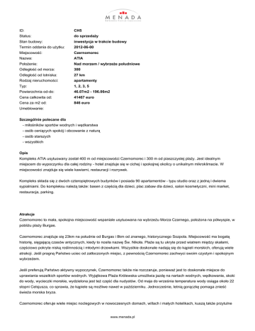 ID: CH5 Status: do sprzedaży Stan budowy: inwestycja w trakcie budowy Termin oddania do użytku: 2012-06-00 Miejscowość: Czernomorec Nazwa: ATIA Położenie: Nad morzem / wybrzeże południowe Odległość od morza: 300 Odległość od lotniska: 27 km Rodzaj nieruchomości: apartamenty Typ: 1, 2, 3, 5 Powierzchnia od-do: 46.07m2 - 196.06m2 Cena całkowita od: 41467 euro Cena za m2 od: 846 euro Umeblowanie: Szczególnie polecane dla - miłośników sportów wodnych i wędkarstwa - osób ceniących spokój i obcowanie z naturą - osób starszych - wszystkich Opis Kompleks ATIA usytuowany został 400 m od miejscowości Czernomorec i 300 m od piaszczystej plaży. Jest idealnym miejscem do wypoczynku dla całej rodziny - hotel znajduje się w cichej i spokojnej okolicy o unikalnym mikroklimacie. W miejscowości znajduje się wiele kawiarni, restauracji i rozrywek. Kompleks składa się z dwóch czteropiętrowych budynków i posiada 90 apartamentów - typu studio oraz z jedną i dwiema sypialniami. Do kompleksu należą także: basen z częścią dla dzieci, plac zabaw dla dzieci, salon kosmetyczni, mini market, restauracja, parking. Atrakcje Czernomorec to mała, spokojna miejscowość wspaniale usytuowana na wybrzeżu Morza Czarnego, położona na półwyspie, w pobliżu plaży Burgas. Czernomorec znajduje się 23km na południe od Burgas i 8km od znanego, historycznego Sozpola. Miejscowość ma bogatą historię, sięgającą czasów antycznych, kiedy to nosiła nazwę Św. Nikoła. Plaże są tu ukryte przed wiatrem między skałami, częściowo pokryte niską roślinnością i młodymi drzewkami. Wszystkie doskonale nadają się do kąpieli morskich, oferują wiele atrakcji. Jeśli pragną Państwo uciec od zatłoczonych miejsc, z pewnością Czernomorec zachwyci swoim czystym i spokojnym wybrzeżem. Jeśli preferują Państwo aktywny wypoczynek, Czernomorec także nie rozczaruje, ponieważ jest to doskonałe miejsce do uprawiania wszelkich sportów wodnych. Wyjątkowa Plaża Królewska umożliwia jazdę na nartach wodnych, wędkowanie, skoki do wody, wycieczki morskie, wydzielona jest też część dla nudystów. Od maja do września temperatura wody osiąga około 22 stopni Celsjusza, co sprawia, że kąpiele są możliwe nawet w październiku. Jednocześnie, letnią gorączkę pomaga znieść świeża morska bryza. Czernomorec oferuje wiele miejsc noclegowych w nowoczesnych domach, willach i małych hotelikach, kuszą także przytulne www.menada.pl restauracje. Większość z nich znajduje się na brzegu morza, ma wspaniałą, romantyczną panoramę na ostatnie promienie zachodzącego słońca delikatnie oświetlające skały. Na dużą uwagę zasługują także knajpki na ulicy Trades. Tutejsze tradycyjne tawerny tworzą specjalną atmosferę miejscowości. Lokalne restauracje proponują urozmaicone program artystyczne, wyborne drinki i pyszne posiłki przygotowywane przez prawdziwych mistrzów kuchni.   Cechy Dlaczego warto? Interesująca lokalizacja - kompleks usytuowany w cichej, spokojnej okolicy Doskonałe miejsce dla całej rodziny Cechy: Basen Plac zabaw dla dzieci Mini market Restauracja Parking Całodobowa ochrona Usługi Roczna opłata za zarządzanie do uzgodnienia z deweloperem. Nasza firma również dba o utrzymanie apartamentu w ciągu roku - Dla naszych Klientów zapewniamy utrzymanie nieruchomości, ochronę 24h przez cały rok, oświetlenie, bezpieczeństwo elektryczne i wodne, naprawy, sprzątanie i czyszczenie części wspólnych, zieleni, czyszczenie apartamentu czy też płatności rachunków. Uzyskiwanie dodatkowych dochodów z ewentualnego wynajmu apartamentu - Zapewniamy bowiem również organizację wynajmu apartamentu.   Zasady płatności Plan płatności Indywidualnie dostosowany do możliwości klienta. Koszty: Należy pamiętać, iż oprócz ceny za nieruchomość dochodzi koszt związany z opłatą notarialną u Notariusza (jest to www.menada.pl maksymalnie 3,5 - 4,5 % wartości zakupu). www.menada.pl
