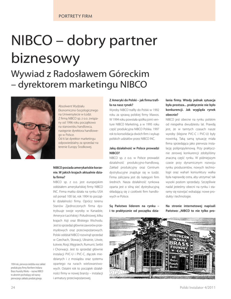 PORTRETY FIRM NIBCO – dobry partner biznesowy Wywiad z Radosławem Góreckim – dyrektorem marketingu NIBCO Absolwent Wydziału Ekonomiczno-Socjologicznego na Uniwersytecie w Łodzi. Z firmą NIBCO sp. z o.o. związany od 1996 roku początkowo na stanowisku handlowca, następnie dyrektora handlowego w Polsce. Od 6 lat dyrektor marketingu odpowiedzialny za sprzedaż na terenie Europy Środkowej. 1904 rok, pierwsza siedziba oraz zakład produkcyjny firmy Northern Indiana Brass Foundry Works – nazwa NIBCO to akronim pochodzący od nazwy pierwszego zakładu produkcyjnego. 24 NIBCO posiada amerykańskie korzenie. W jakich krajach aktualnie działa firma? NIBCO sp. z o.o. jest europejskim oddziałem amerykańskiej firmy NIBCO INC. Firma matka działa na rynku USA od ponad 100 lat, rok 1904 to początki działalności firmy. Oprócz terenu Stanów Zjednoczonych firma dystrybuuje swoje wyroby w Kanadzie, Ameryce Łacińskiej i Południowej, kilku krajach Azji oraz Bliskiego Wschodu. Jest to sprzedaż głównie zaworów przemysłowych oraz przeciwpożarowych. Polski oddział NIBCO rozwinął sprzedaż w Czechach, Słowacji, Ukrainie, Litwie, Łotwie, Rosji, Węgrzech, Rumunii, Serbii i Chorwacji. Jest to sprzedaż głównie instalacji PVC-U i PVC-C, złączek miedzianych i z mosiądzu oraz systemu opartego na rurach wielowarstwowych. Ostatni rok to początek działalności firmy w nowej branży – instalacji i armatury przeciwpożarowej. Jaką działalność w Polsce prowadzi NIBCO? NIBCO sp. z o.o. w Polsce prowadzi działalność produkcyjno-handlową. Zakład produkcyjny oraz Centrum dystrybucyjne znajduje się w Łodzi. Firma zaliczana jest do kategorii firm średnich. Nasza działalność rynkowa oparta jest o silną sieć dystrybucyjną składającą się z czołówki firm handlowych w Polsce. łania firmy. Wtedy jednak sytuacja była prostsza... praktycznie nie było konkurencji. Jak wygląda rynek obecnie? NIBCO jest obecne na rynku polskim od niespełna dwudziestu lat. Prawdą jest, że w tamtych czasach nasze wyroby (klejone PVC-C i PVC-U) były nowinką. Taką samą sytuację miała firma sprzedająca jako pierwsza instalację polipropylenową. Przy praktycznie zerowej konkurencji zdobyliśmy znaczną część rynku. W późniejszym czasie przy dynamicznym rozwoju rynku producentów, nowych technologii oraz wahań koniunktury walka była naprawdę ostra, aby utrzymać tak wysoki poziom sprzedaży. Szczęśliwie nadal jesteśmy obecni na rynku i staramy się rozwijać wdrażając nowe produkty i technologie. Są Państwo liderem na rynku – i to praktycznie od początku dzia- Na stronie internetowej napisali Państwo: „NIBCO to nie tylko pro- Z Ameryki do Polski – jak firma trafiła na nasz rynek? Wyroby NIBCO trafiły do Polski w 1992 roku za sprawą polskiej firmy Mawos. W 1994 roku powstała spółka joint venture NIBCO Marketing, a w 1995 roku część produkcyjna NIBCO Polska. 1997 rok to konsolidacja dwóch firm i wykup polskich udziałów przez NIBCO INC. Polski Instalator 4/2011 PORTRETY FIRM dukt, to także pomoc projektowa, obsługa techniczna w czasie trwania inwestycji oraz po jej zakończeniu, to wieloletnie doświadczenie, to filozofia, w której najważniejszy jest klient.” W jaki sposób opiekują się Państwo swoim klientem. Kto jest dla Państwa podstawowym klientem? To prawda. Dla nas nie jest to slogan reklamujący naszą firmę ale naprawdę staramy się być dobrym partnerem biznesowym dla naszych klientów. Świadczy o tym fakt, że z dużą częścią naszych klientów współpracujemy od początku. Należą do nich małe, średnie firmy dystrybucyjne jak również główne sieci hurtowe, obsługujemy również sektor marketów budowlanych. Naszym klientem jest każdy, kto patrzy na biznes w perspektywie dłuższej niż tylko jednorazowy deal. Jak aktualnie realizowane są zamówienia dla klientów? Po dwudziestu latach dopracowaliśmy system realizacji zamówień tych standardowych, jak i tych „na zapalenie płuc” do przyzwoitego poziomu. Zadowolenie naszych klientów oraz naszego serwisu badamy za pomocą wskaźnika OTC (on time complete), którego średnioroczna wartość to 98%. Realizujemy również zamówienia na produkty „specyficzne” dla naszego rynku, a znajdujące się w bardzo szerokiej ofercie NIBCO INC. Okres realizacji takiego zamówienia jest zdecydowanie dłuższy, niż w przypadku standardowych wysyłek. Jakie są plany NIBCO na przyszłość? Czy zostały jakieś rynki do podbicia? Czy może skupią się Państwo na dalszym rozwoju na już opanowanych rynkach? Nigdy nie można powiedzieć, że dany rynek jest opanowany i nie ma nic do poprawienia lub rozwoju. Mamy naprawdę dużo pracy nad rozwojem i utrzymaniem naszej sieci dystrybucji w krajach, w których już jesteśmy obecni. Dodajemy do oferty nowe produkty, a także rozpoczynamy ekspansję w całkowicie dla nas nowej branży, instalacji przeciwpożarowych, korzystając z długoletnich doświadczeń firmy matki. NIBCO INC jest jednym z czołowych producentów zaworów przeciwpożarowych na świecie. Obecnie jesteśmy na etapie budowania centrum dystrybucyjnego na potrzeby rynku europejskiego. Zawory do zastosowań przeciwpożarowych – nowy asortyment w ofercie NIBCO sp z o.o. Dziękuję bardzo za rozmowę. ■ (rozmawiał Radosław Wroński) Siedziba NIBCO INC w Elkhart, USA Polski Instalator 4/2011 25