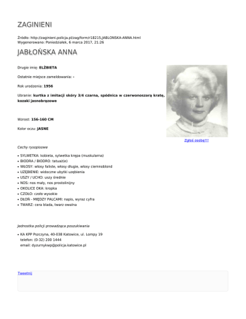 ZAGINIENI Źródło: http://zaginieni.policja.pl/zag/form/r18215,JABLONSKA-ANNA.html Wygenerowano: Poniedziałek, 6 marca 2017, 21:26 JABŁOŃSKA ANNA Drugie imię: ELŻBIETA Ostatnie miejsce zameldowania: Rok urodzenia: 1956 Ubranie: kurtka z imitacji skóry 3/4 czarna, spódnica w czerwonoszarą kratę, kozaki jasnobrązowe Wzrost: 156-160 CM Kolor oczu: JASNE Zgłoś osobę!!! Cechy rysopisowe ● SYLWETKA: kobieta, sylwetka krępa (muskularna) ● BIODRA / BIODRO: tatuaż(e) ● WŁOSY: włosy faliste, włosy długie, włosy ciemnoblond ● UZĘBIENIE: widoczne ubytki uzębienia ● USZY / UCHO: uszy średnie ● NOS: nos mały, nos prostolinijny ● OKOLICE OKA: kropka ● CZOŁO: czoło wysokie ● DŁOŃ - MIĘDZY PALCAMI: napis, wyraz cyfra ● TWARZ: cera blada, twarz owalna Jednostka policji prowadząca poszukiwania ● KA KPP Pszczyna, 40-038 Katowice, ul. Lompy 19 telefon: (0-32) 200 1444 email: [email protected] Tweetnij