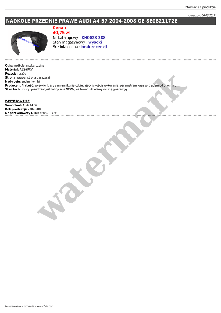Informacje o produkcie Utworzono 06-03-2017 NADKOLE PRZEDNIE PRAWE AUDI A4 B7 2004-2008 OE 8E0821172E Cena : 40,75 zł Nr katalogowy : KH0028 388 Stan magazynowy : wysoki Średnia ocena : brak recenzji w at ZASTOSOWANIE Samochód: Audi A4 B7 Rok produkcji: 2004-2008 Nr porównawczy OEM: 8E0821172E er m ar k Opis: nadkole antykorozyjne Materiał: ABS+PCV Pozycja: przód Strona: prawa (strona pasażera) Nadwozie: sedan, kombi Producent / jakość: wysokiej klasy zamiennik, nie odbiegający jakością wykonania, parametrami oraz wyglądem od oryginału Stan techniczny: przedmiot jest fabrycznie NOWY, na towar udzielamy roczną gwarancję Wygenerowano w programie www.oscGold.com