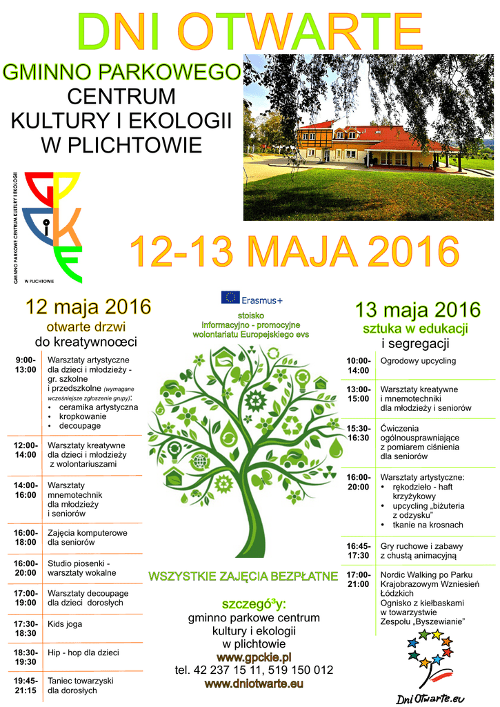 DNI OTWARTE GMINNO PARKOWEGO CENTRUM KULTURY I EKOLOGII W PLICHTOWIE 12-13 MAJA 2016 12 maja 2016 otwarte drzwi do kreatywnoœci 9:0013:00 stoisko informacyjno - promocyjne wolontariatu Europejskiego evs Warsztaty artystyczne dla dzieci i młodzieży gr. szkolne i przedszkolne (wymagane wcześniejsze zgłoszenie grupy): ź ceramika artystyczna ź kropkowanie ź decoupage 12:0014:00 Warsztaty kreatywne dla dzieci i młodzieży z wolontariuszami 14:0016:00 Warsztaty mnemotechnik dla młodzieży i seniorów 16:0018:00 Zajęcia komputerowe dla seniorów 16:0020:00 Studio piosenki warsztaty wokalne 17:0019:00 Warsztaty decoupage dla dzieci dorosłych 17:3018:30 Kids joga 18:3019:30 Hip - hop dla dzieci 19:4521:15 Taniec towarzyski dla dorosłych WSZYSTKIE ZAJĘCIA BEZPŁATNE szczegó³y: gminno parkowe centrum kultury i ekologii w plichtowie www.gpckie.pl tel. 42 237 15 11, 519 150 012 www.dniotwarte.eu 13 maja 2016 sztuka w edukacji i segregacji 10:0014:00 Ogrodowy upcycling 13:0015:00 Warsztaty kreatywne i mnemotechniki dla młodzieży i seniorów 15:3016:30 Ćwiczenia ogólnousprawniające z pomiarem ciśnienia dla seniorów 16:0020:00 Warsztaty artystyczne: ź rękodzieło - haft krzyżykowy ź upcycling „biżuteria z odzysku” ź tkanie na krosnach 16:4517:30 Gry ruchowe i zabawy z chustą animacyjną 17:0021:00 Nordic Walking po Parku Krajobrazowym Wzniesień Łódzkich Ognisko z kiełbaskami w towarzystwie Zespołu „Byszewianie”
